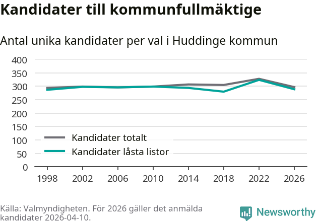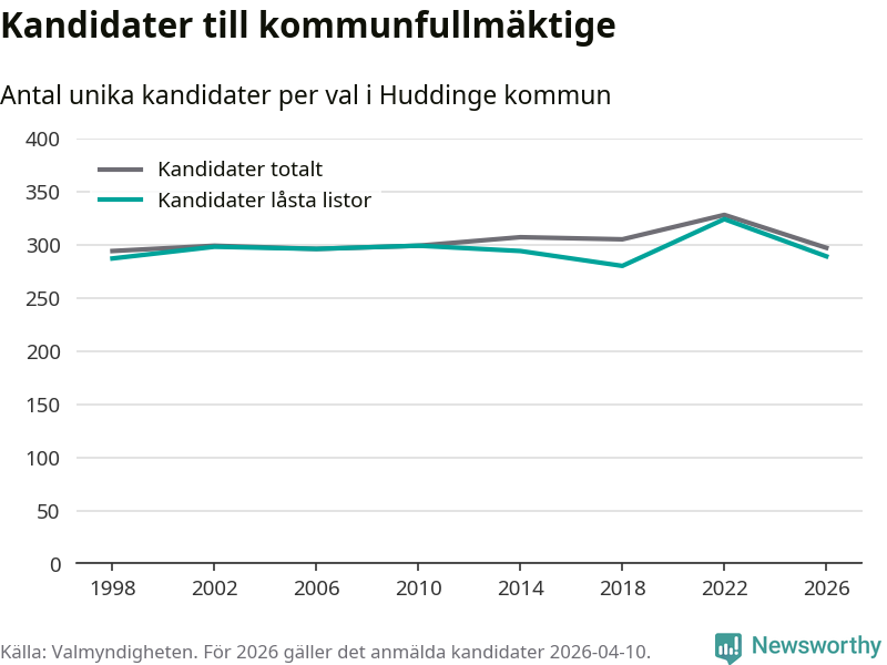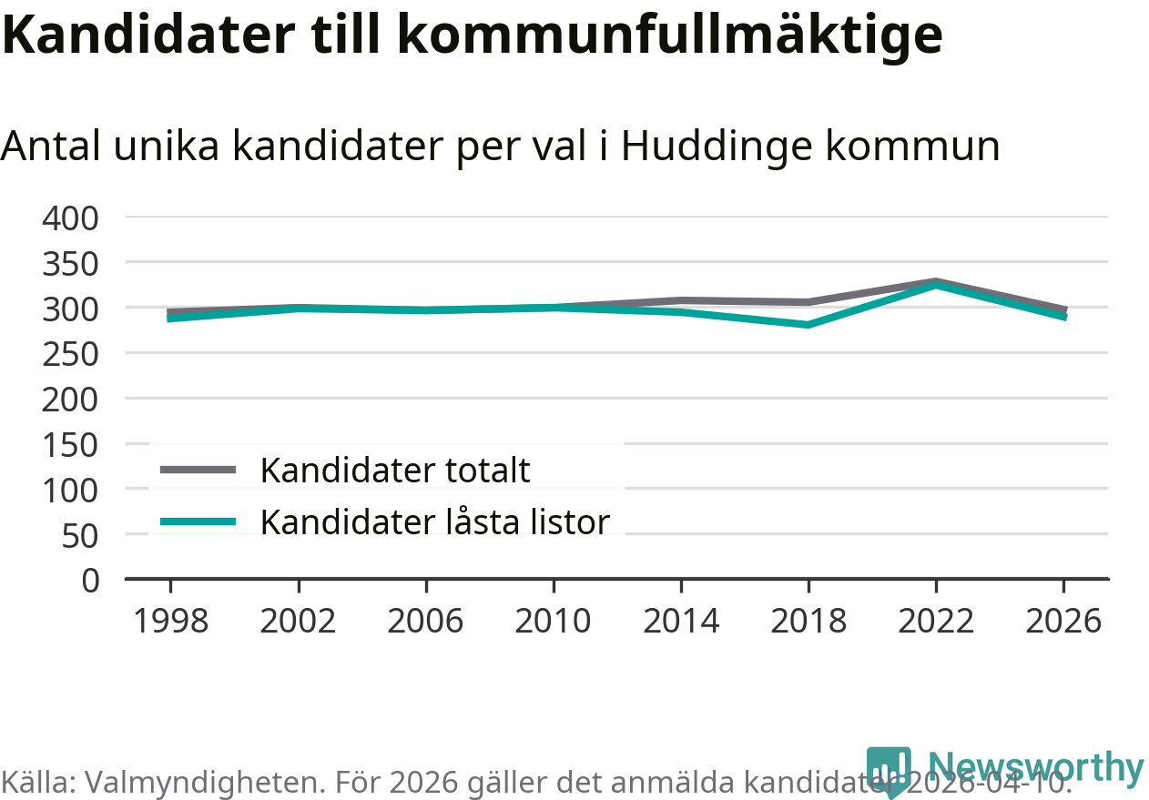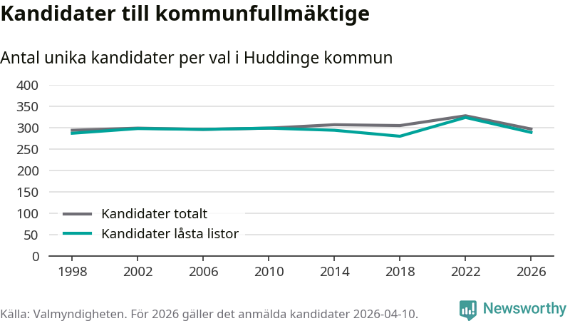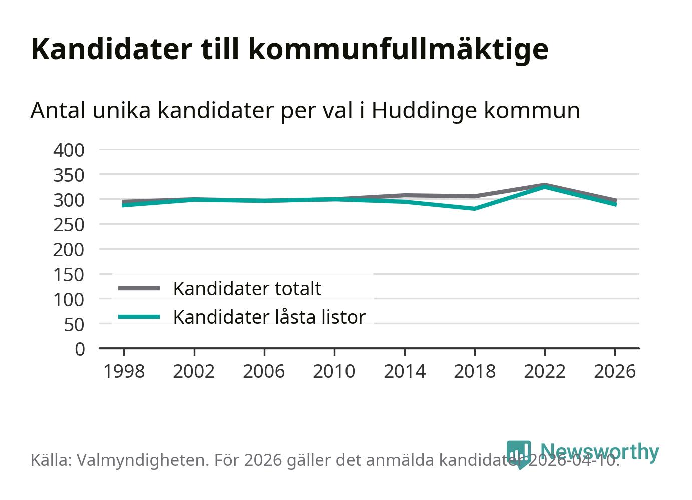 På torsdagen var det deadline för partier med låsta listor att registrera sina kandidater inför höstens val. Till valet till kommunfullmäktige i Huddinge är 289 kandidater anmälda på sådana listor, vilket är 35 färre än i valet 2022.