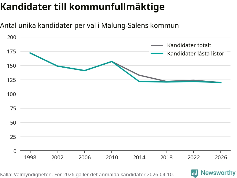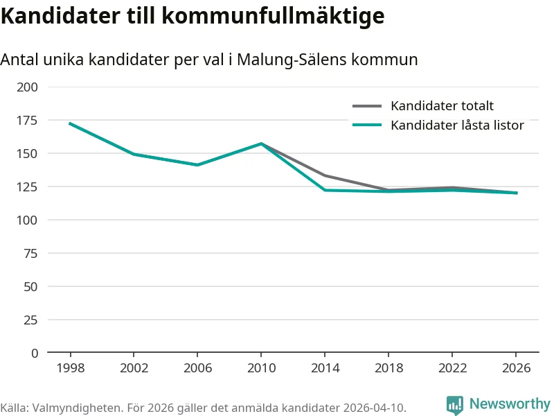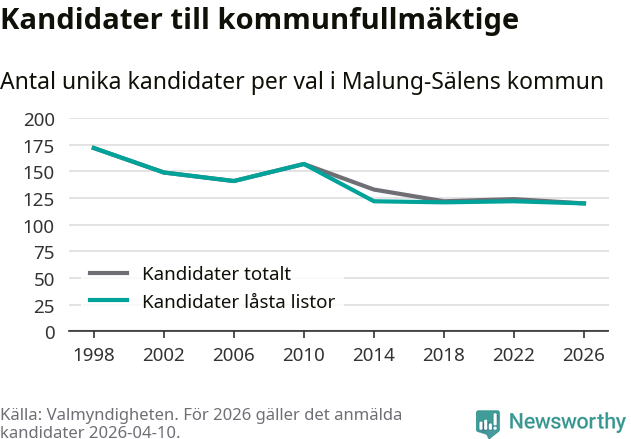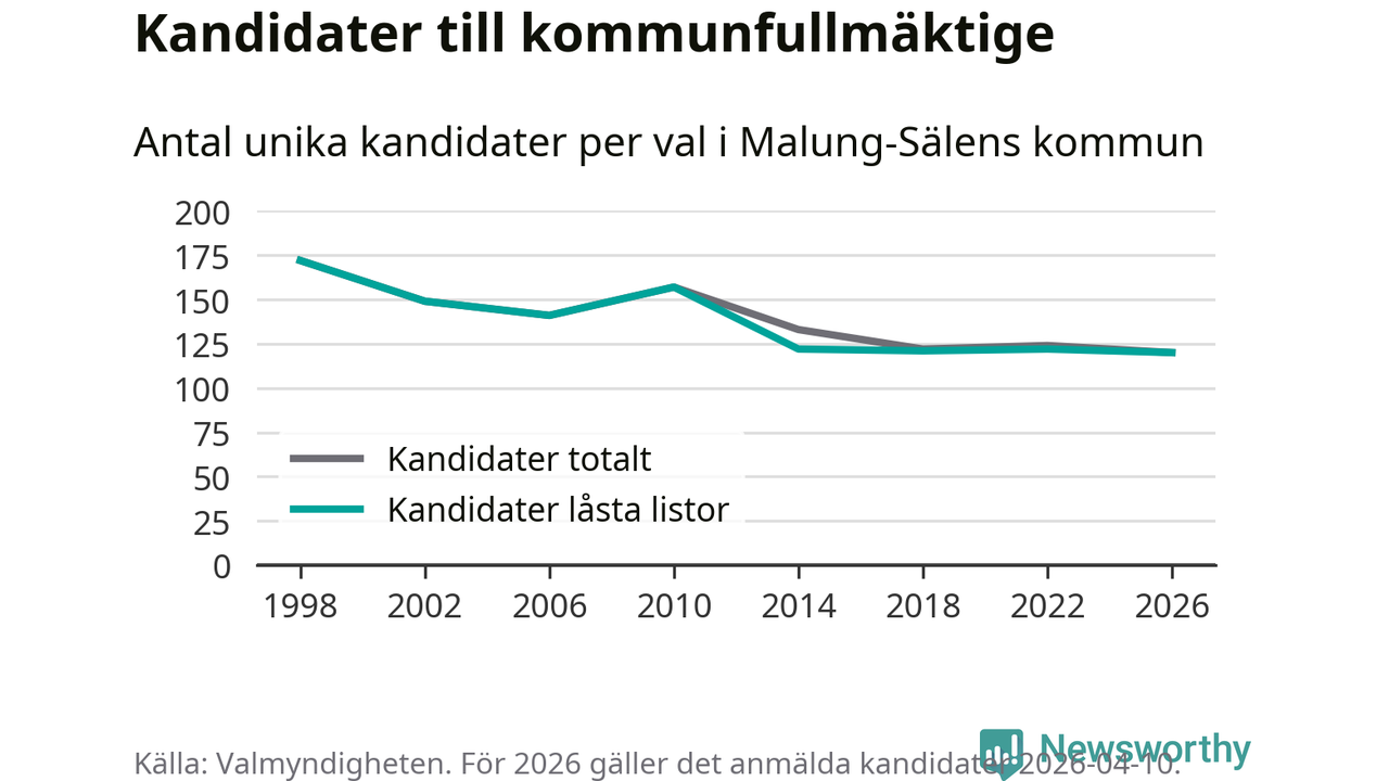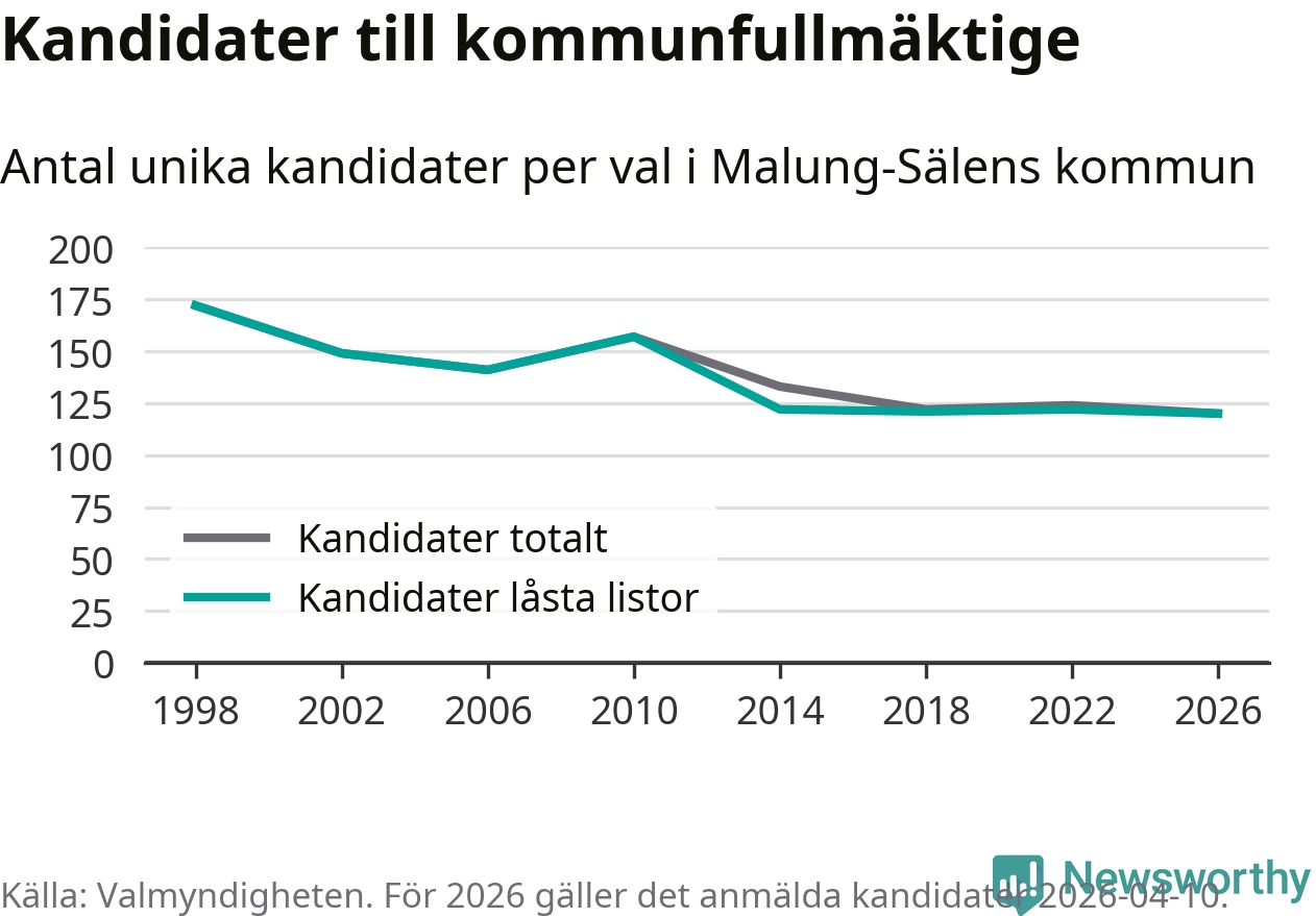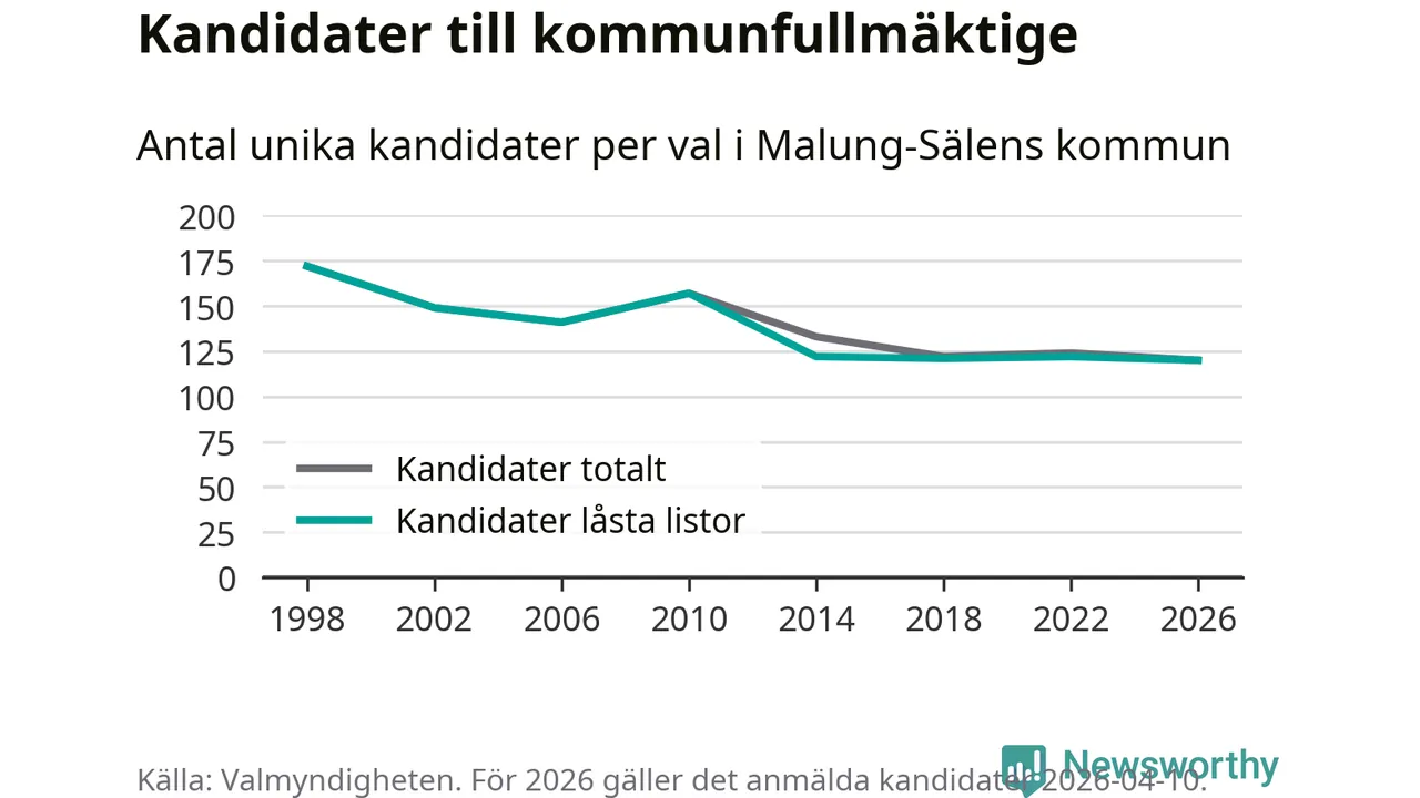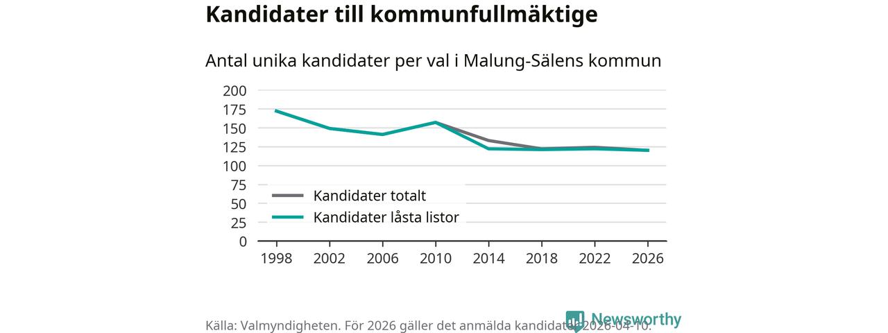 På torsdagen var det deadline för partier med låsta listor att registrera sina kandidater inför höstens val. Till valet till kommunfullmäktige i Malung-Sälen är 120 kandidater anmälda på sådana listor, vilket är två färre än i valet 2022. Det är den lägsta siffran sedan åtminstone valet 1998, vilket är så långt tillbaka som vi har statistik för.