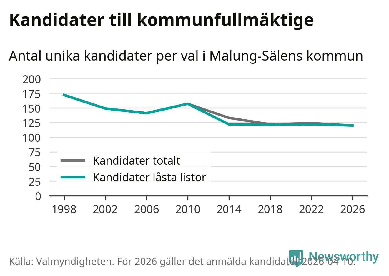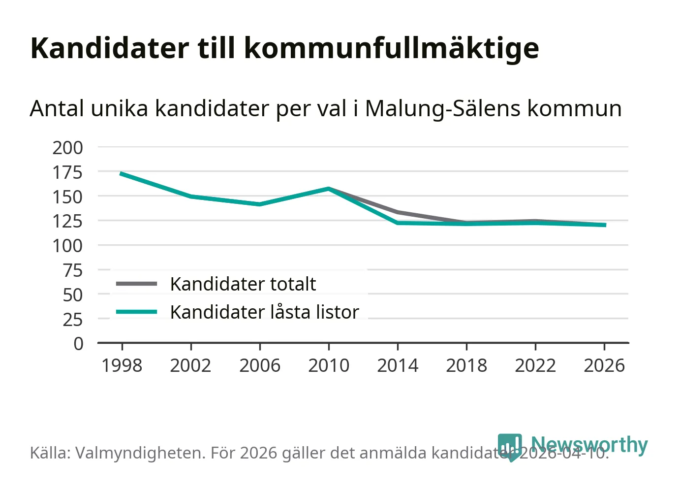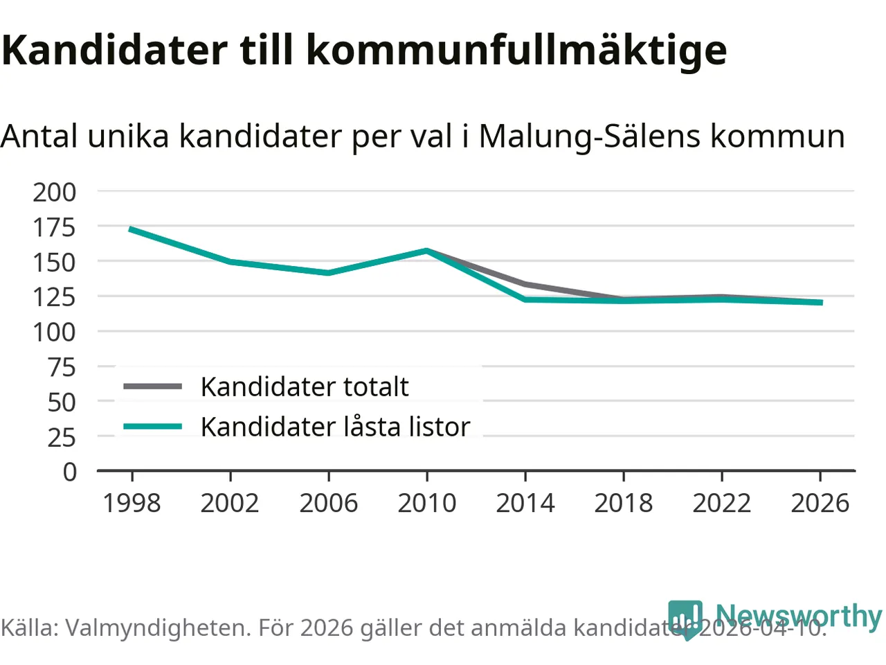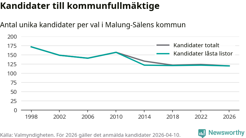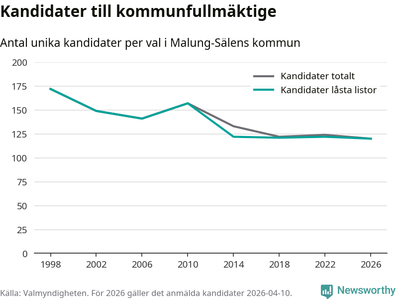 På torsdagen var det deadline för partier med låsta listor att registrera sina kandidater inför höstens val. Till valet till kommunfullmäktige i Malung-Sälen är 120 kandidater anmälda på sådana listor, vilket är två färre än i valet 2022. Det är den lägsta siffran sedan åtminstone valet 1998, vilket är så långt tillbaka som vi har statistik för.