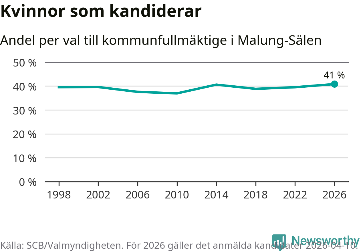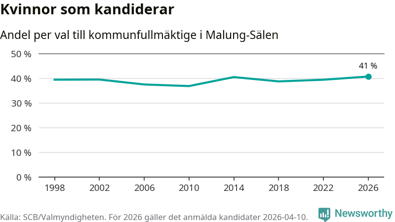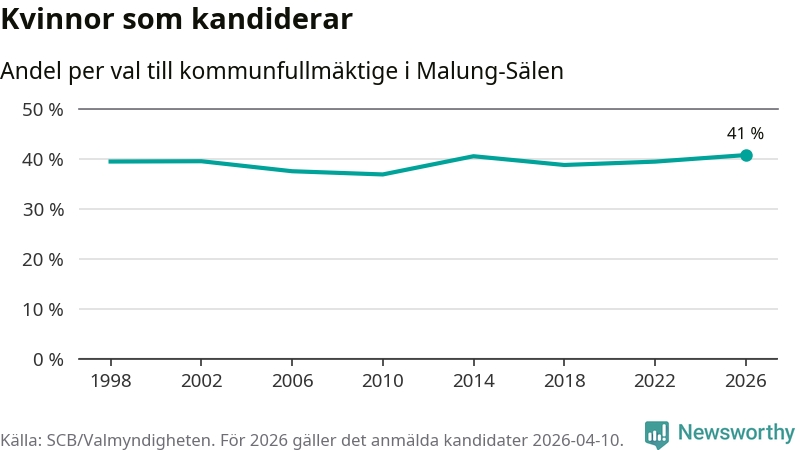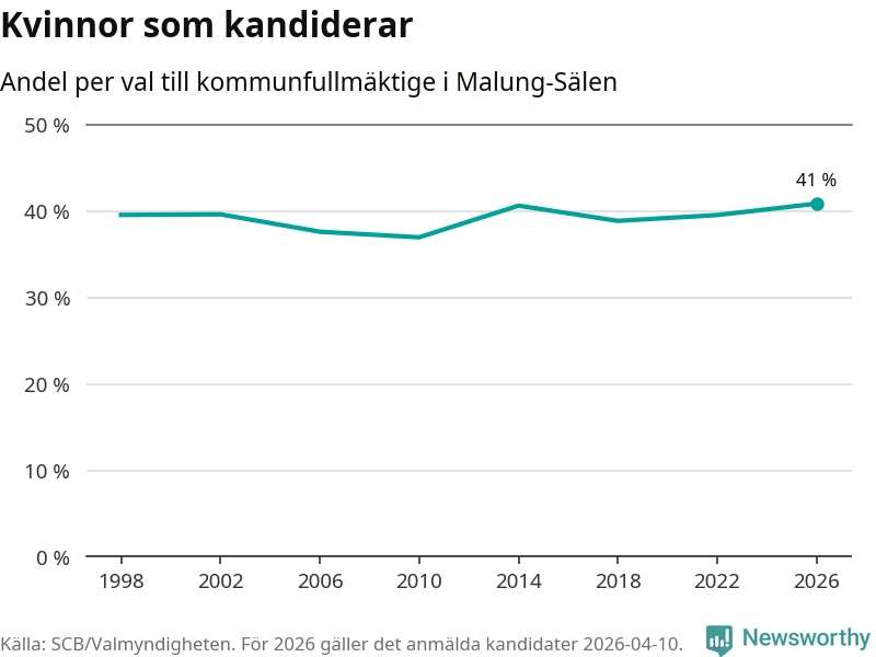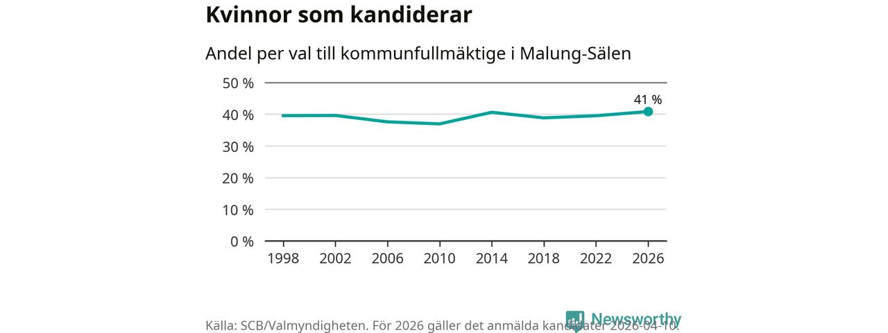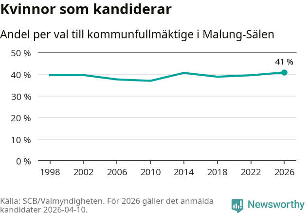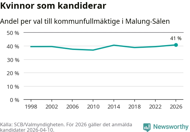 Kvinnorna utgör 41 procent av de hittills anmälda kandidaterna, vilket är den högsta andelen på listorna till kommunfullmäktige i Malung-Sälen sedan åtminstone valet 1998. Malung-Sälen är en av 264 kommuner i landet där männen utgör en majoritet av kandidaterna på listorna.