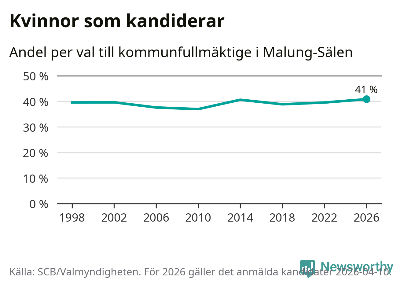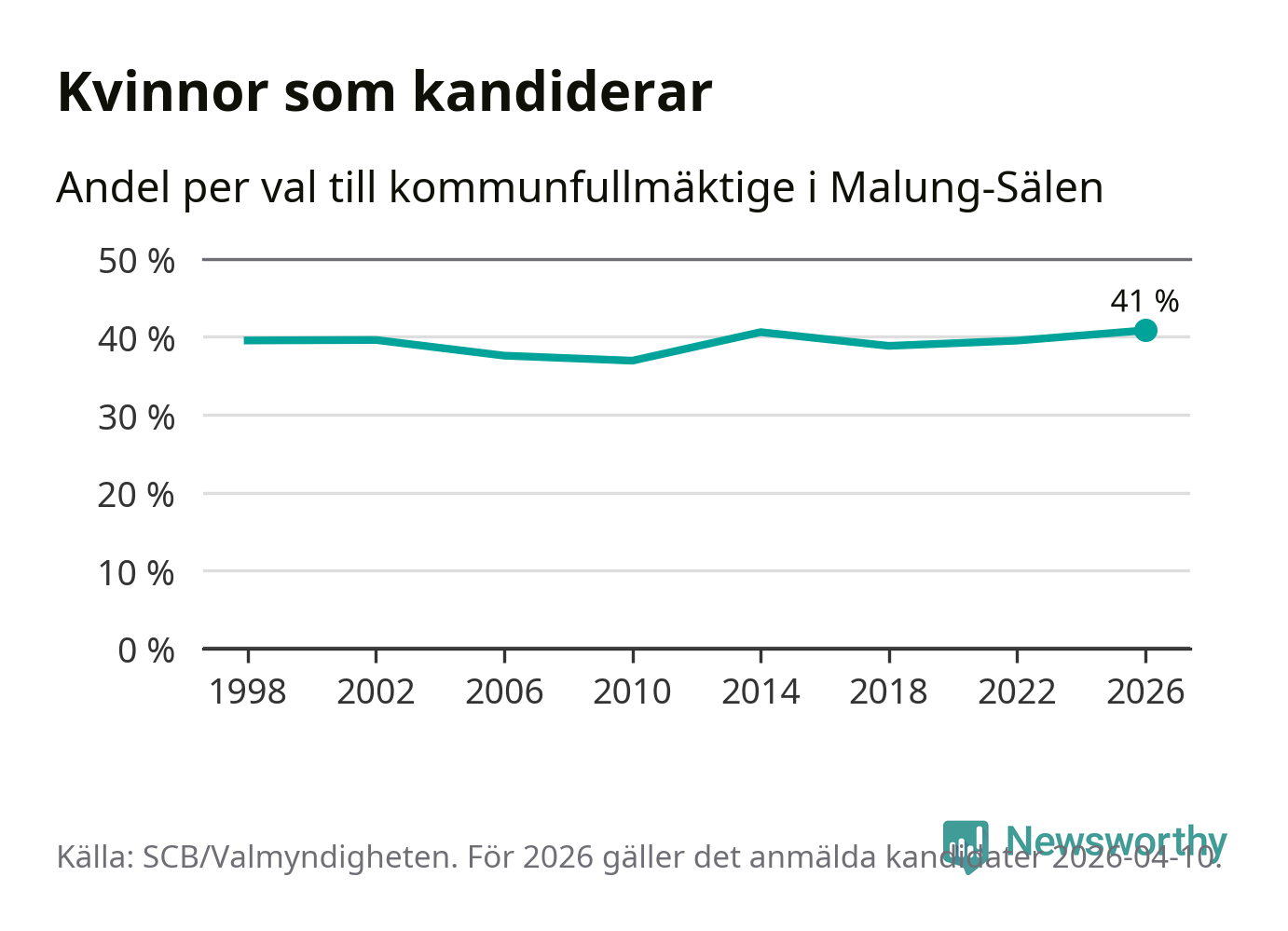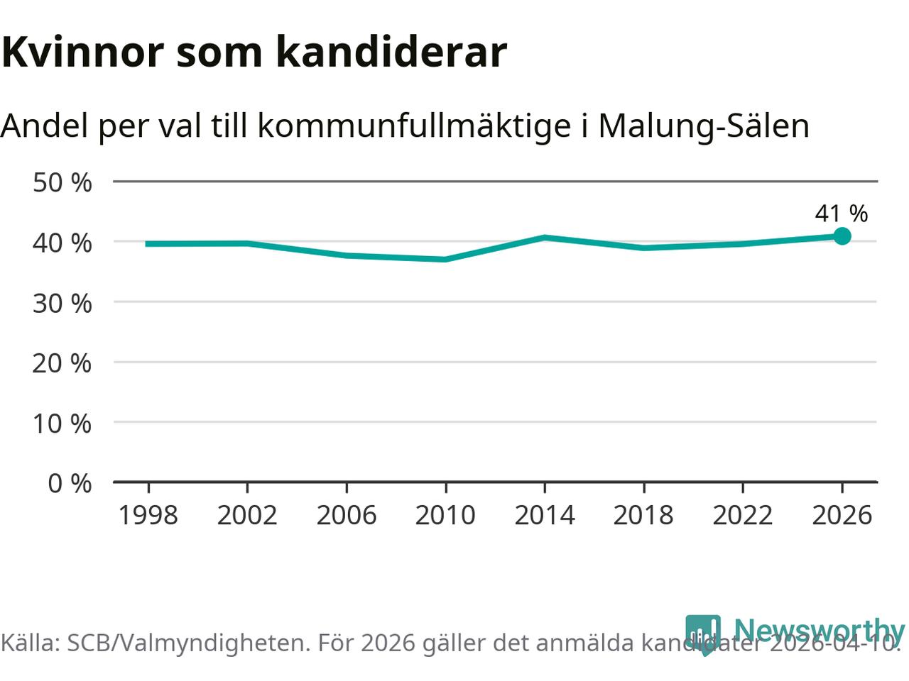 Kvinnorna utgör 41 procent av de hittills anmälda kandidaterna, vilket är den högsta andelen på listorna till kommunfullmäktige i Malung-Sälen sedan åtminstone valet 1998. Malung-Sälen är en av 264 kommuner i landet där männen utgör en majoritet av kandidaterna på listorna.