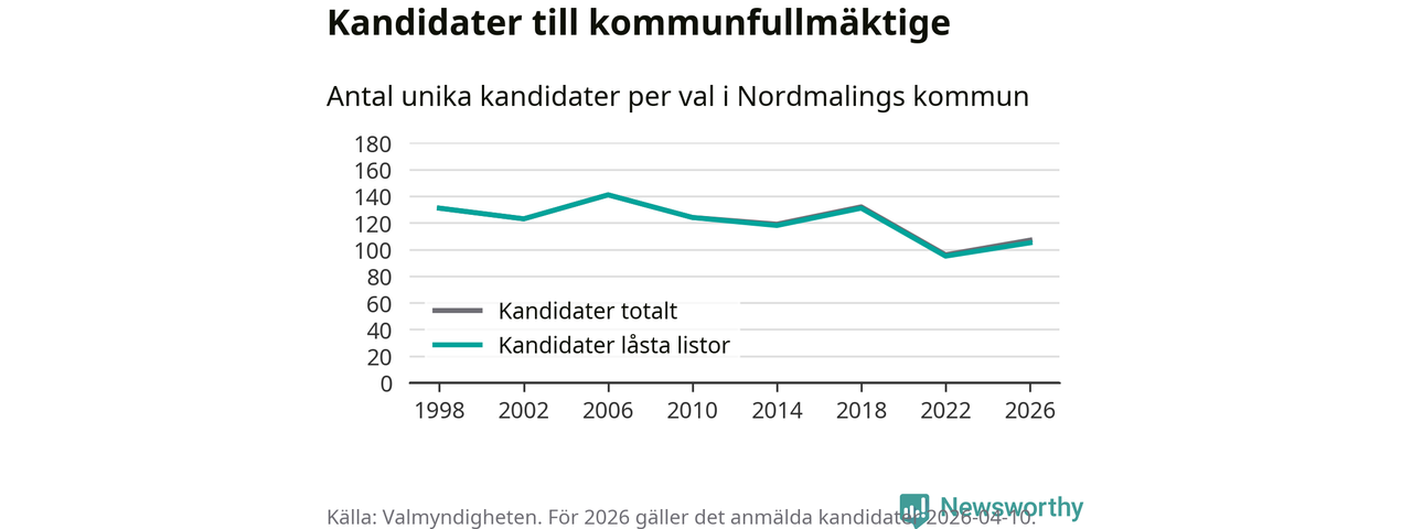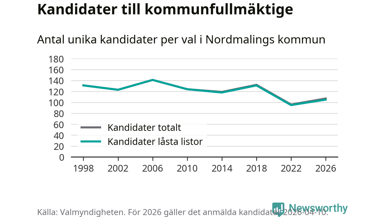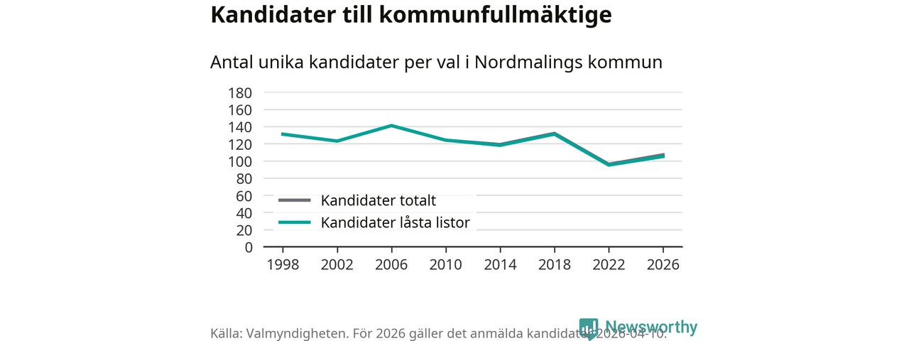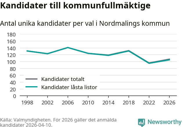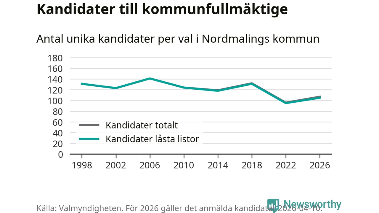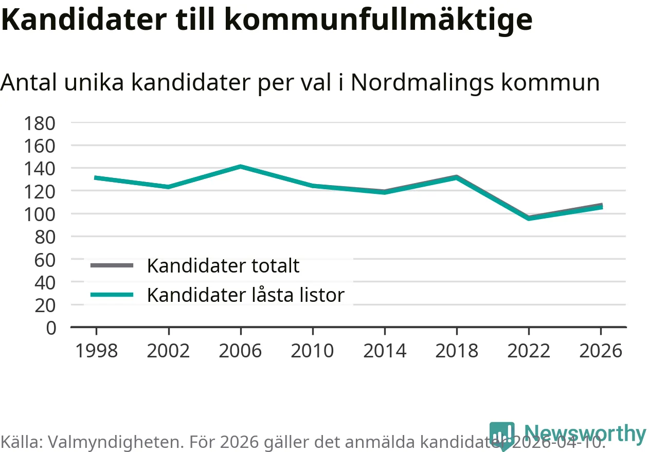 På torsdagen var det deadline för partier med låsta listor att registrera sina kandidater inför höstens val. Till valet till kommunfullmäktige i Nordmaling är 105 kandidater anmälda på sådana listor, vilket är tio fler än i valet 2022.
