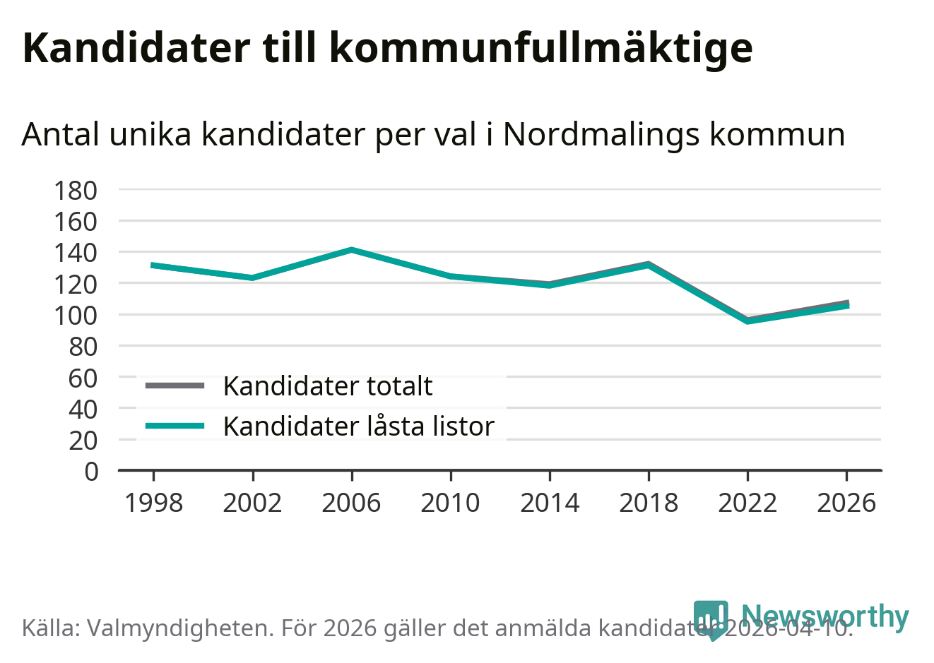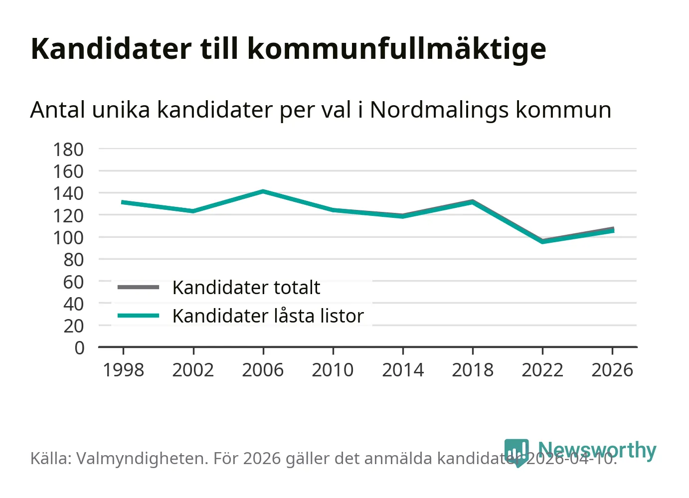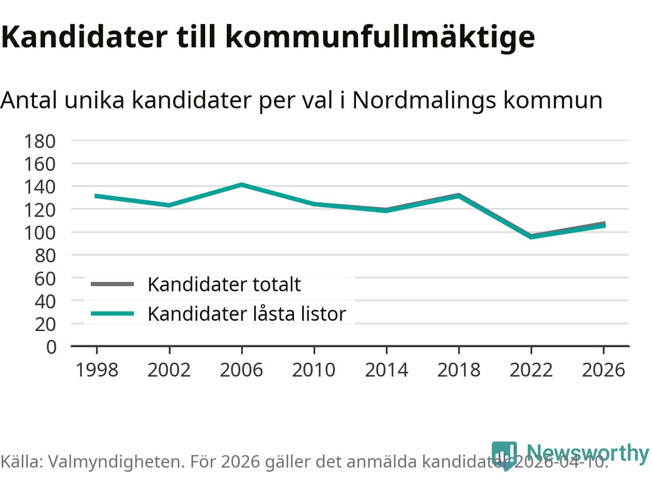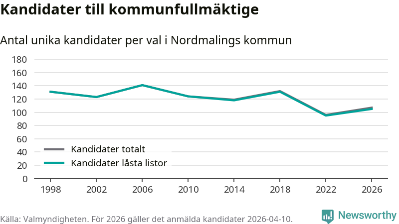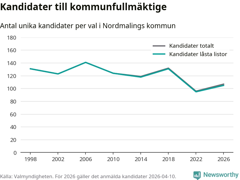 På torsdagen var det deadline för partier med låsta listor att registrera sina kandidater inför höstens val. Till valet till kommunfullmäktige i Nordmaling är 105 kandidater anmälda på sådana listor, vilket är tio fler än i valet 2022.