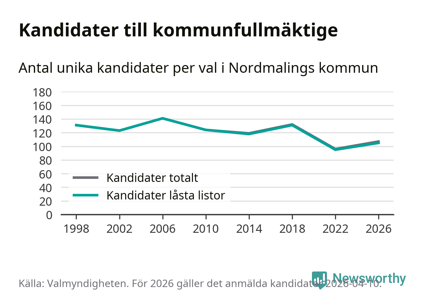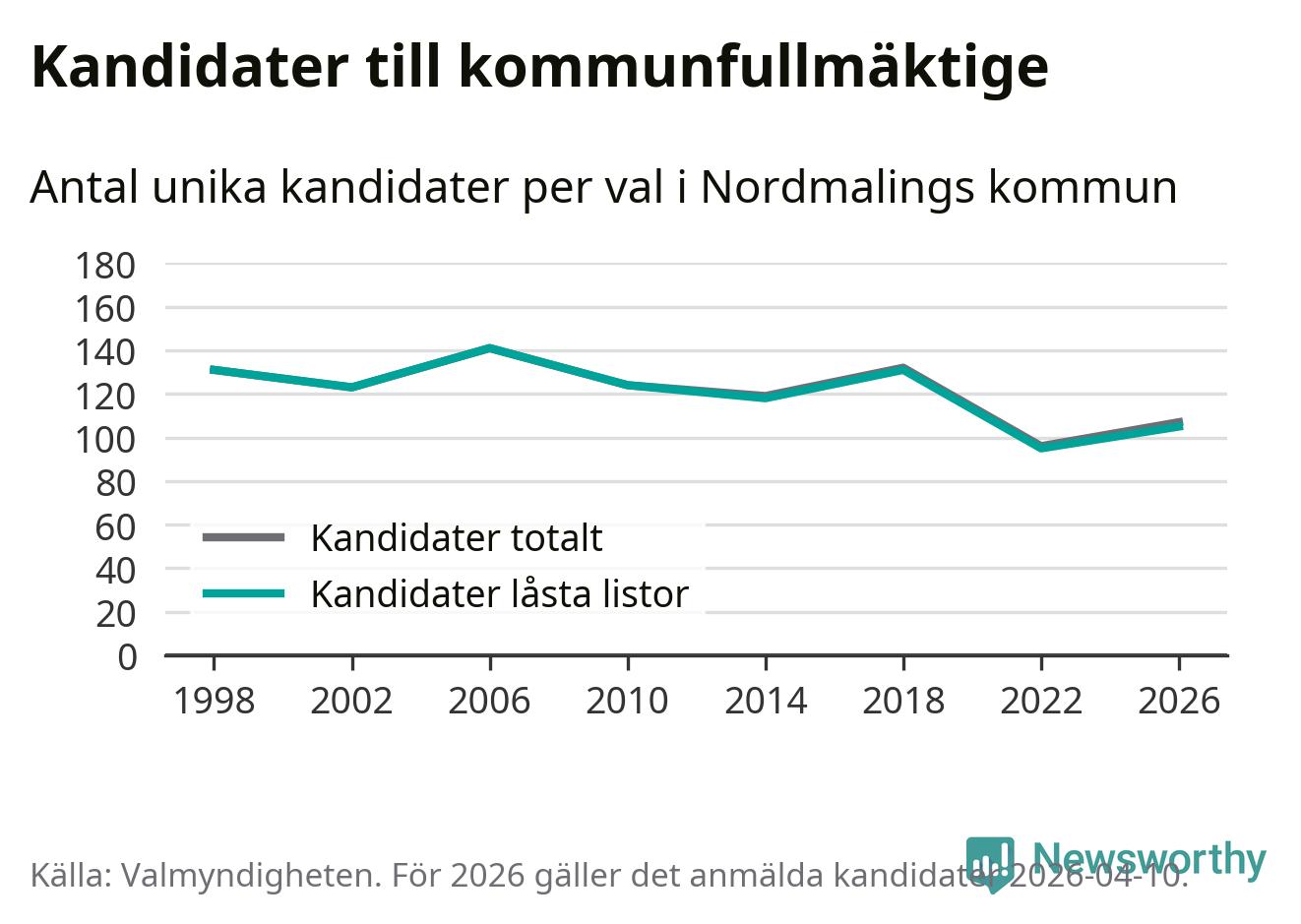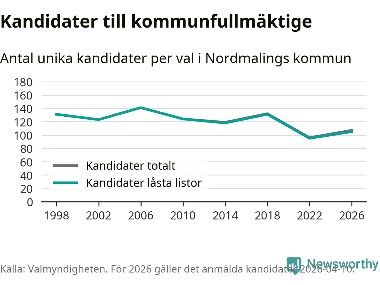 Att listan är låst innebär att partiet redan har anmält sina kandidater och bestämt ordningen på listan och att väljare inte kan lägga till egna kandidater. På öppna listor kan kandidater läggas till fram till dagarna före valet och vem som helst kan anmäla sig som kandidat. De senaste valen har drygt nio av tio kandidater anmälts på låsta listor. I valet till kommunfullmäktige i Nordmaling 2022 fanns i princip alla kandidater på låsta listor. Hittills i år finns två kandidater på öppna listor. Totalt rör det sig alltså om 107 kandidater till höstens val.