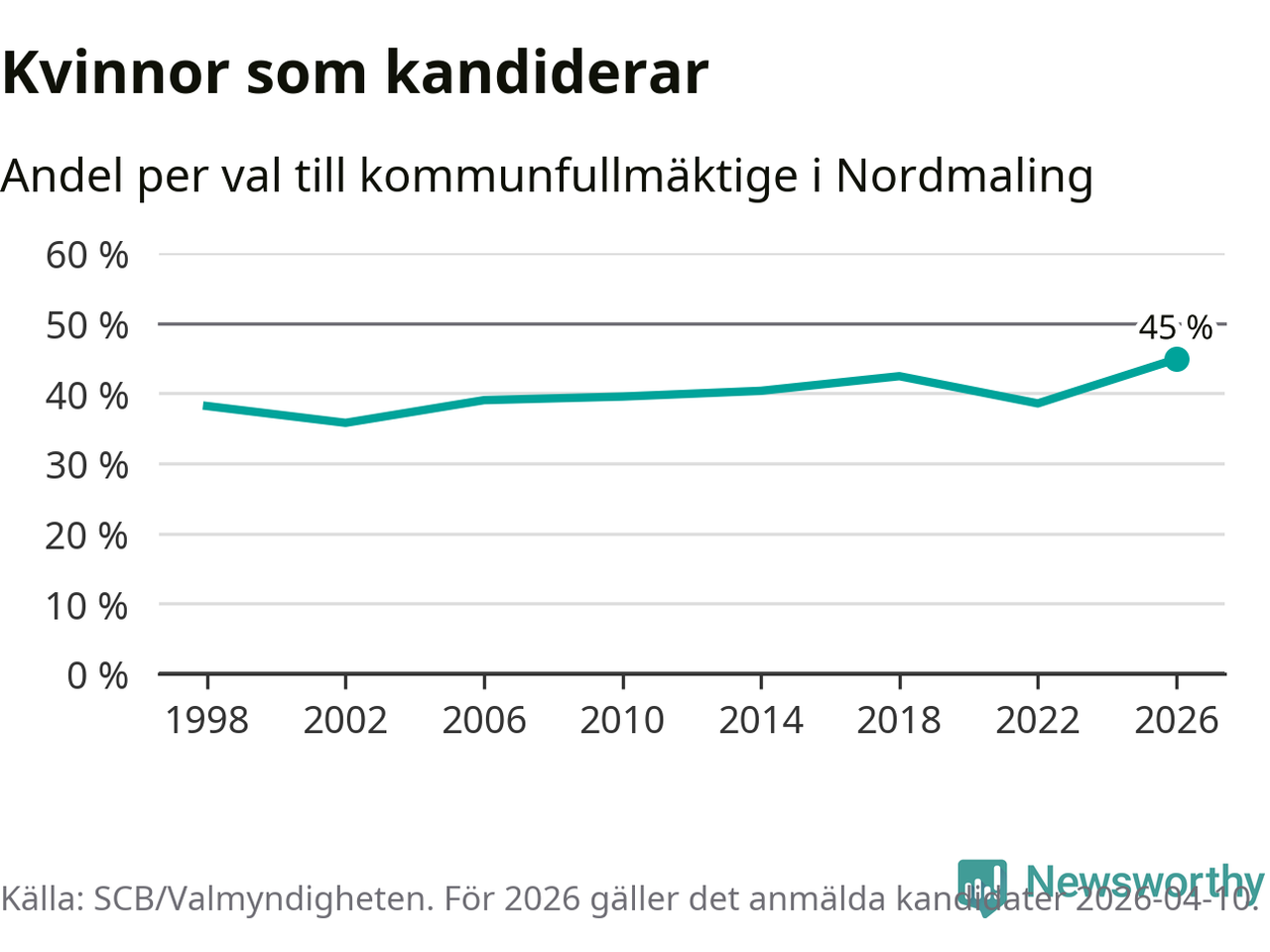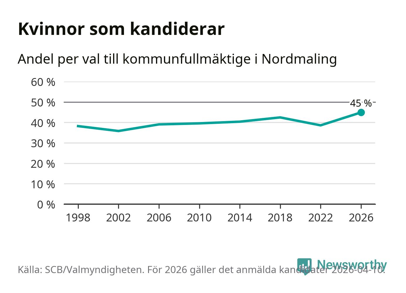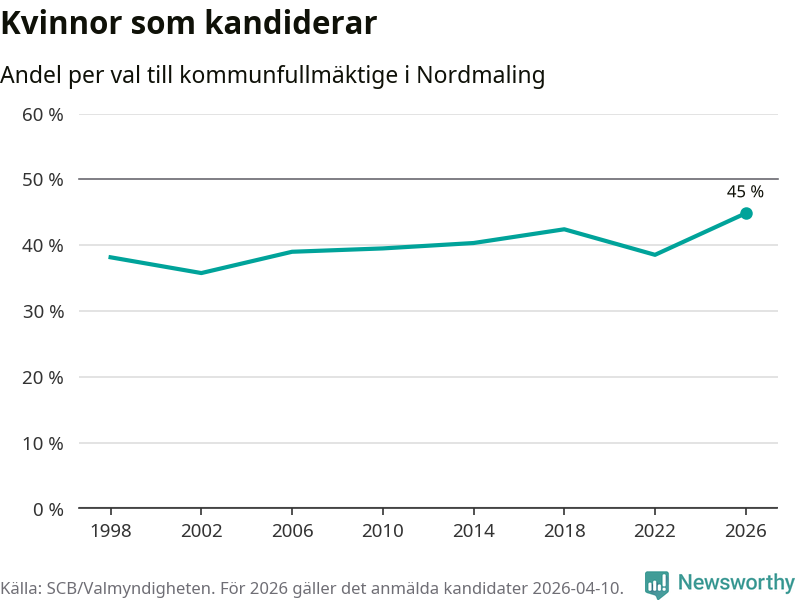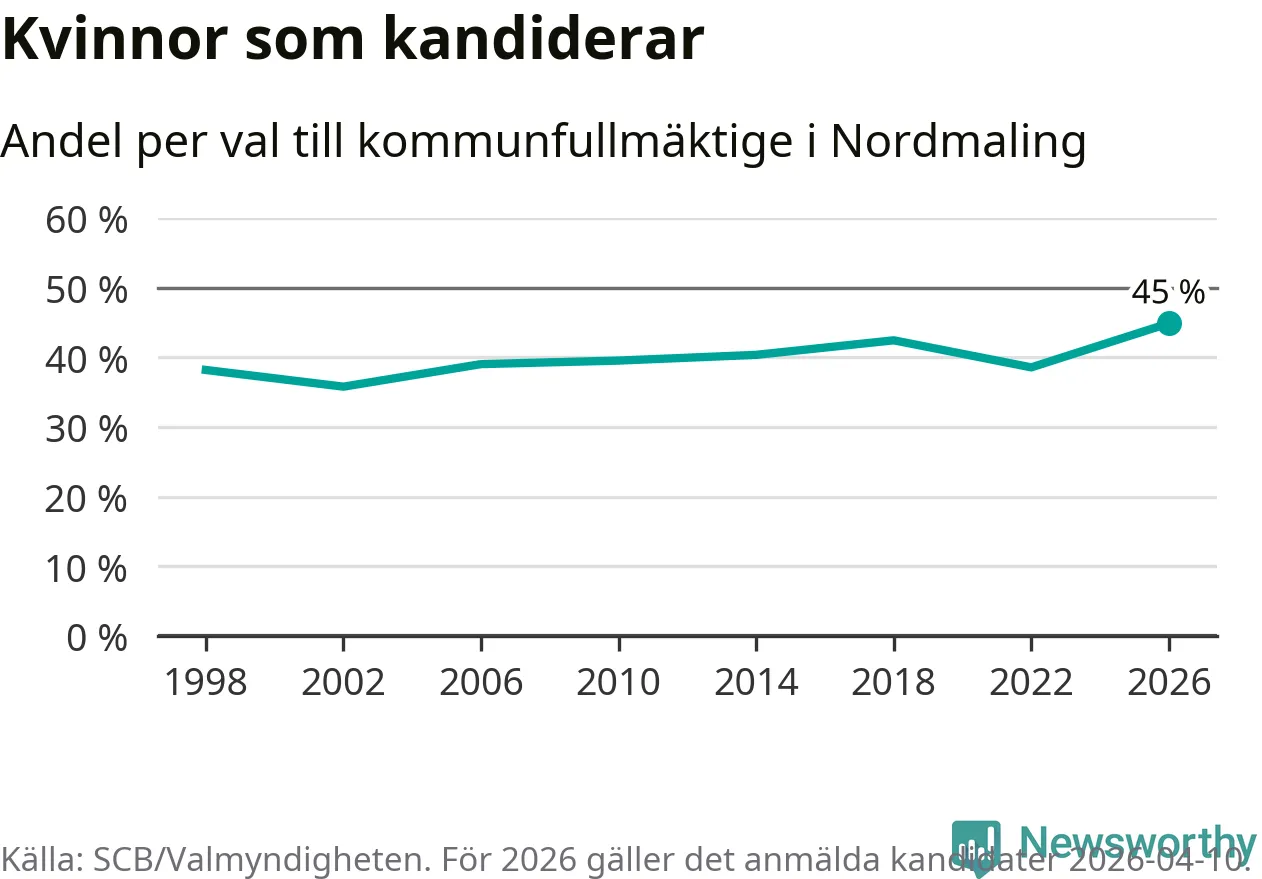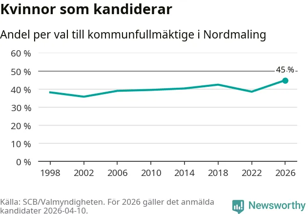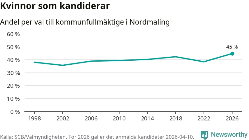 Kvinnorna utgör 45 procent av de hittills anmälda kandidaterna, vilket är den högsta andelen på listorna till kommunfullmäktige i Nordmaling sedan åtminstone valet 1998. Nordmaling är en av 264 kommuner i landet där männen utgör en majoritet av kandidaterna på listorna.