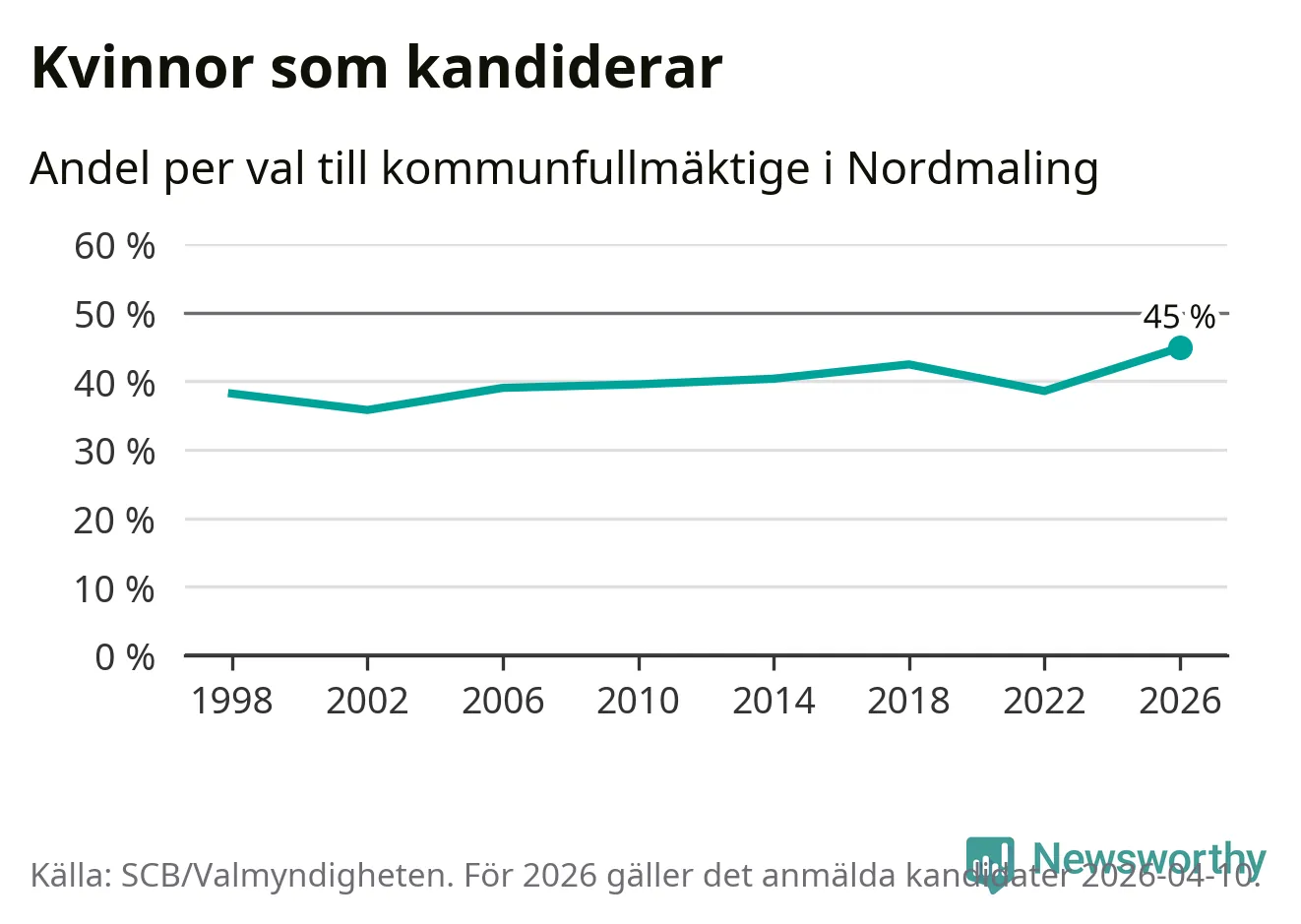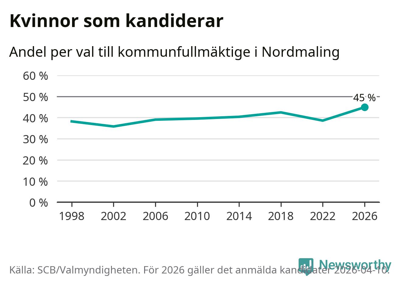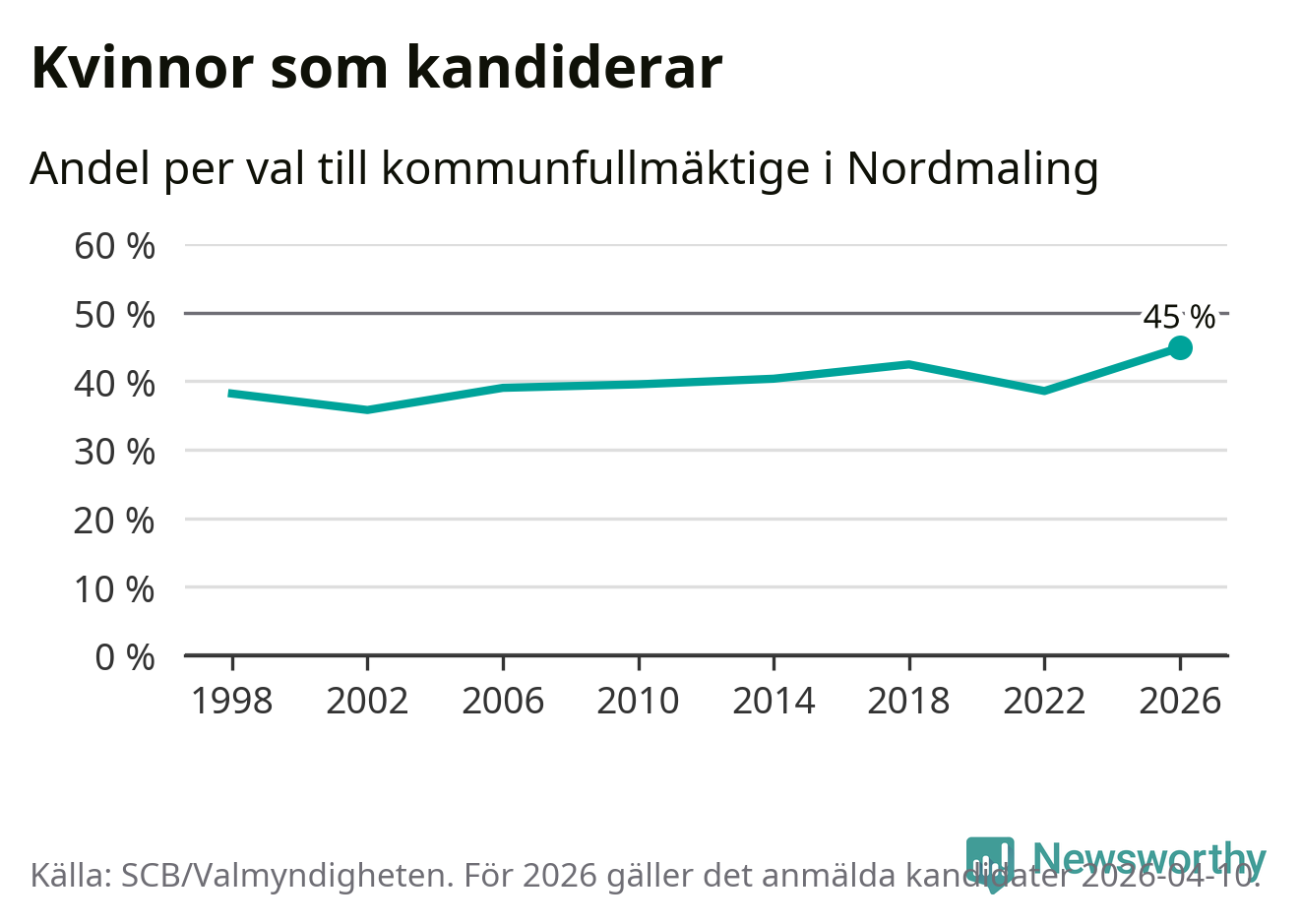 Kvinnorna utgör 45 procent av de hittills anmälda kandidaterna, vilket är den högsta andelen på listorna till kommunfullmäktige i Nordmaling sedan åtminstone valet 1998. Nordmaling är en av 264 kommuner i landet där männen utgör en majoritet av kandidaterna på listorna.