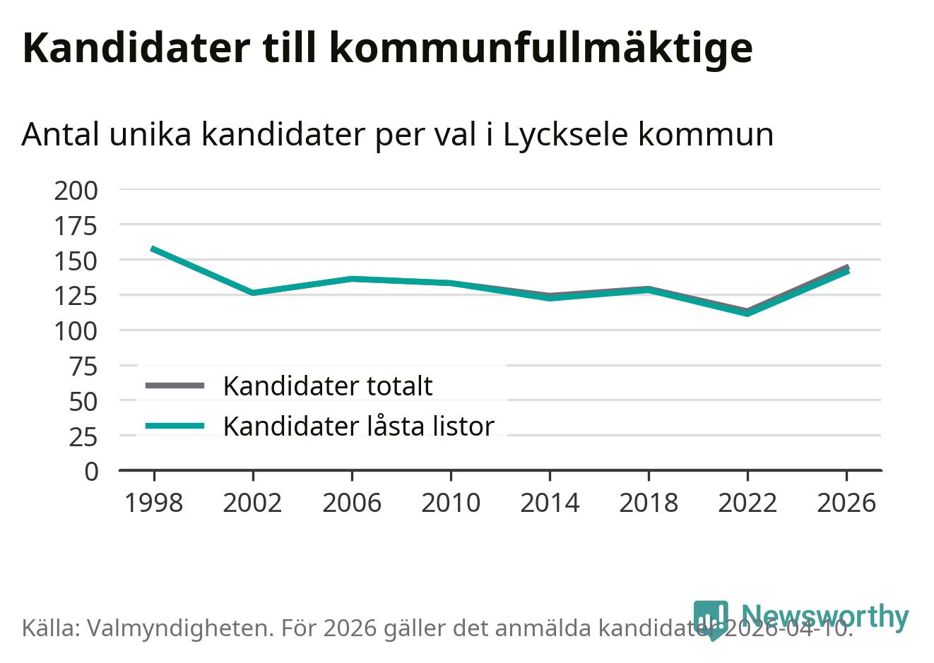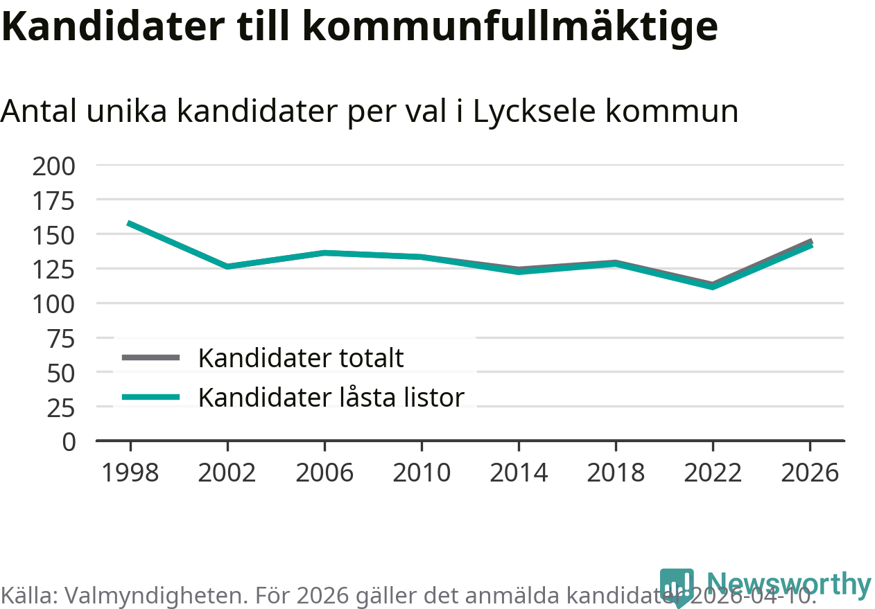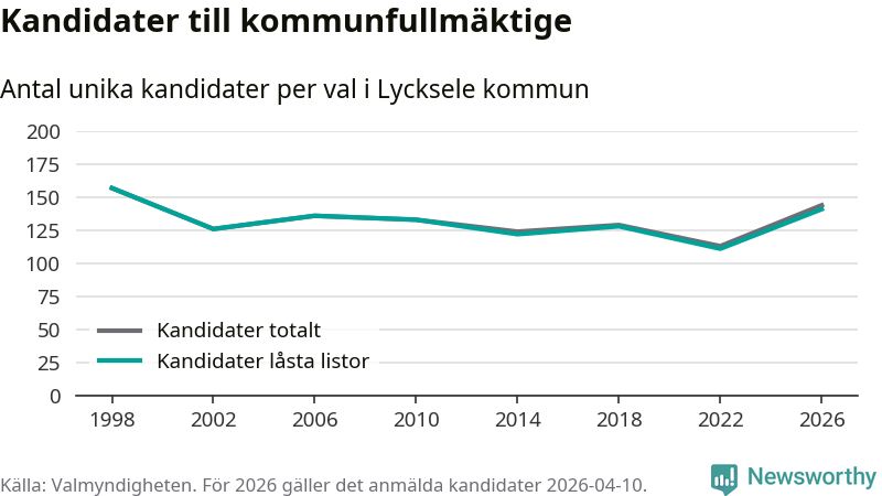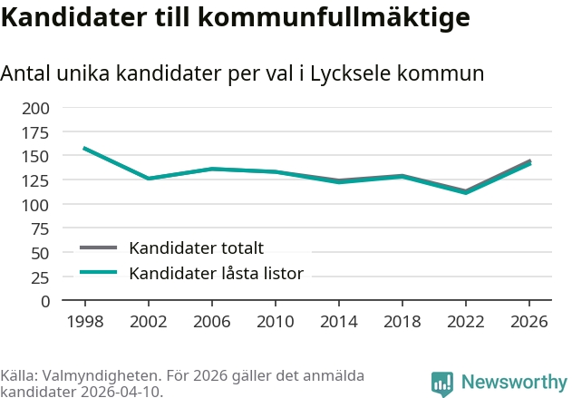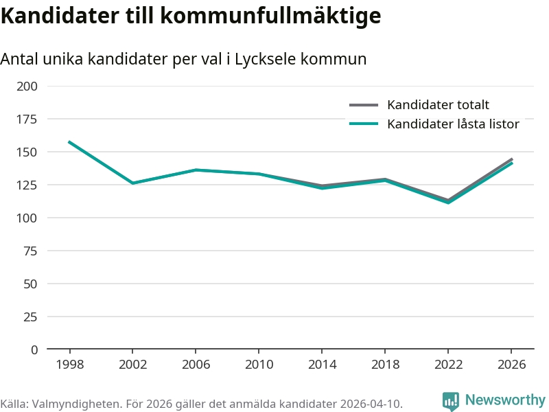 Att listan är låst innebär att partiet redan har anmält sina kandidater och bestämt ordningen på listan och att väljare inte kan lägga till egna kandidater. På öppna listor kan kandidater läggas till fram till dagarna före valet och vem som helst kan anmäla sig som kandidat. De senaste valen har drygt nio av tio kandidater anmälts på låsta listor. I valet till kommunfullmäktige i Lycksele 2022 fanns i princip alla kandidater på låsta listor. Hittills i år finns tre kandidater på öppna listor. Totalt rör det sig alltså om 144 kandidater till höstens val.