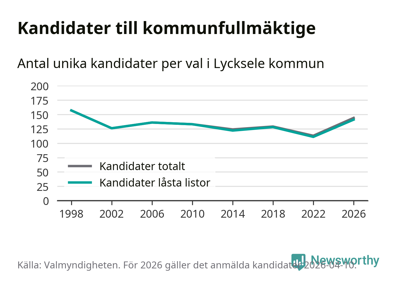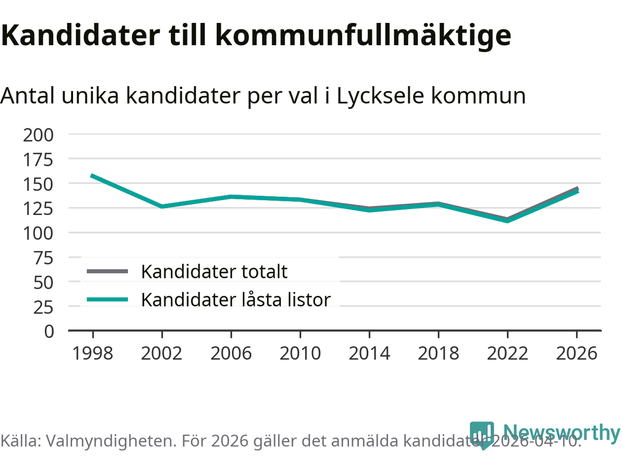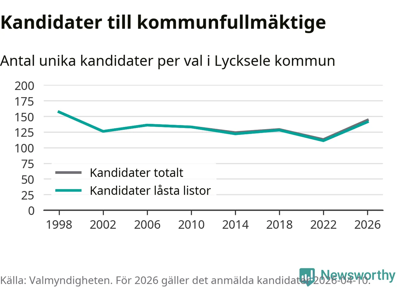 Att listan är låst innebär att partiet redan har anmält sina kandidater och bestämt ordningen på listan och att väljare inte kan lägga till egna kandidater. På öppna listor kan kandidater läggas till fram till dagarna före valet och vem som helst kan anmäla sig som kandidat. De senaste valen har drygt nio av tio kandidater anmälts på låsta listor. I valet till kommunfullmäktige i Lycksele 2022 fanns i princip alla kandidater på låsta listor. Hittills i år finns tre kandidater på öppna listor. Totalt rör det sig alltså om 144 kandidater till höstens val.