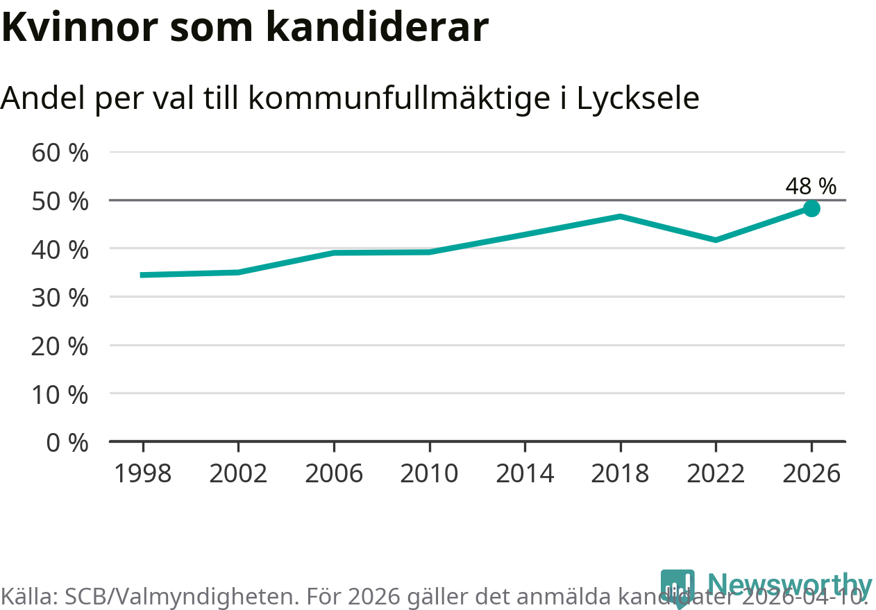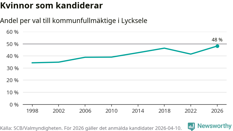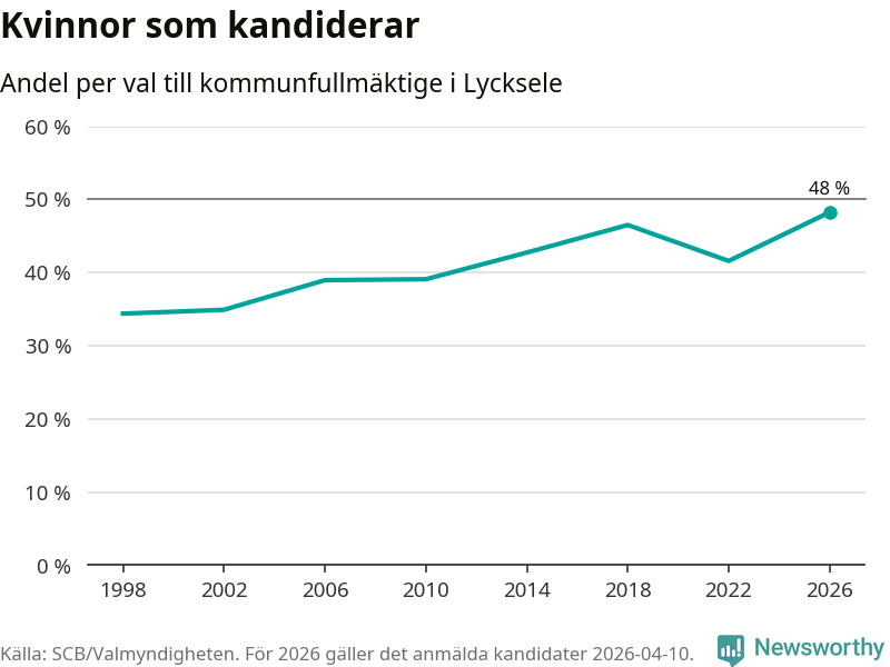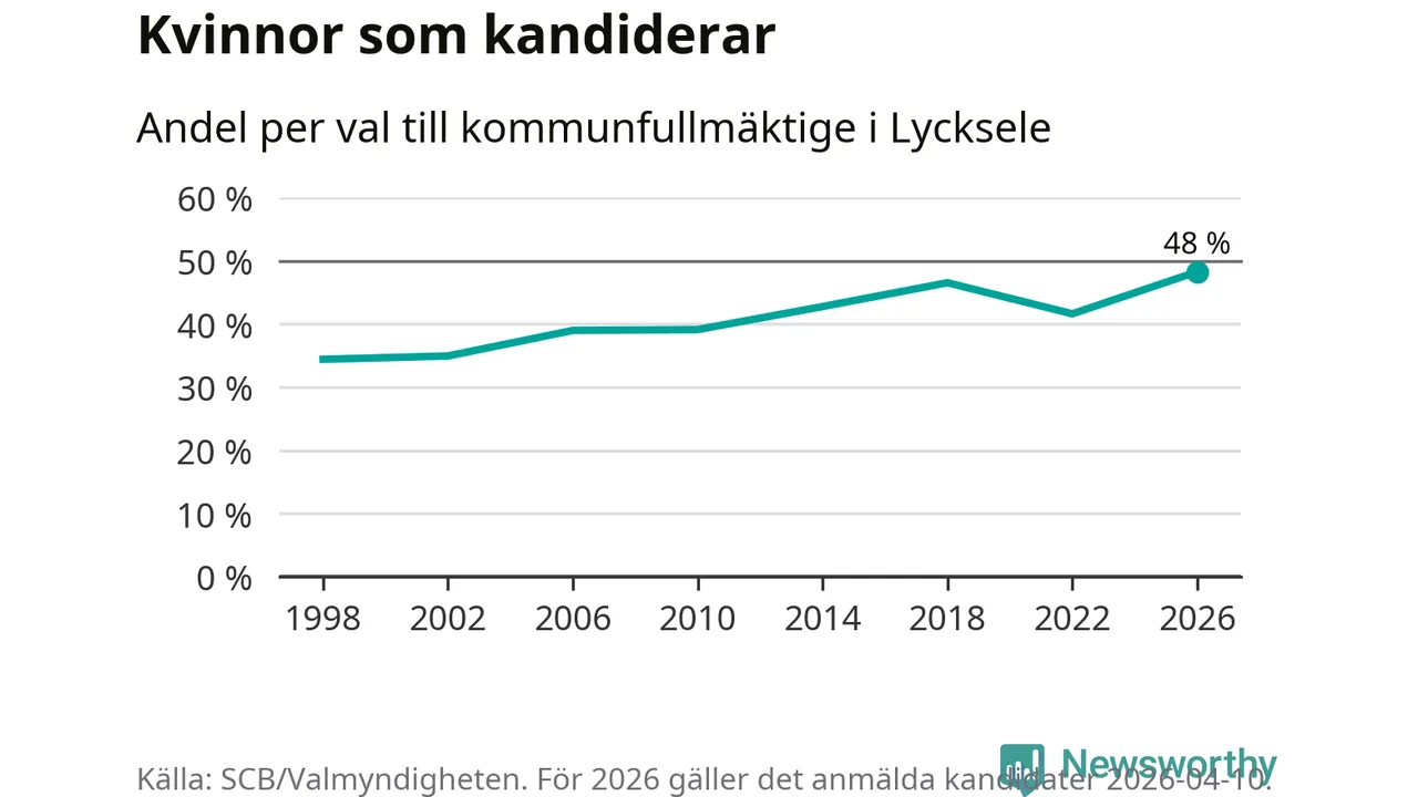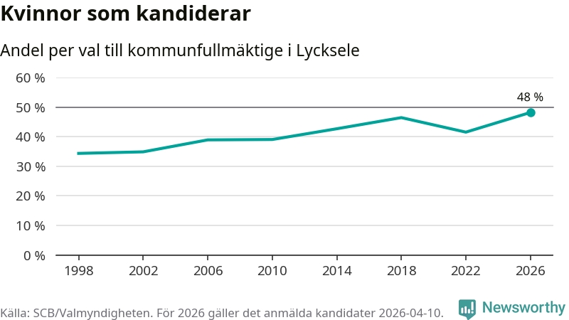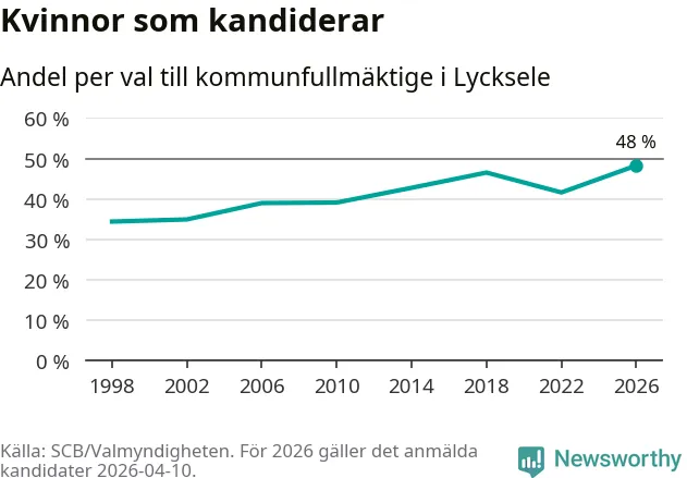 Kvinnorna utgör 48 procent av de hittills anmälda kandidaterna, vilket är den högsta andelen på listorna till kommunfullmäktige i Lycksele sedan åtminstone valet 1998. Lycksele är en av 264 kommuner i landet där männen utgör en majoritet av kandidaterna på listorna.