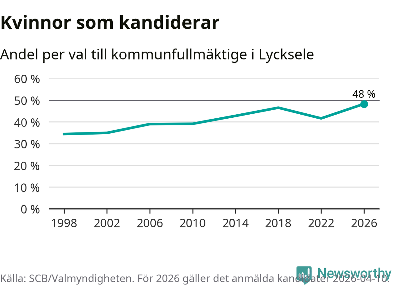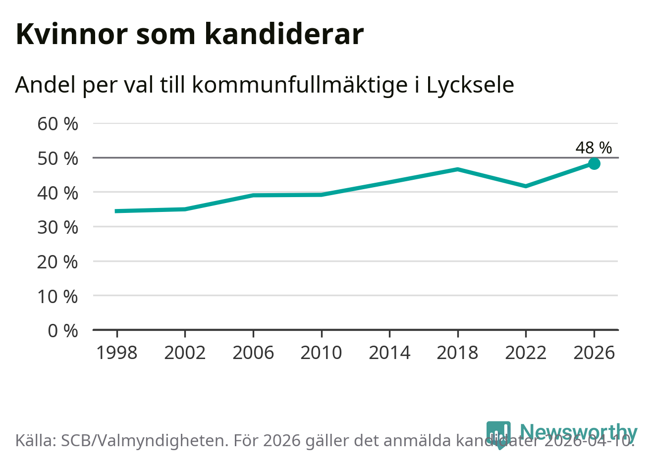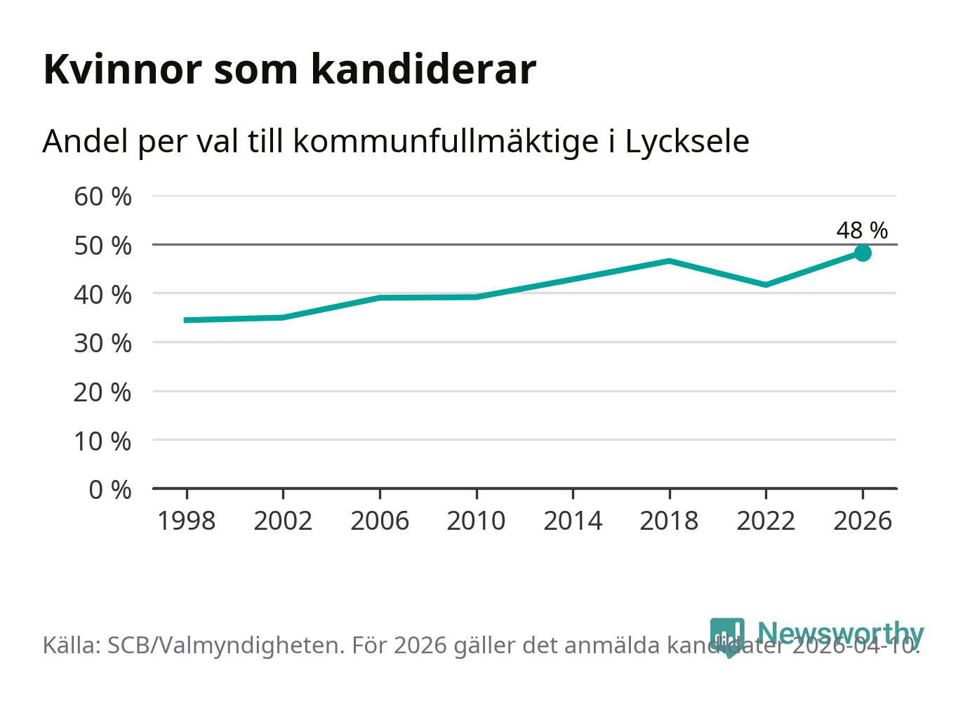 Kvinnorna utgör 48 procent av de hittills anmälda kandidaterna, vilket är den högsta andelen på listorna till kommunfullmäktige i Lycksele sedan åtminstone valet 1998. Lycksele är en av 264 kommuner i landet där männen utgör en majoritet av kandidaterna på listorna.