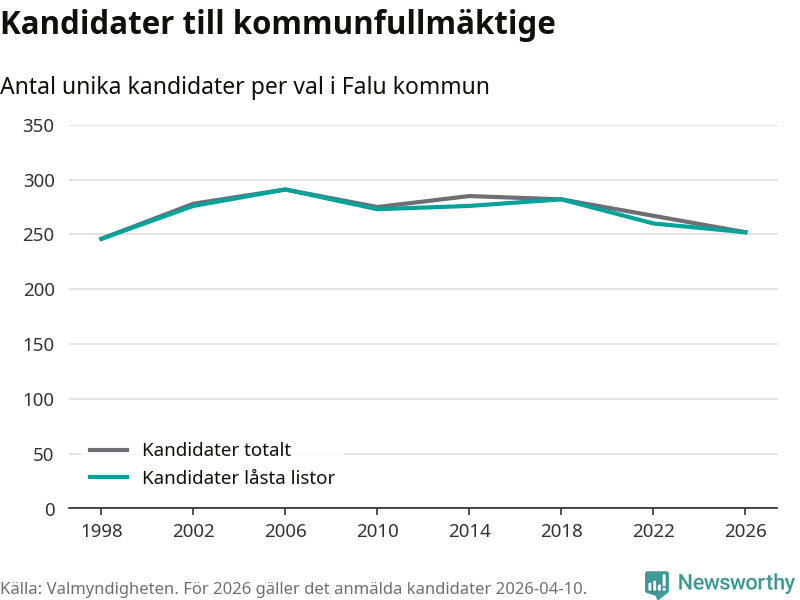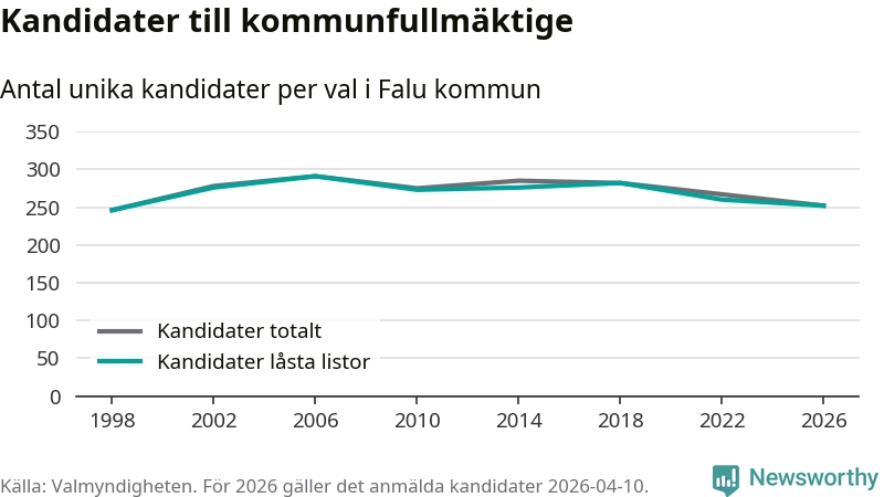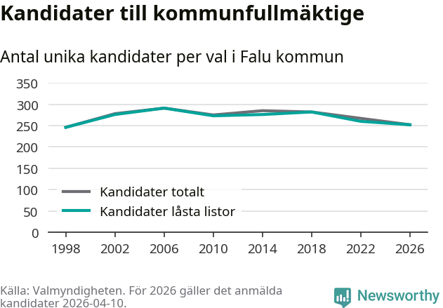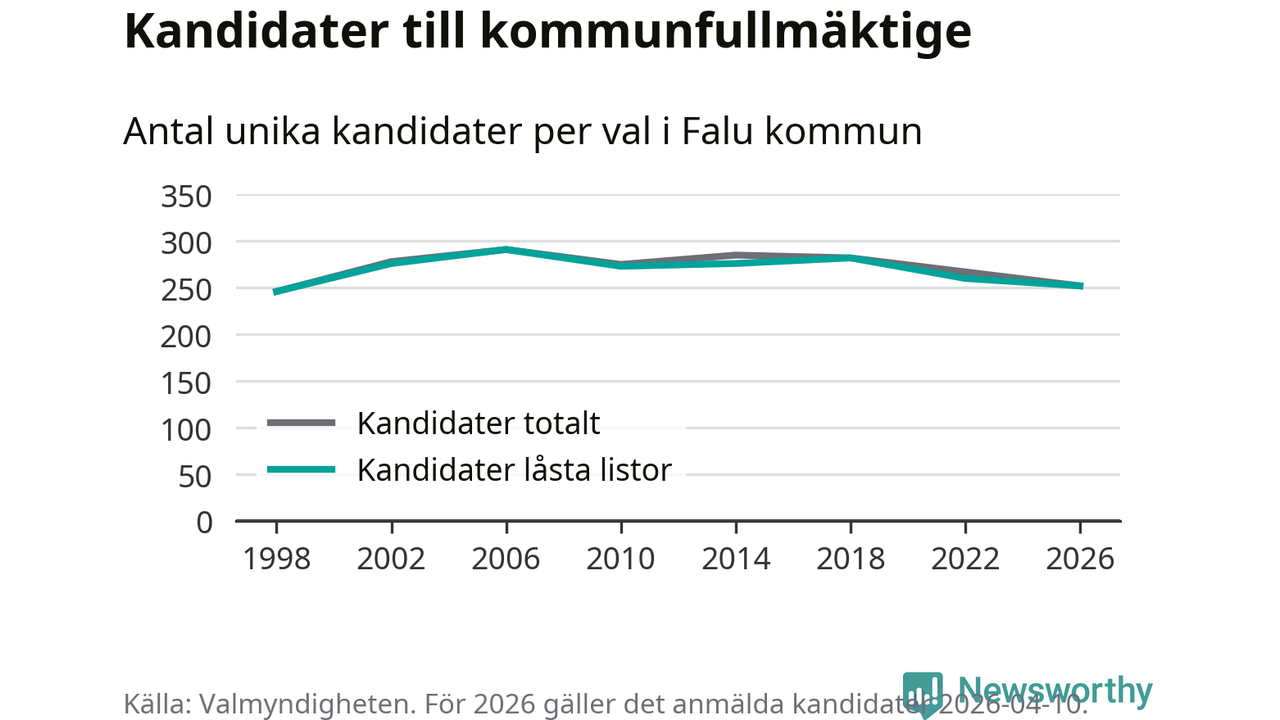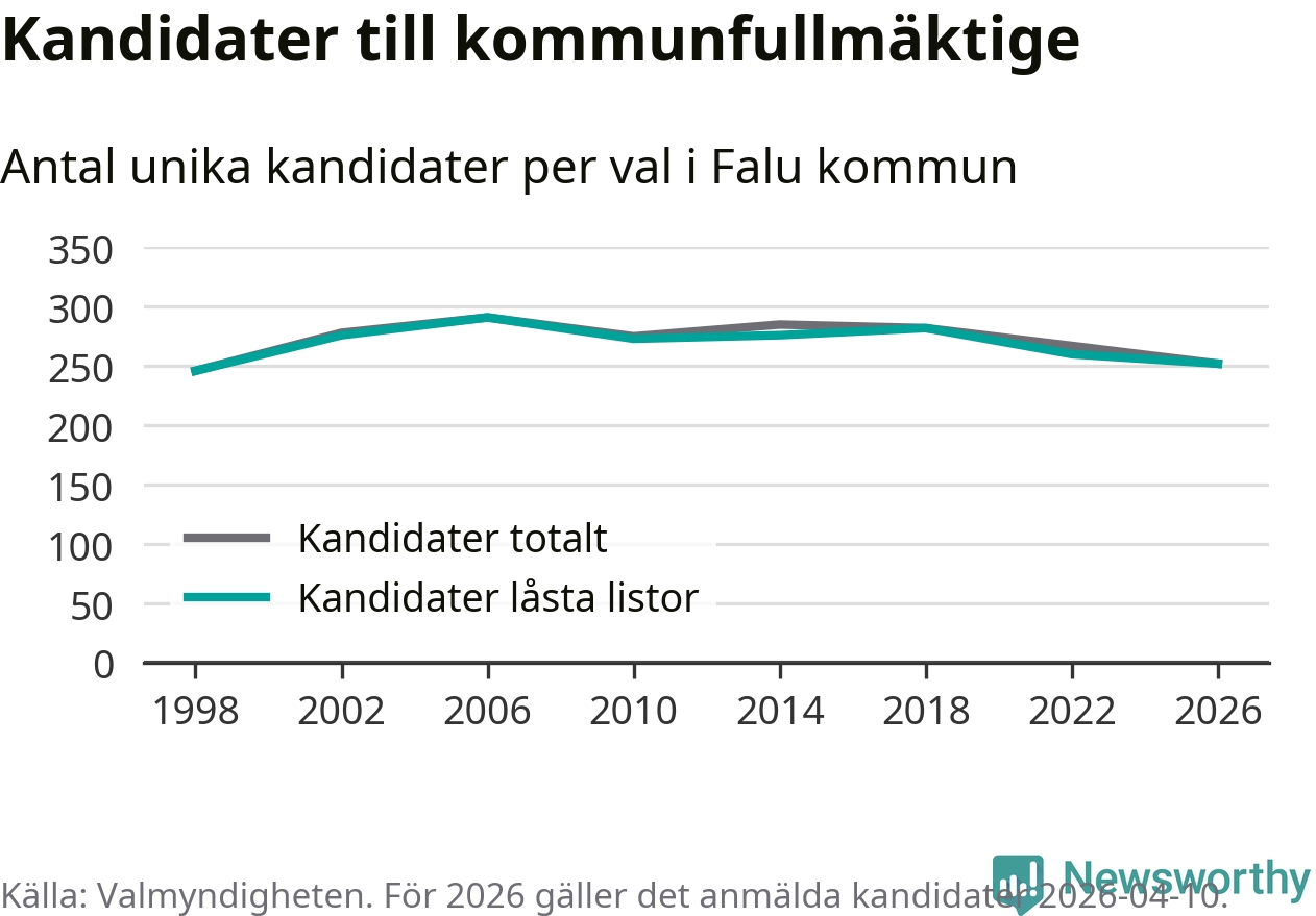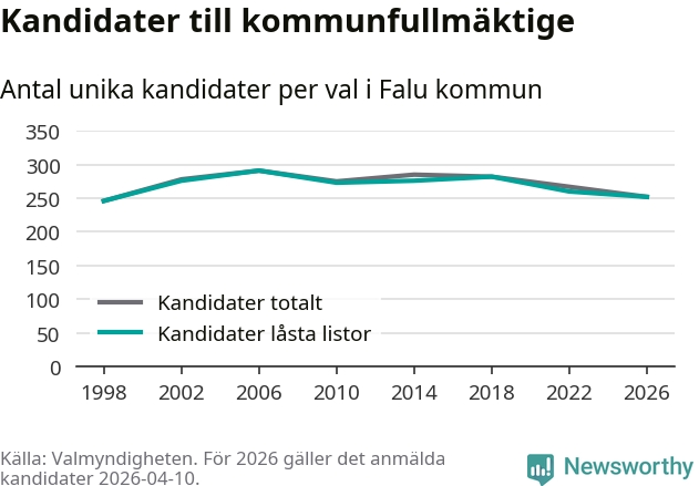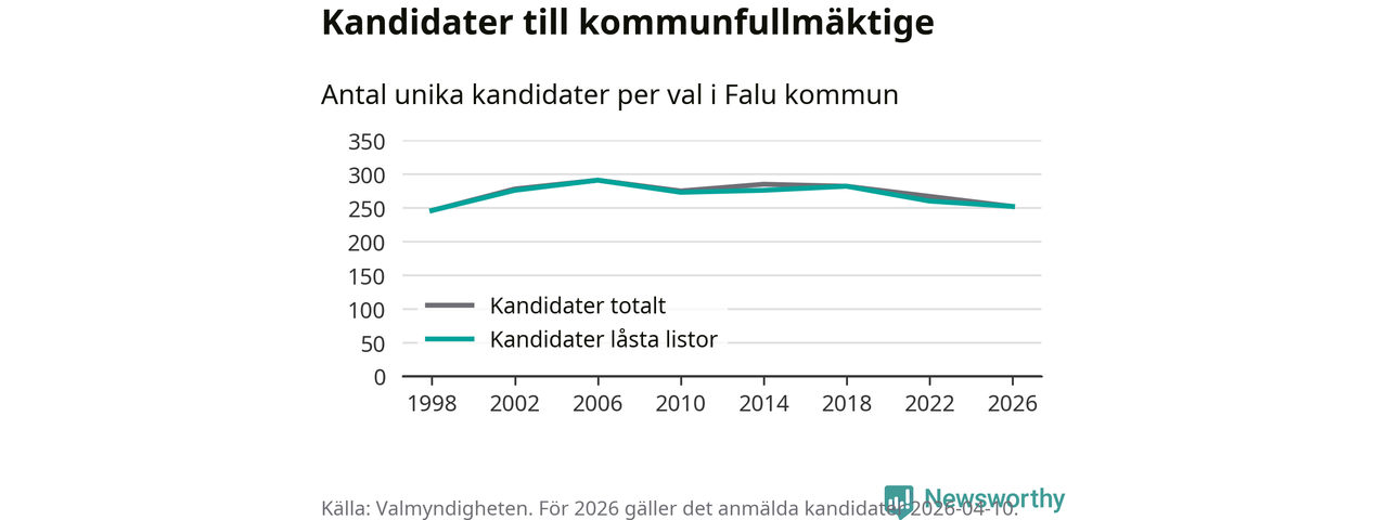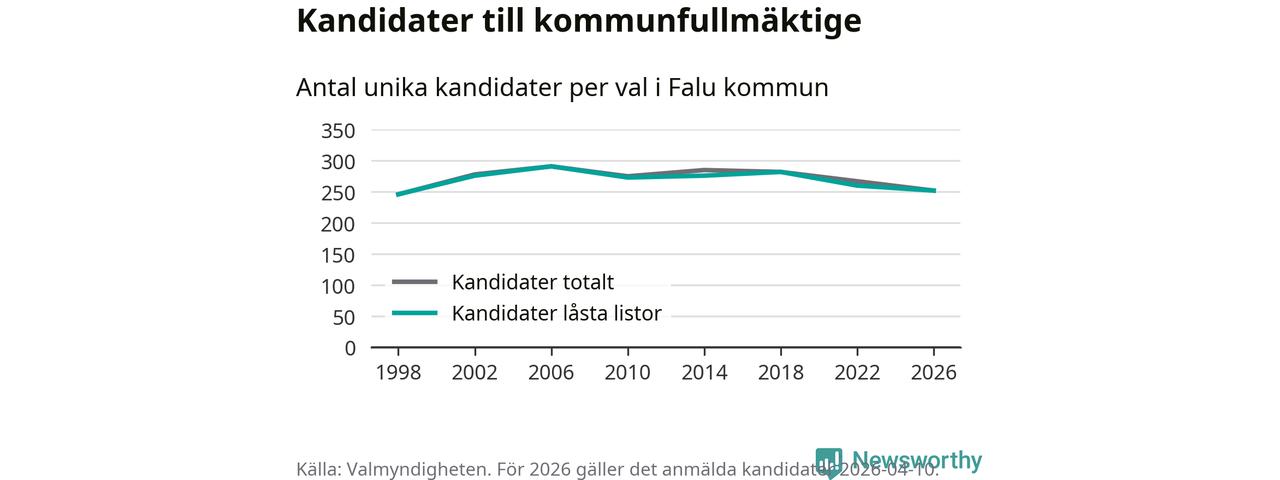På torsdagen var det deadline för partier med låsta listor att registrera sina kandidater inför höstens val. Till valet till kommunfullmäktige i Falun är 252 kandidater anmälda på sådana listor, vilket är åtta färre än i valet 2022.