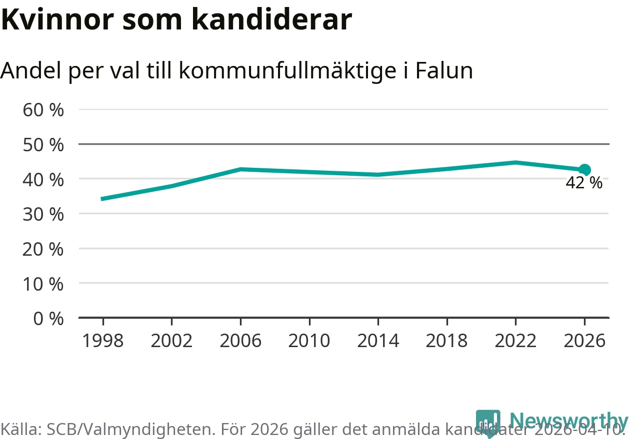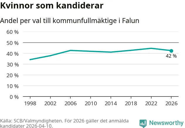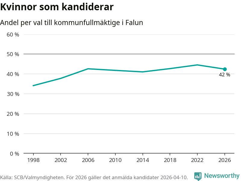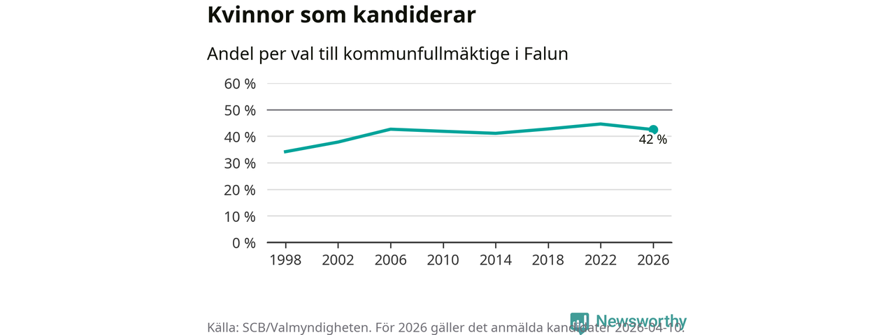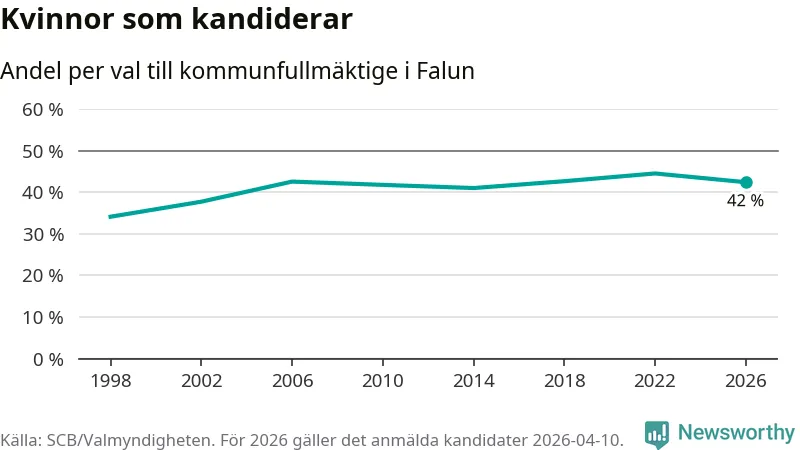 Kvinnorna utgör 42 procent av de hittills anmälda kandidaterna, vilket är den lägsta andelen på listorna till kommunfullmäktige i Falun sedan valet 2014. Vid valet 2022 var 45 procent kvinnor, valet 1998 var motsvarande siffra 34 procent. Falun är en av 264 kommuner i landet där männen utgör en majoritet av kandidaterna på listorna.