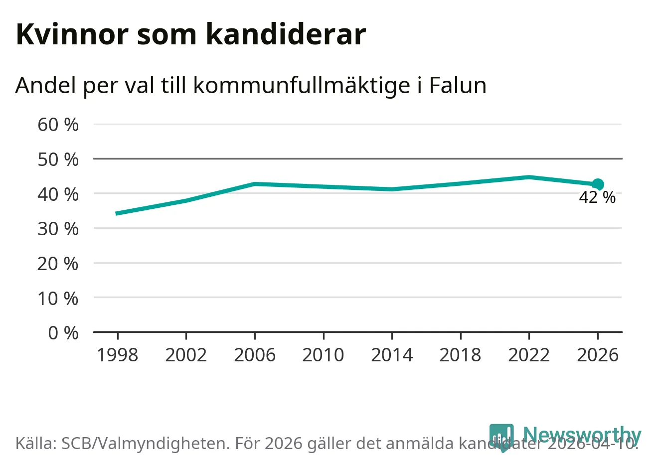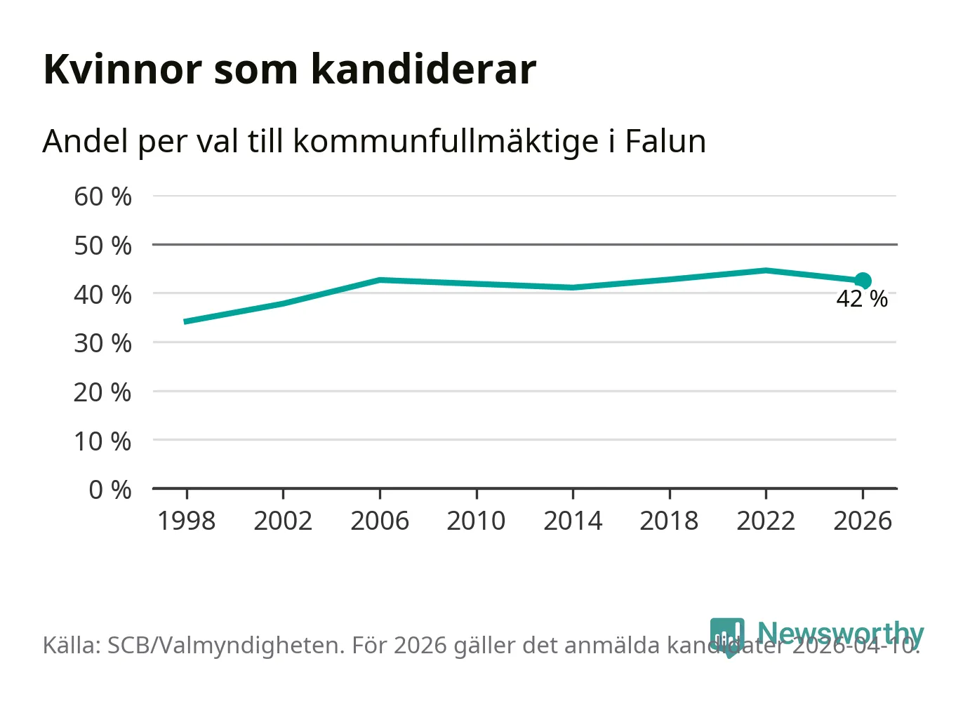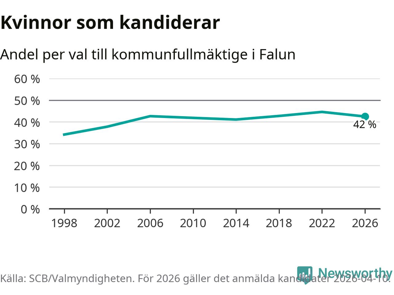 Kvinnorna utgör 42 procent av de hittills anmälda kandidaterna, vilket är den lägsta andelen på listorna till kommunfullmäktige i Falun sedan valet 2014. Vid valet 2022 var 45 procent kvinnor, valet 1998 var motsvarande siffra 34 procent. Falun är en av 264 kommuner i landet där männen utgör en majoritet av kandidaterna på listorna.