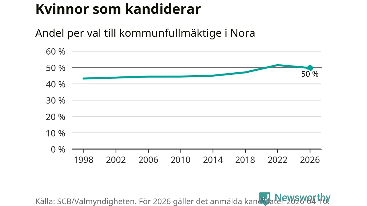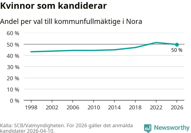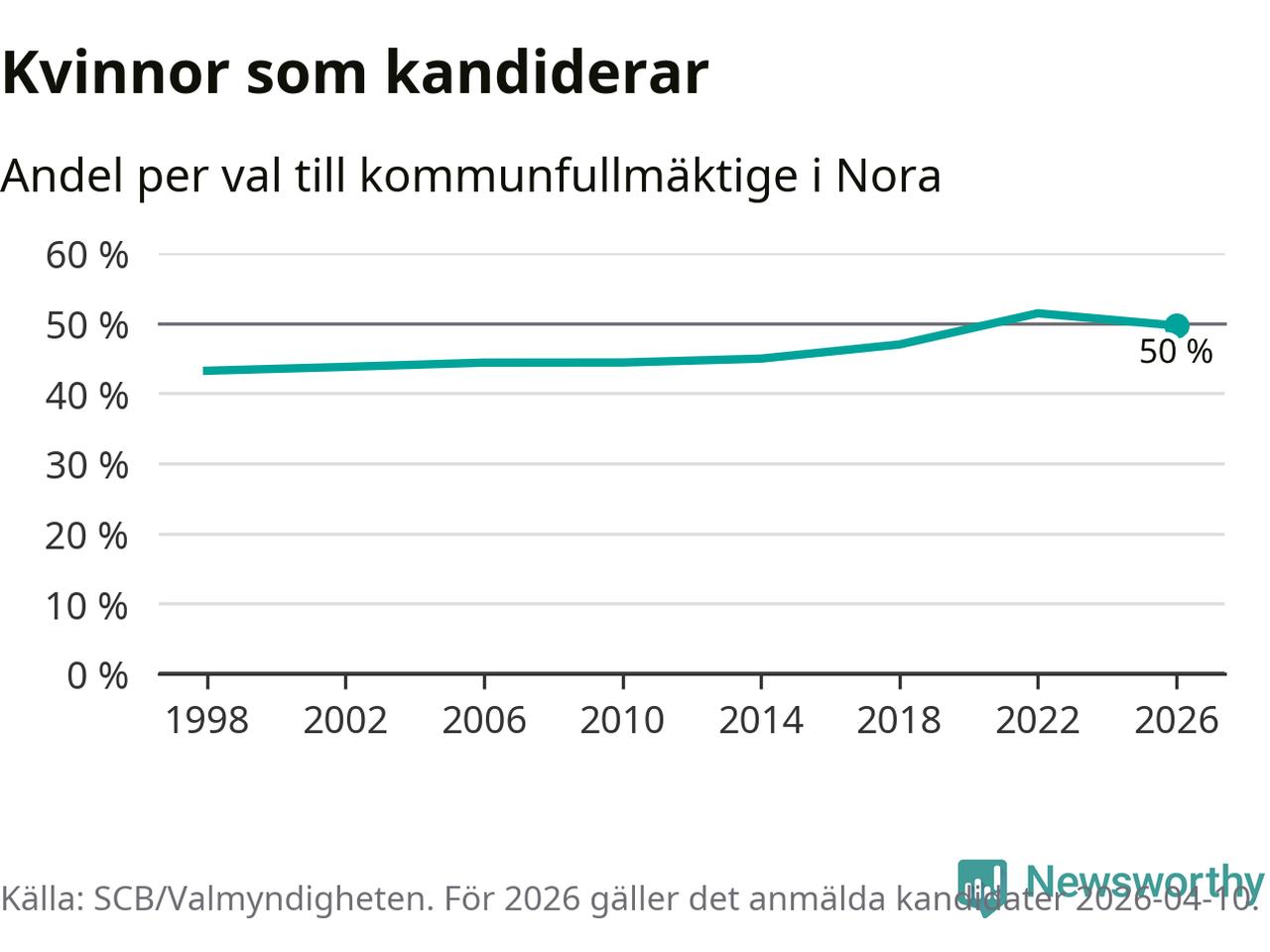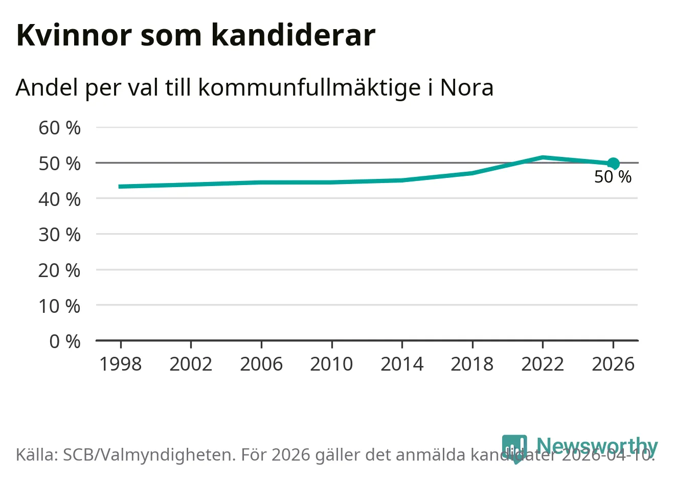 Kvinnorna utgör 50 procent av de hittills anmälda kandidaterna. Vid valet 2022 var 51 procent kvinnor, valet 1998 var motsvarande siffra 43 procent. Nora är en av 264 kommuner i landet där männen utgör en majoritet av kandidaterna på listorna.