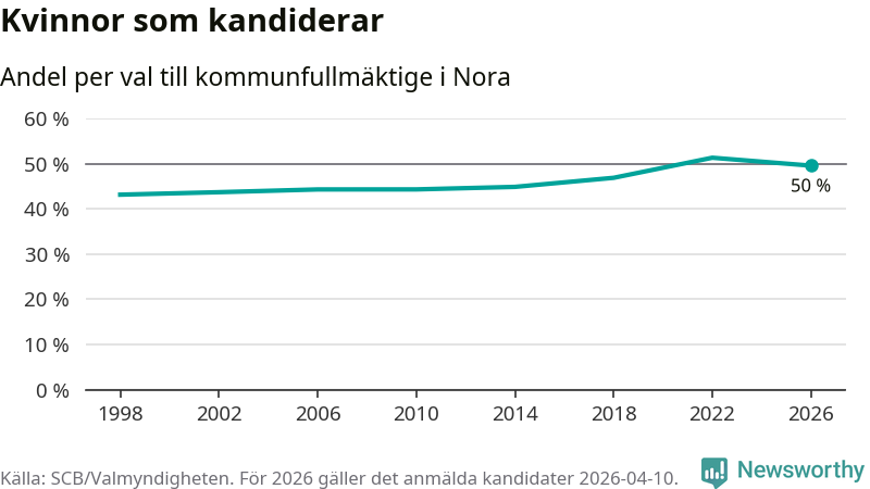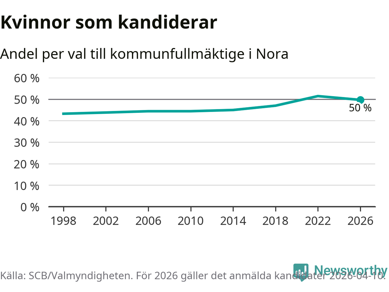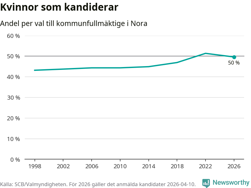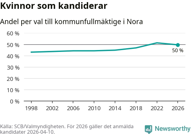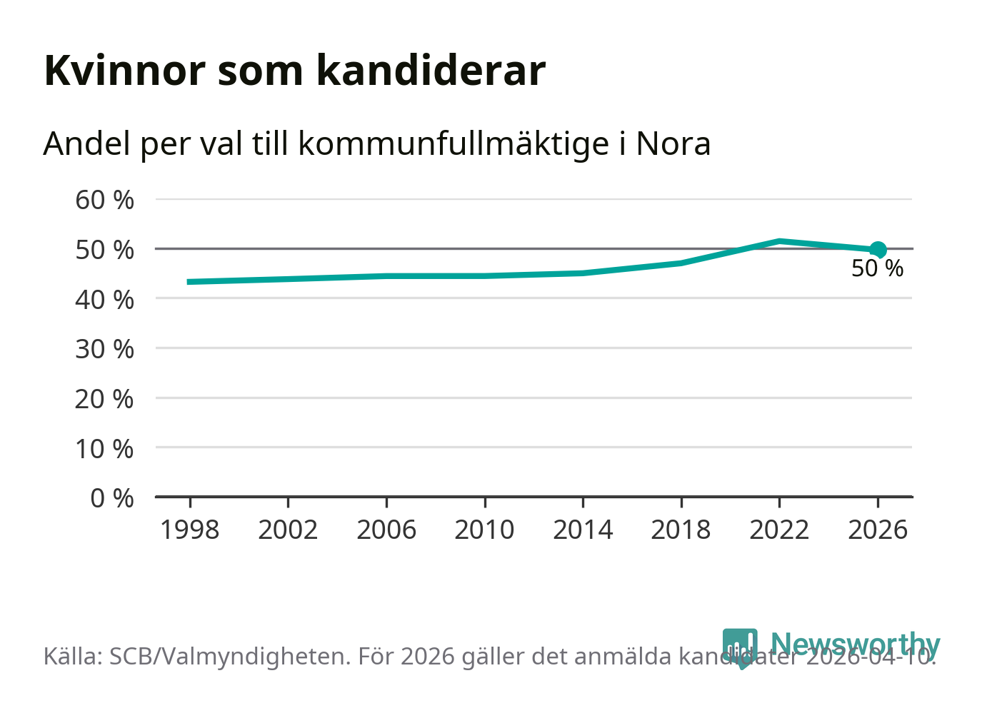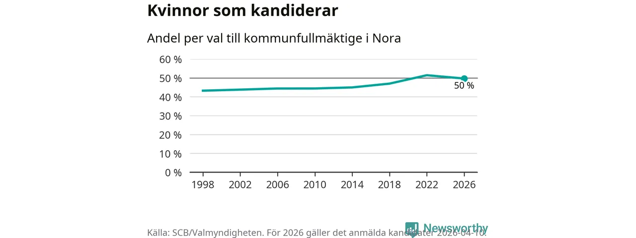 Kvinnorna utgör 50 procent av de hittills anmälda kandidaterna. Vid valet 2022 var 51 procent kvinnor, valet 1998 var motsvarande siffra 43 procent. Nora är en av 264 kommuner i landet där männen utgör en majoritet av kandidaterna på listorna.