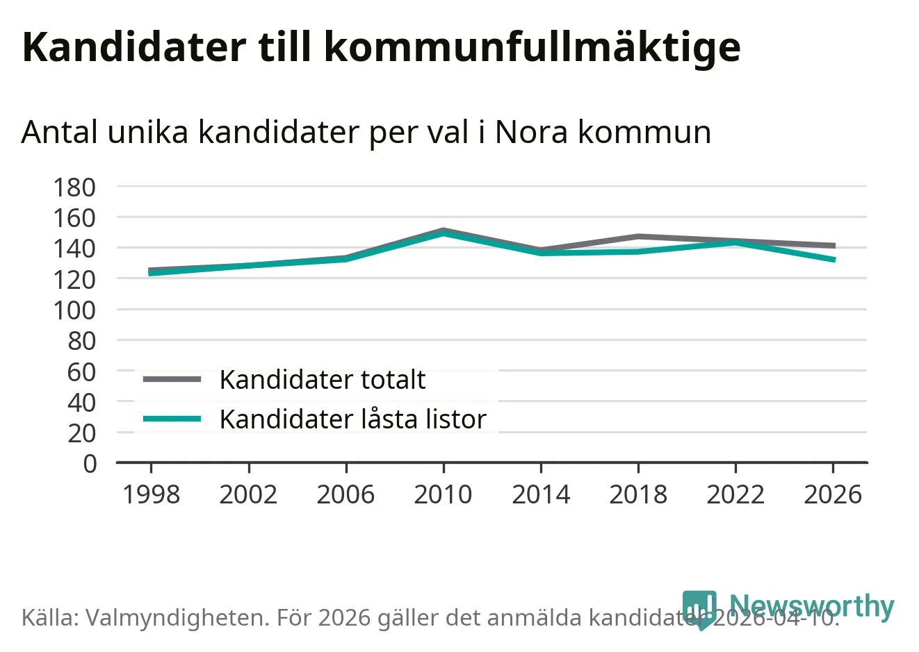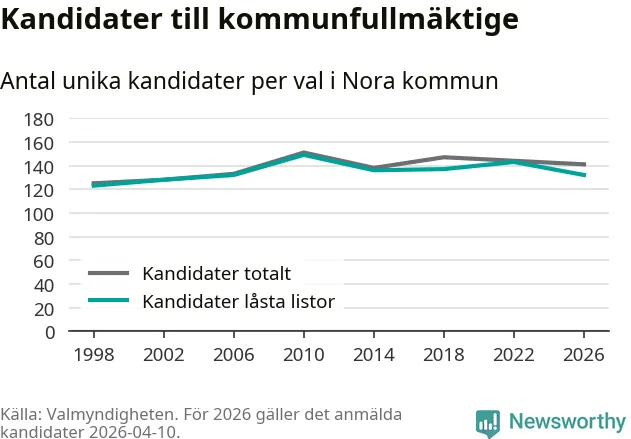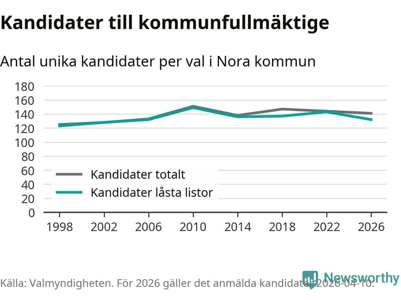 På torsdagen var det deadline för partier med låsta listor att registrera sina kandidater inför höstens val. Till valet till kommunfullmäktige i Nora är 132 kandidater anmälda på sådana listor, vilket är elva färre än i valet 2022.