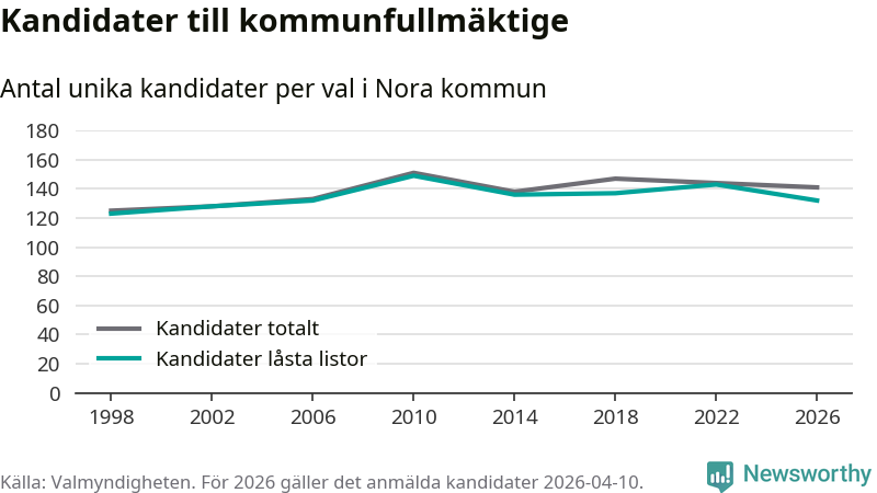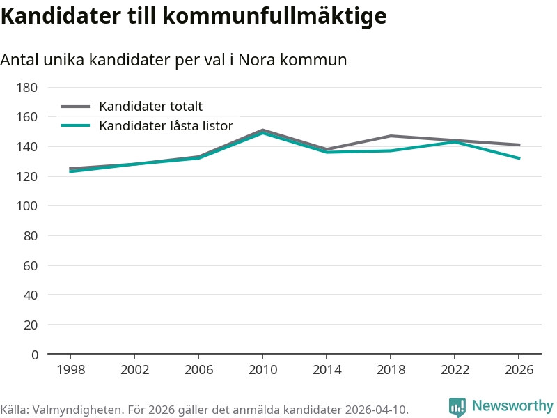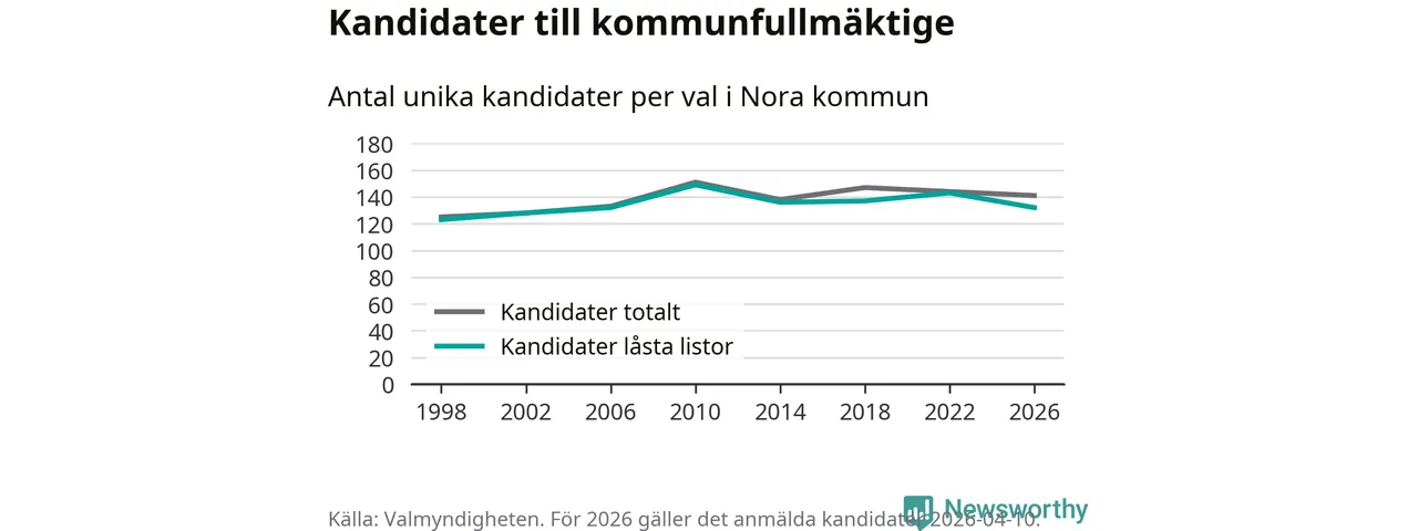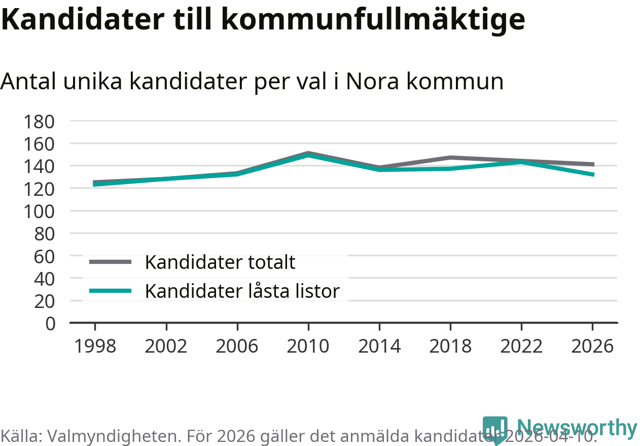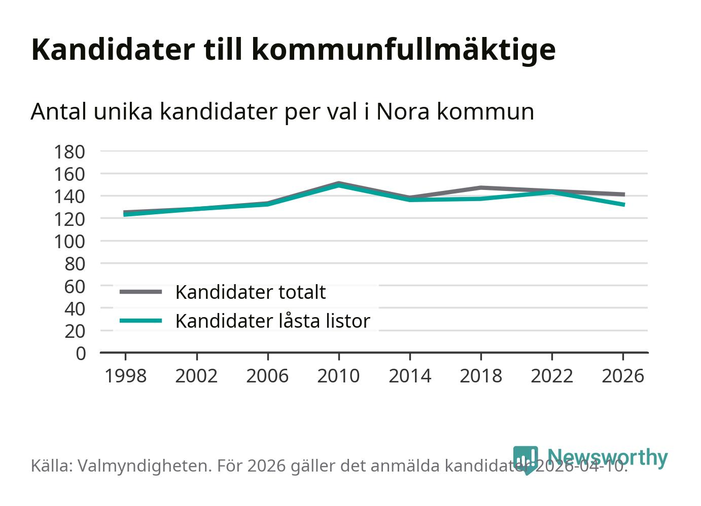 På torsdagen var det deadline för partier med låsta listor att registrera sina kandidater inför höstens val. Till valet till kommunfullmäktige i Nora är 132 kandidater anmälda på sådana listor, vilket är elva färre än i valet 2022.