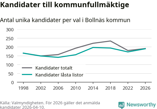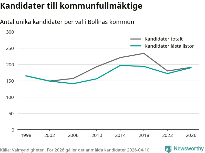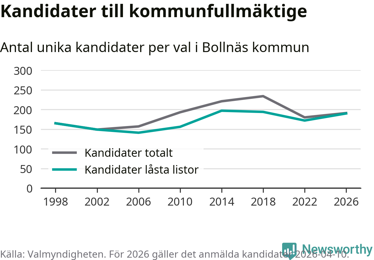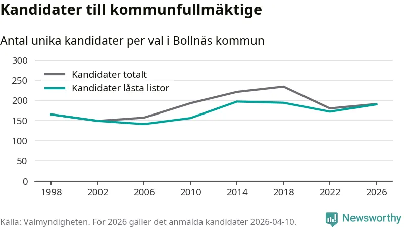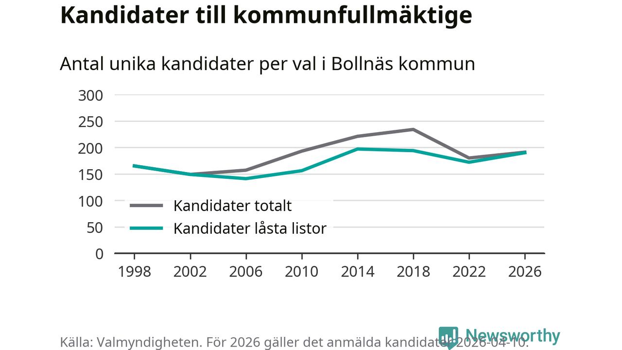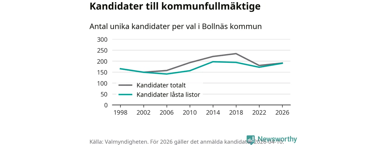 På torsdagen var det deadline för partier med låsta listor att registrera sina kandidater inför höstens val. Till valet till kommunfullmäktige i Bollnäs är 190 kandidater anmälda på sådana listor, vilket är 18 fler än i valet 2022.