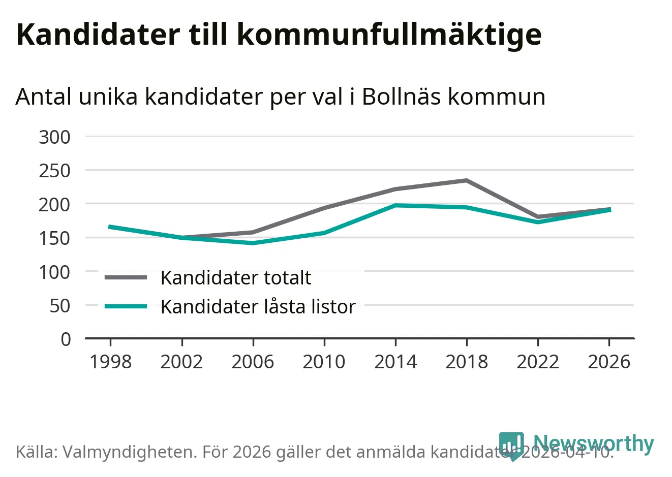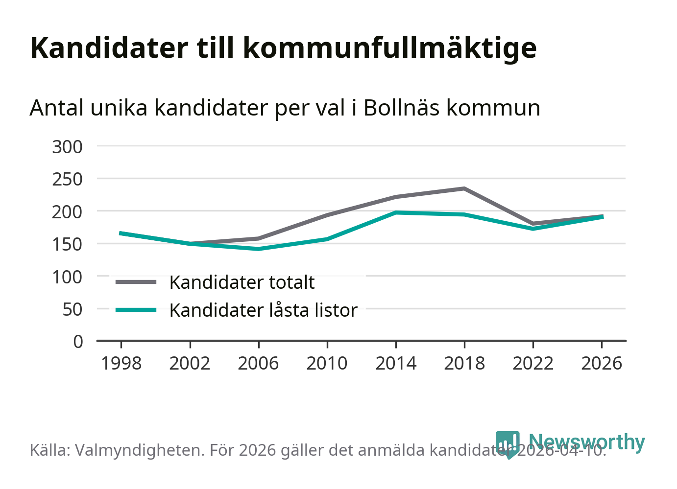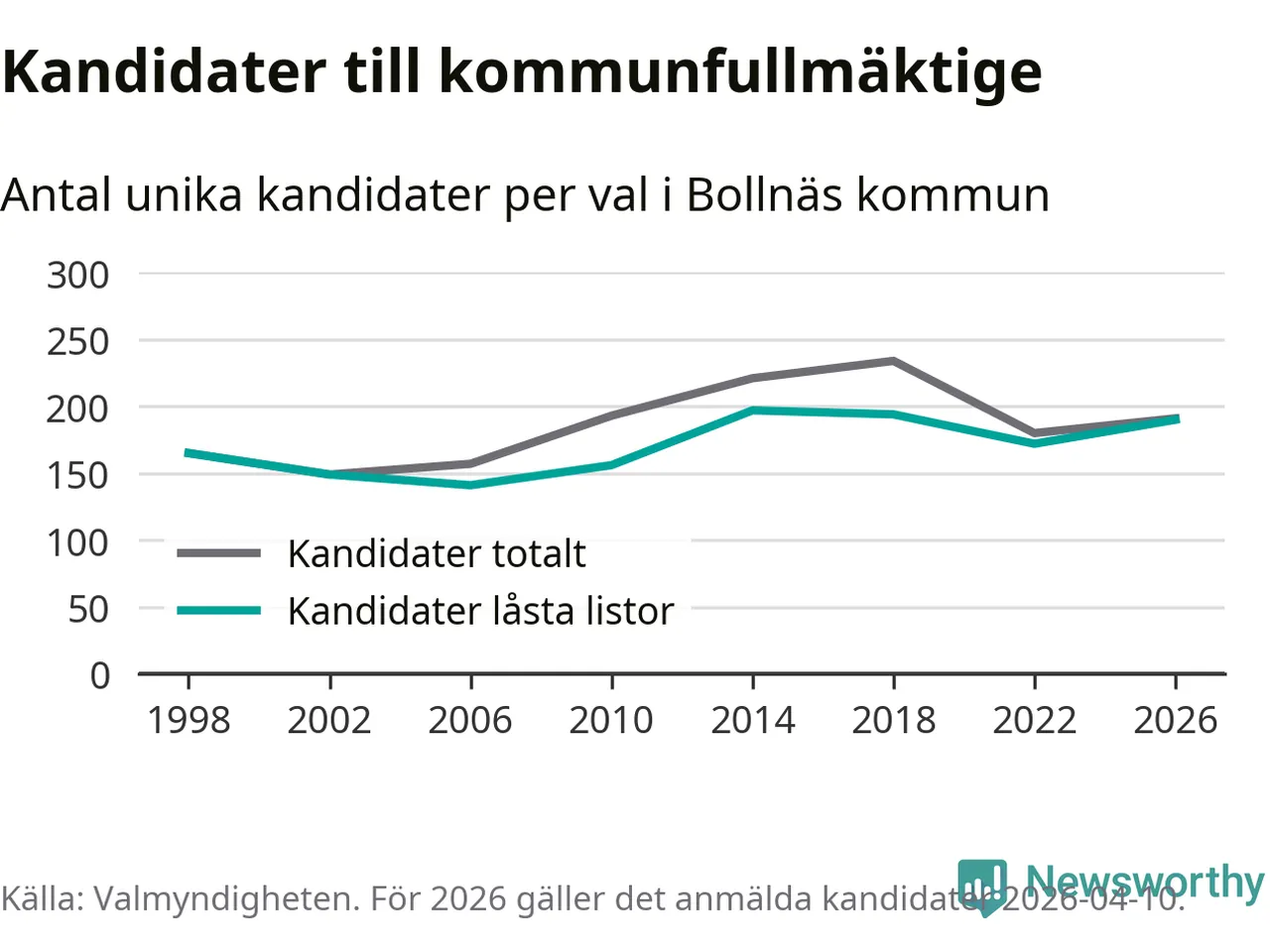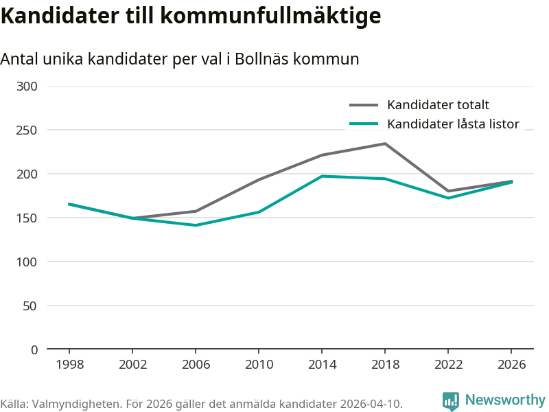 På torsdagen var det deadline för partier med låsta listor att registrera sina kandidater inför höstens val. Till valet till kommunfullmäktige i Bollnäs är 190 kandidater anmälda på sådana listor, vilket är 18 fler än i valet 2022.