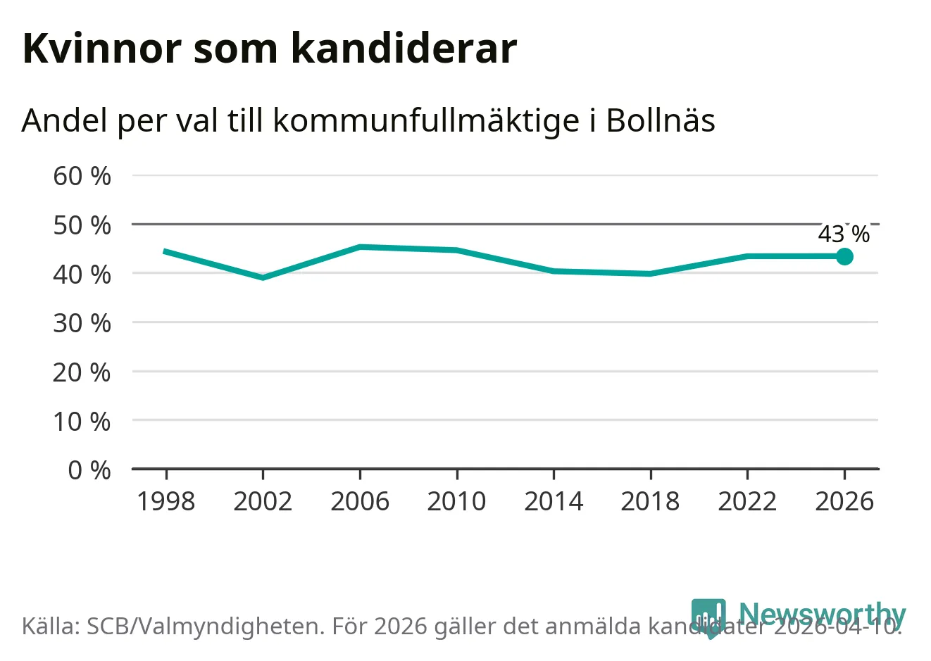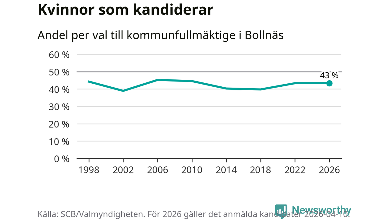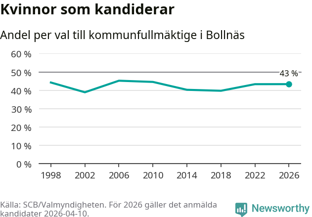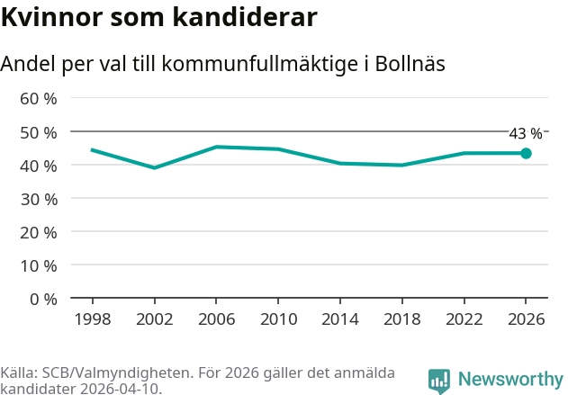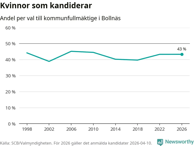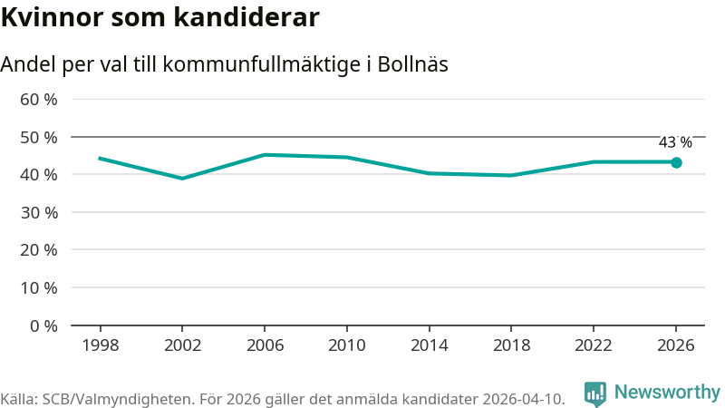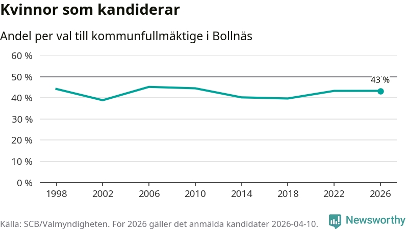 Kvinnorna utgör 43 procent av de hittills anmälda kandidaterna, vilket är den högsta andelen på listorna till kommunfullmäktige i Bollnäs sedan valet 2010. Vid valet 2006 var 45 procent kvinnor, valet 2002 var motsvarande siffra 39 procent. Bollnäs är en av 264 kommuner i landet där männen utgör en majoritet av kandidaterna på listorna.