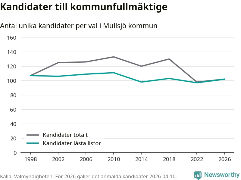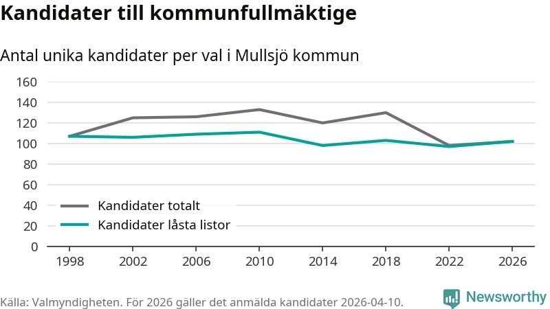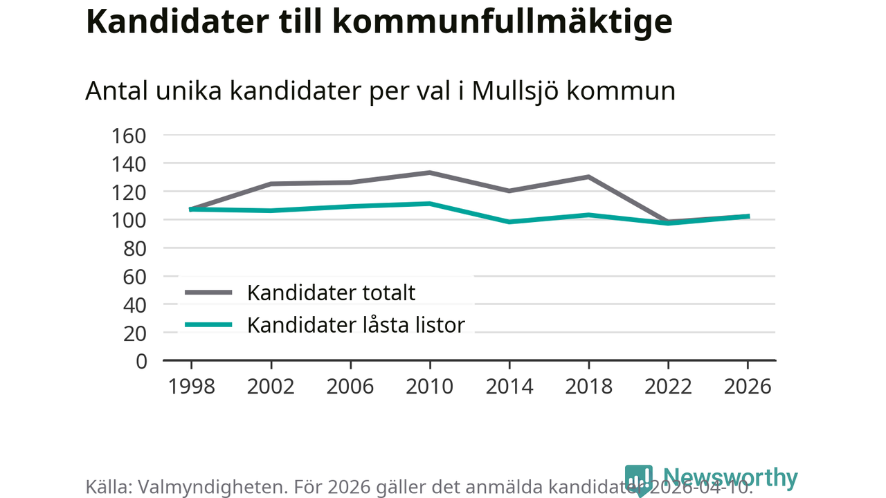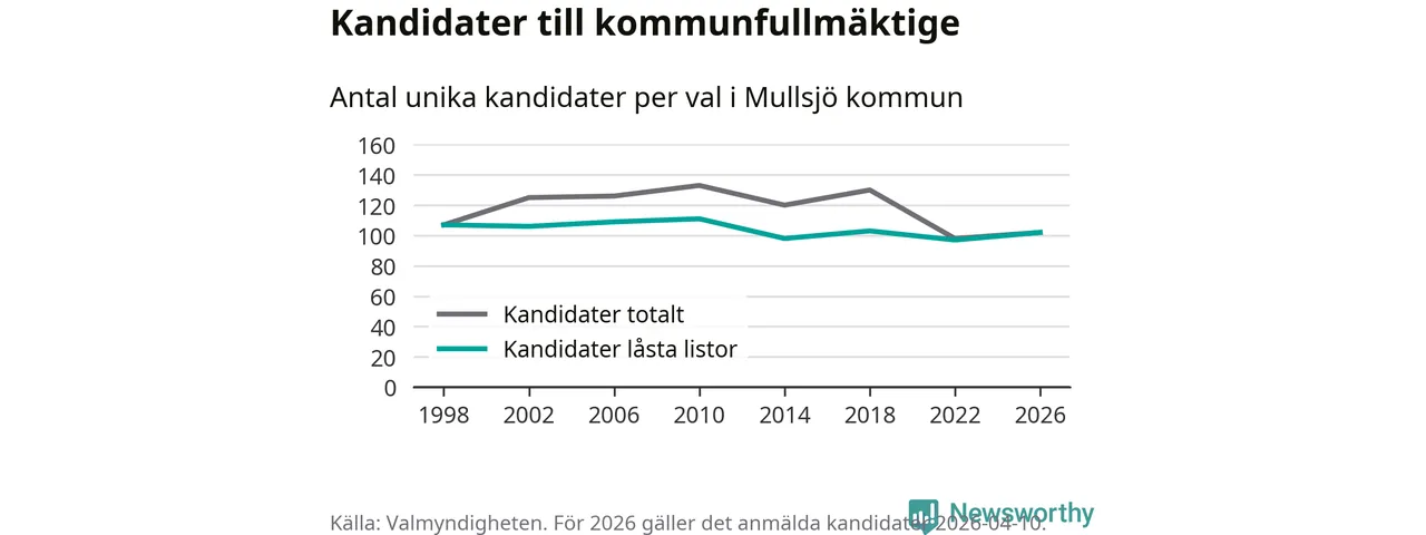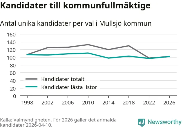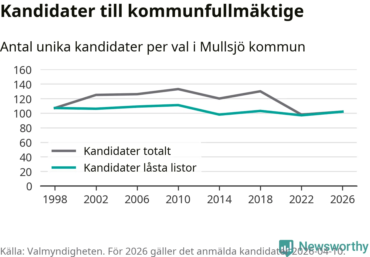 På torsdagen var det deadline för partier med låsta listor att registrera sina kandidater inför höstens val. Till valet till kommunfullmäktige i Mullsjö är 102 kandidater anmälda på sådana listor, vilket är fem fler än i valet 2022.