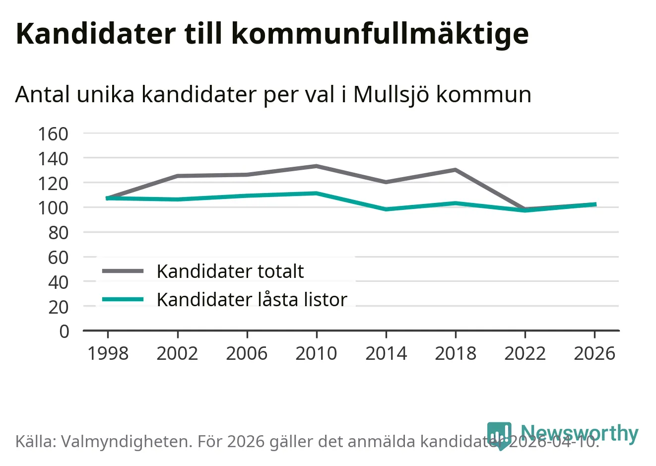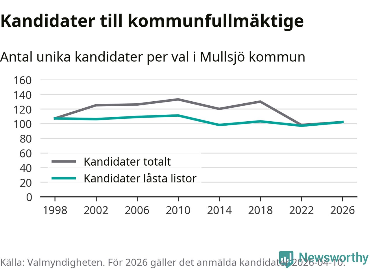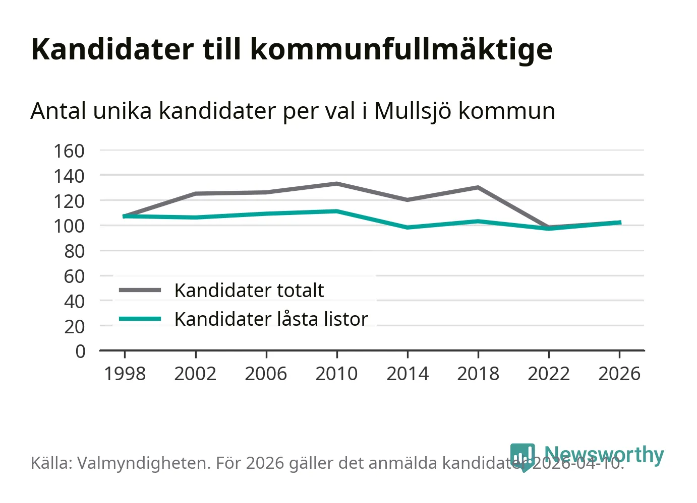 På torsdagen var det deadline för partier med låsta listor att registrera sina kandidater inför höstens val. Till valet till kommunfullmäktige i Mullsjö är 102 kandidater anmälda på sådana listor, vilket är fem fler än i valet 2022.