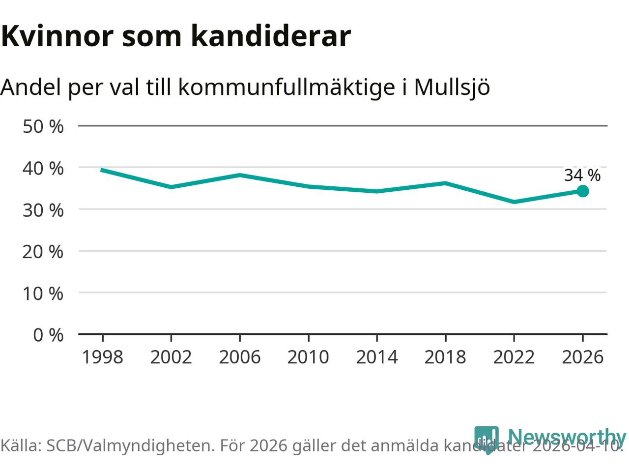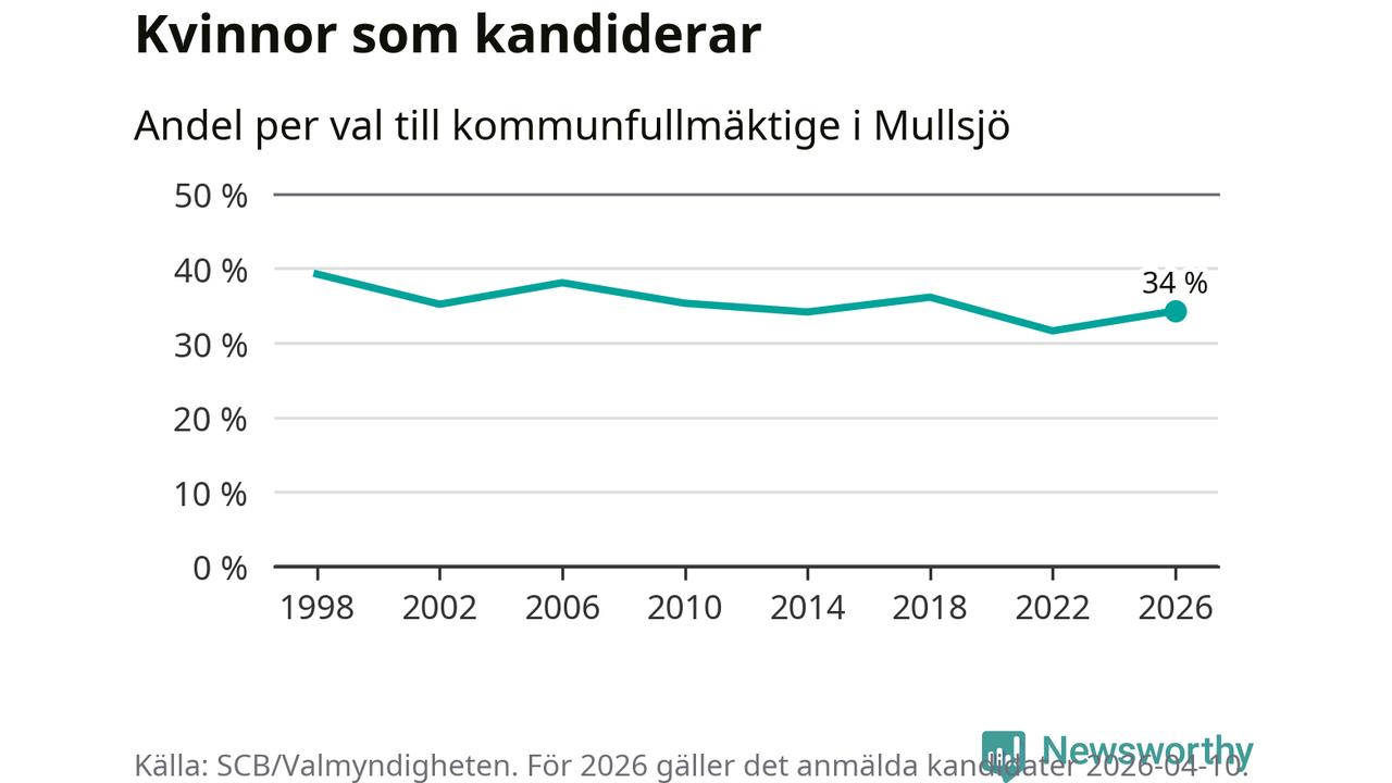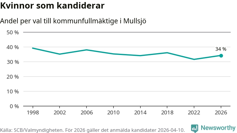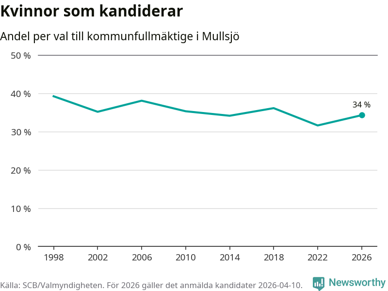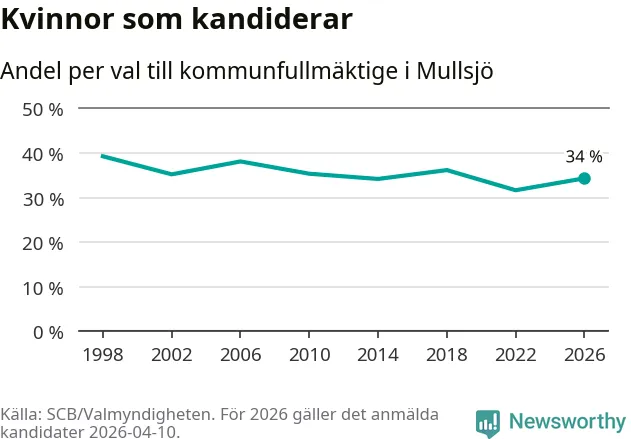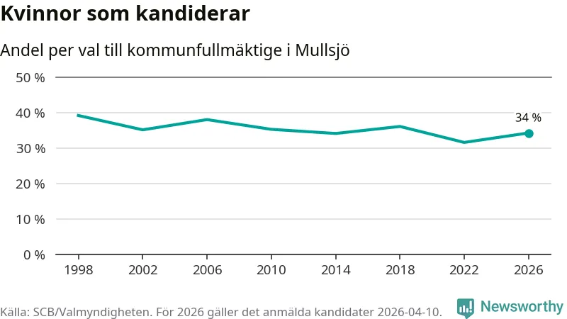Kvinnorna utgör 34 procent av de hittills anmälda kandidaterna. Vid valet 1998 var 39 procent kvinnor, valet 2022 var motsvarande siffra 32 procent. Mullsjö är en av 264 kommuner i landet där männen utgör en majoritet av kandidaterna på listorna.