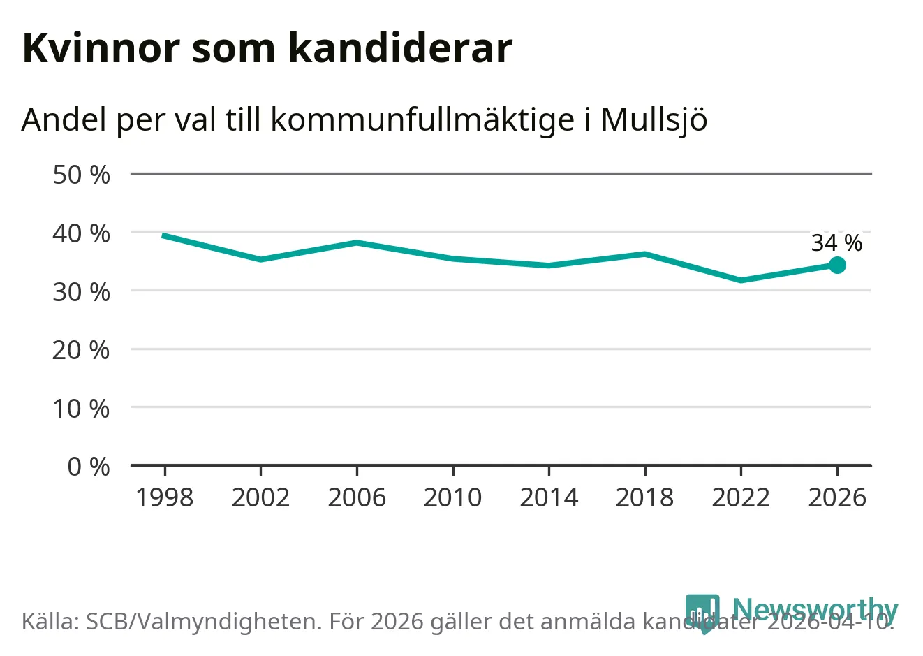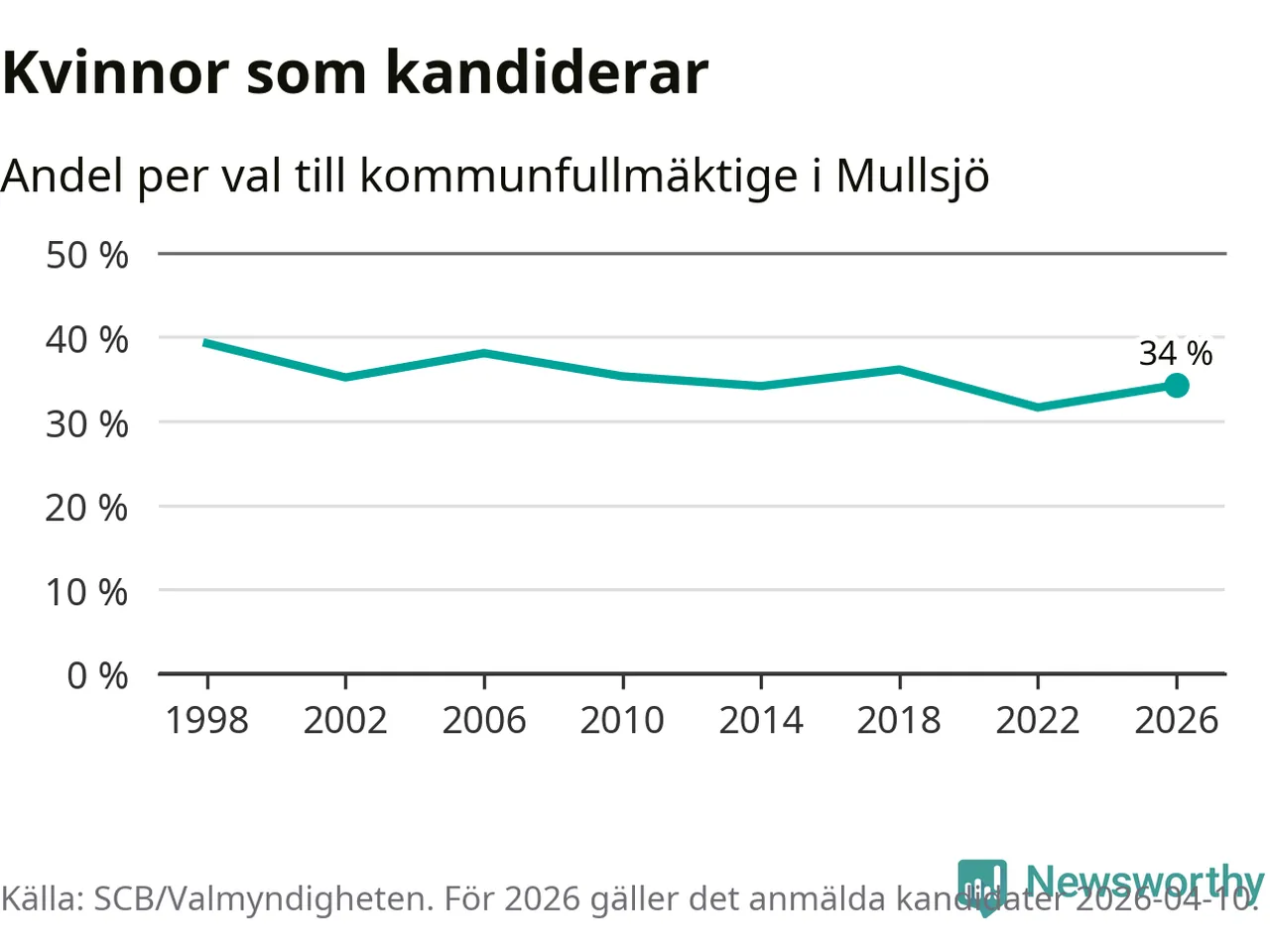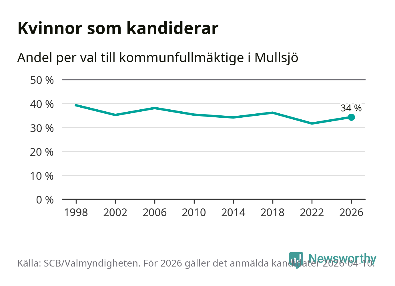 Kvinnorna utgör 34 procent av de hittills anmälda kandidaterna. Vid valet 1998 var 39 procent kvinnor, valet 2022 var motsvarande siffra 32 procent. Mullsjö är en av 264 kommuner i landet där männen utgör en majoritet av kandidaterna på listorna.