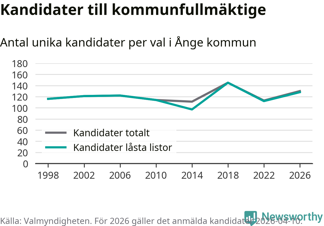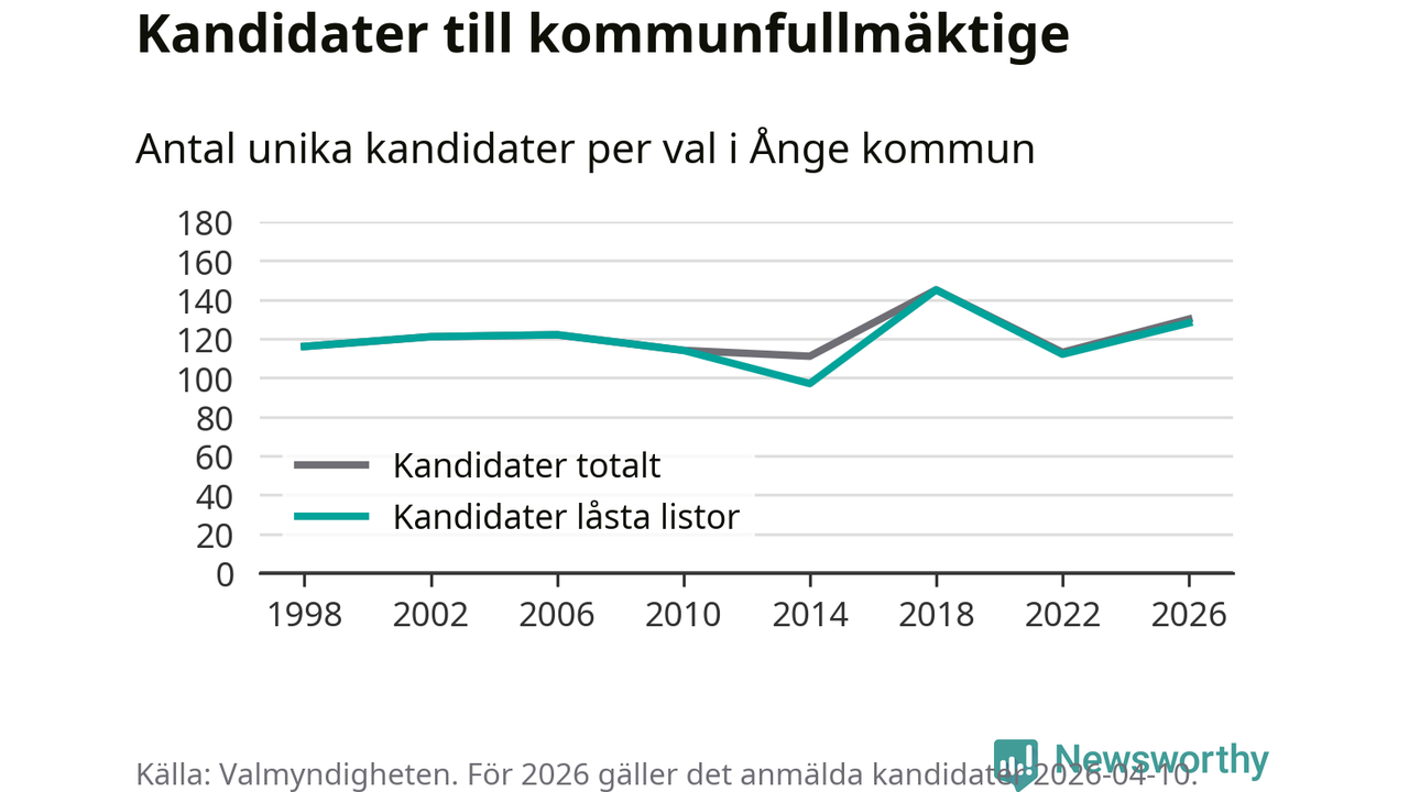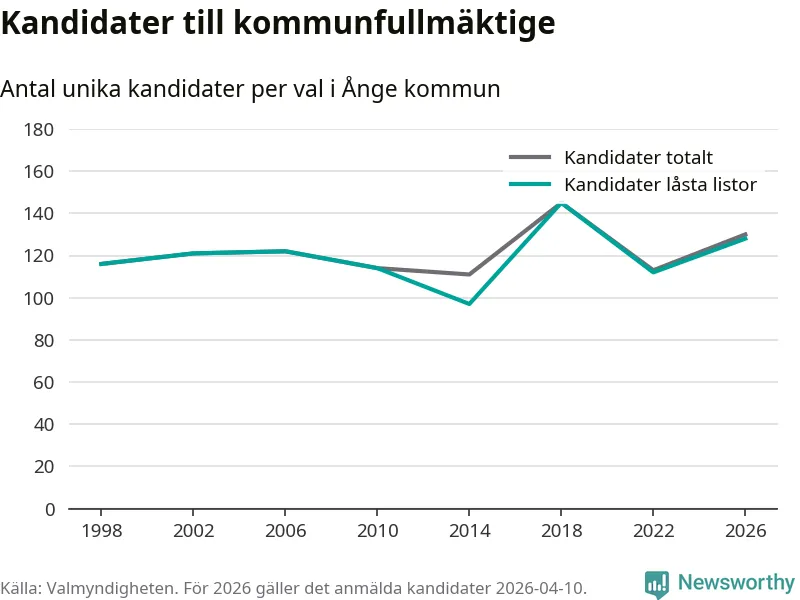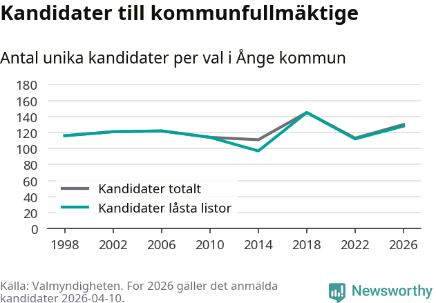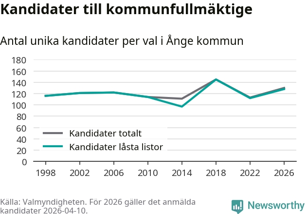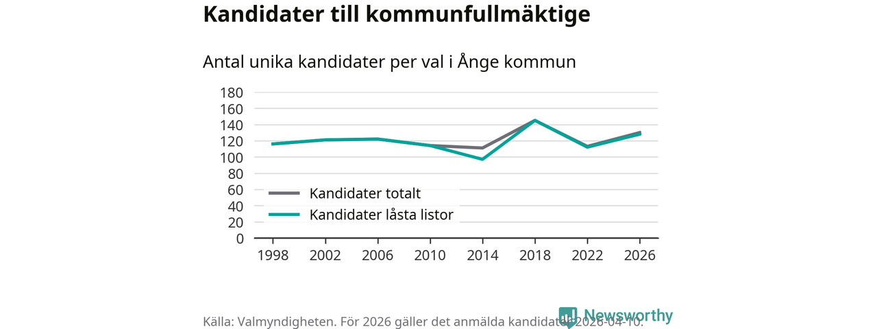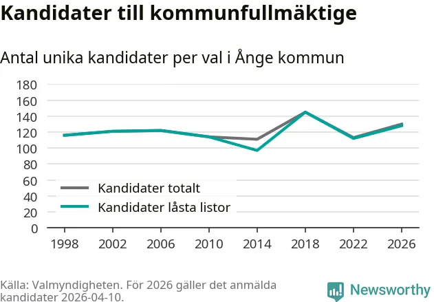 På torsdagen var det deadline för partier med låsta listor att registrera sina kandidater inför höstens val. Till valet till kommunfullmäktige i Ånge är 128 kandidater anmälda på sådana listor, vilket är 16 fler än i valet 2022.