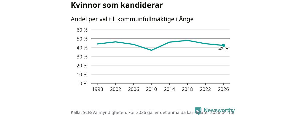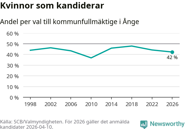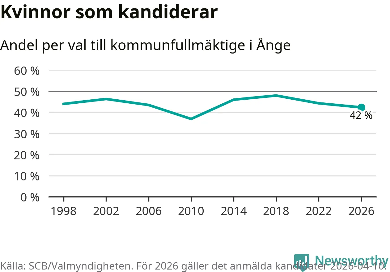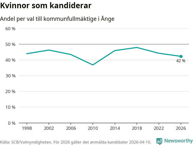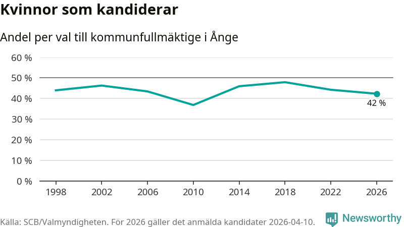 Kvinnorna utgör 42 procent av de hittills anmälda kandidaterna, vilket är den lägsta andelen på listorna till kommunfullmäktige i Ånge sedan valet 2010. Vid valet 2018 var 48 procent kvinnor, valet 2010 var motsvarande siffra 37 procent. Ånge är en av 264 kommuner i landet där männen utgör en majoritet av kandidaterna på listorna.
