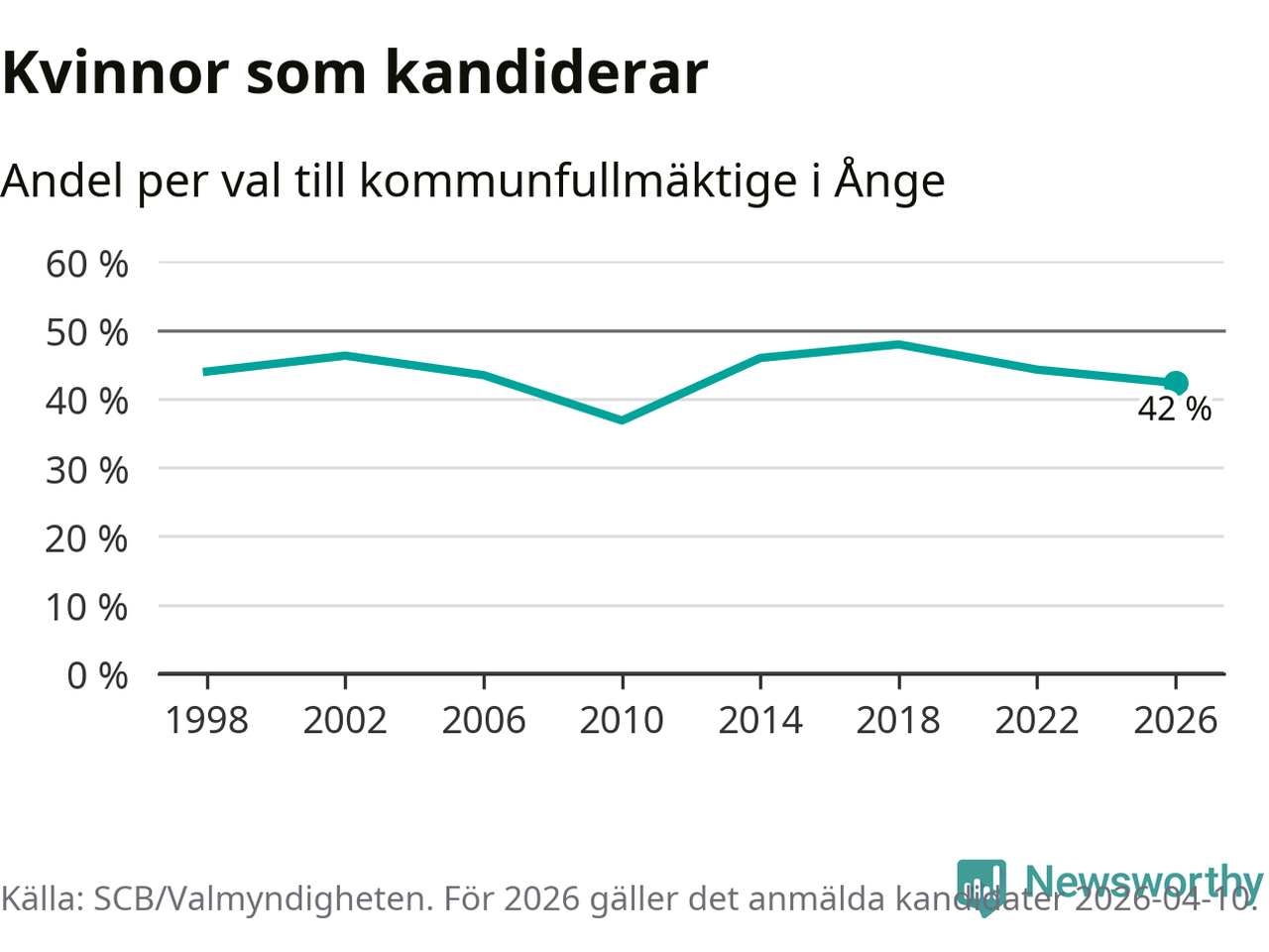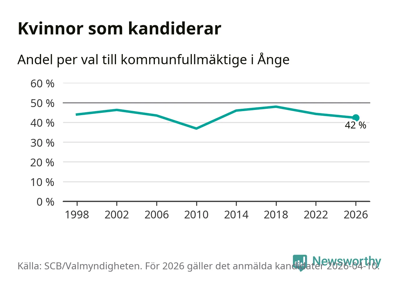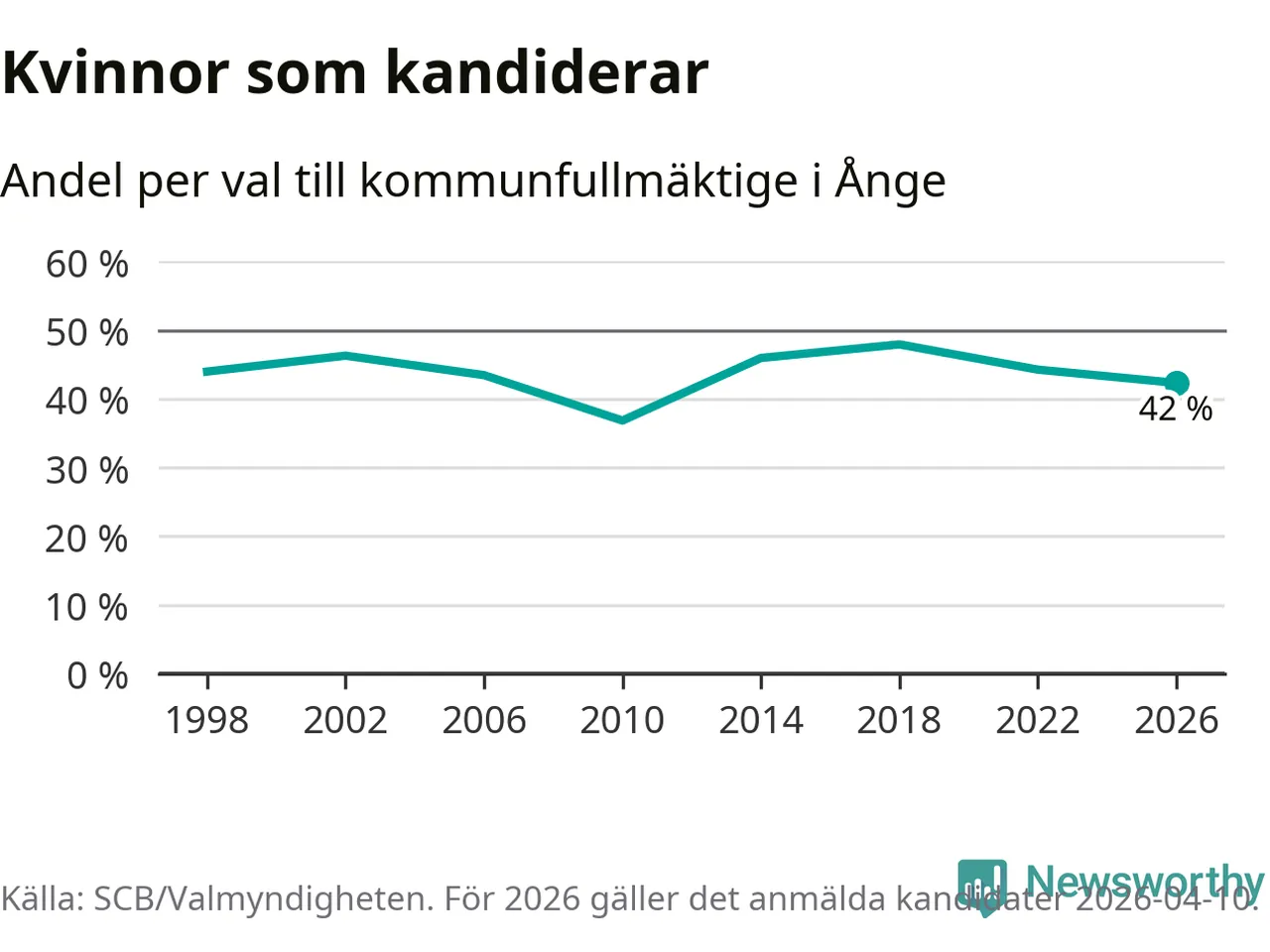 Kvinnorna utgör 42 procent av de hittills anmälda kandidaterna, vilket är den lägsta andelen på listorna till kommunfullmäktige i Ånge sedan valet 2010. Vid valet 2018 var 48 procent kvinnor, valet 2010 var motsvarande siffra 37 procent. Ånge är en av 264 kommuner i landet där männen utgör en majoritet av kandidaterna på listorna.