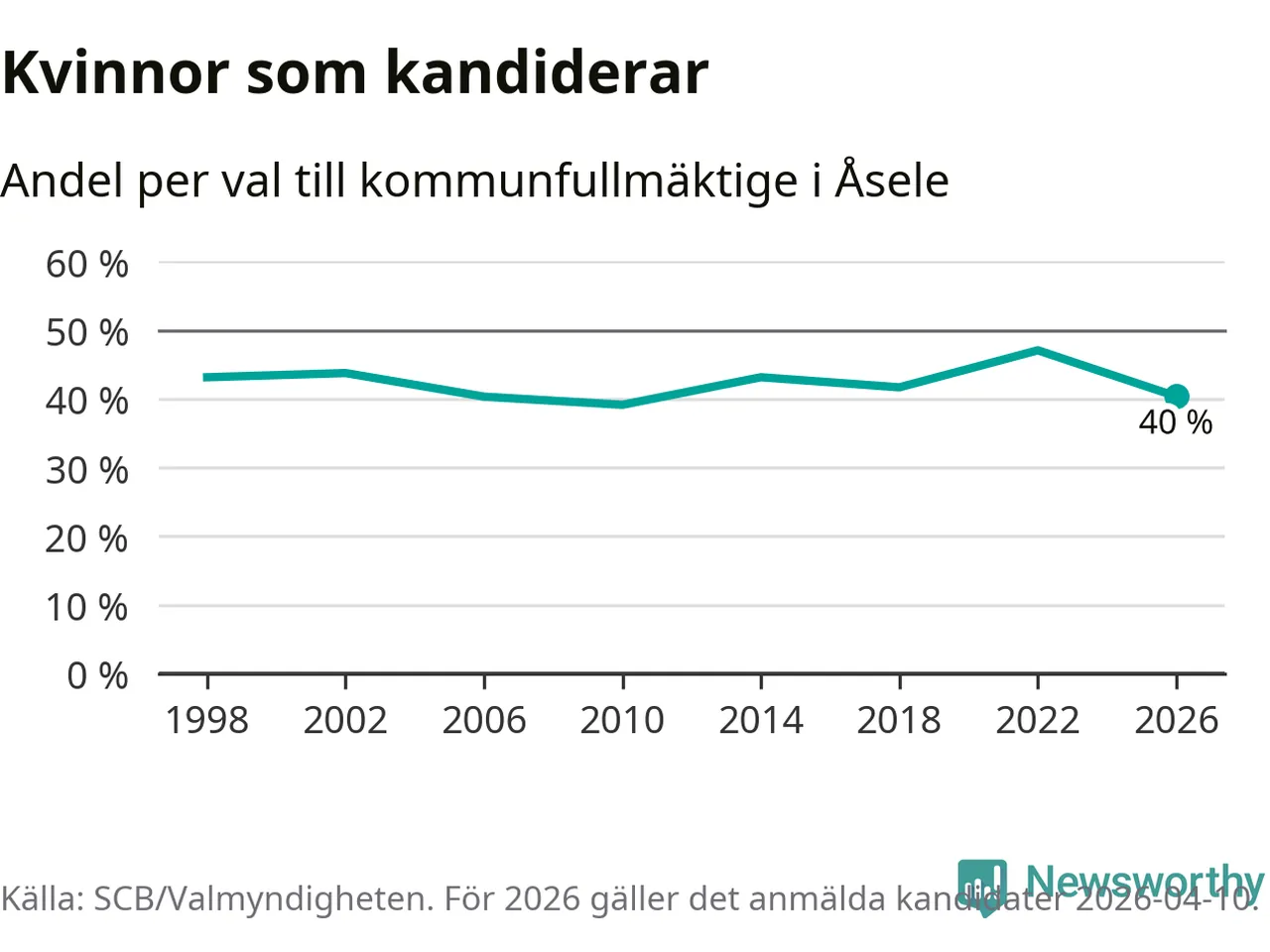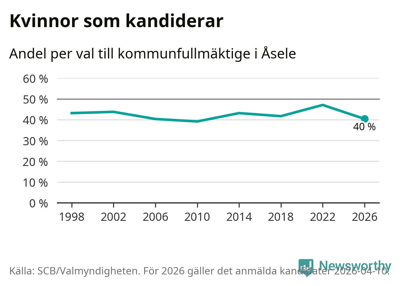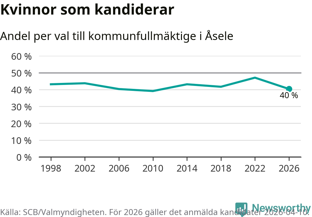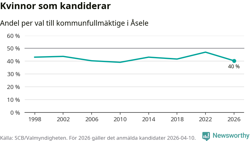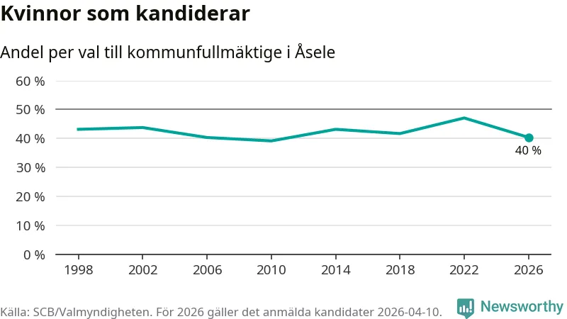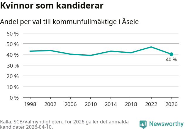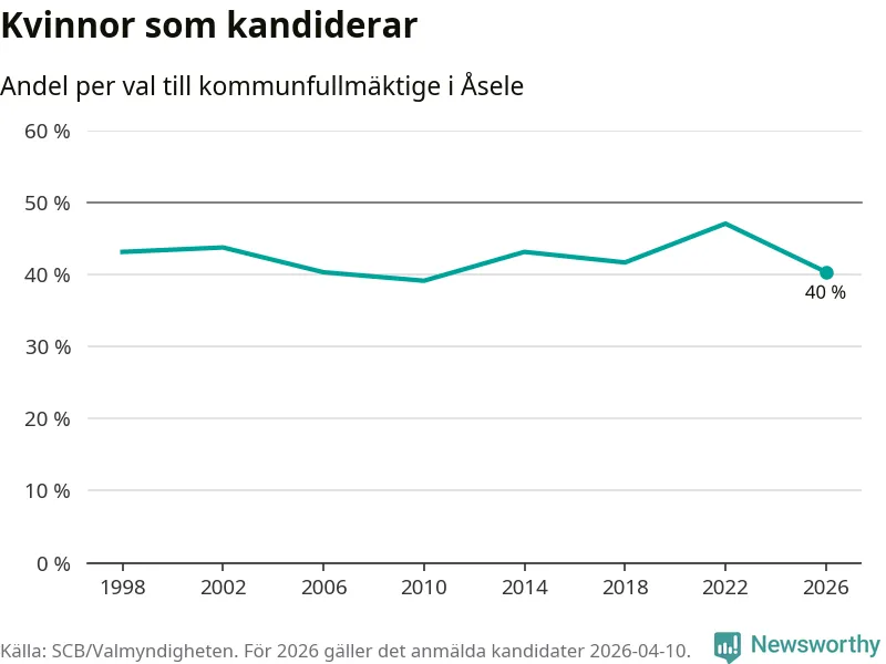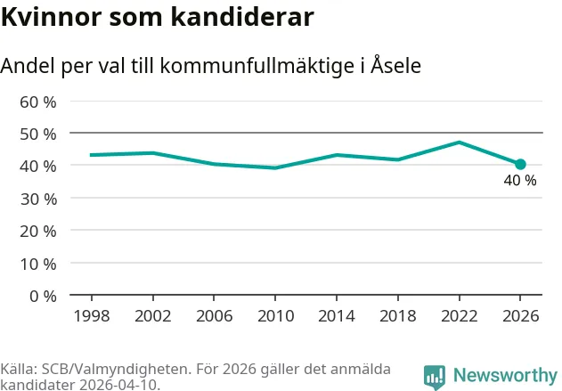 Kvinnorna utgör 40 procent av de hittills anmälda kandidaterna, vilket är den lägsta andelen på listorna till kommunfullmäktige i Åsele sedan valet 2010. Vid valet 2022 var 47 procent kvinnor, valet 2010 var motsvarande siffra 39 procent. Åsele är en av 264 kommuner i landet där männen utgör en majoritet av kandidaterna på listorna.