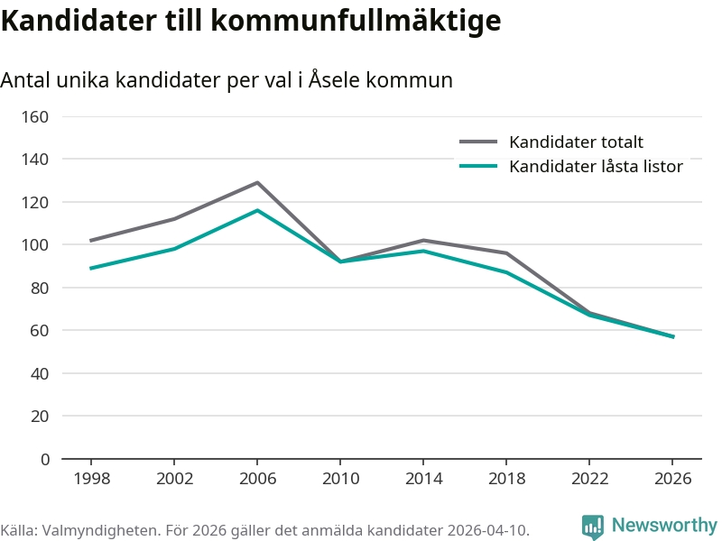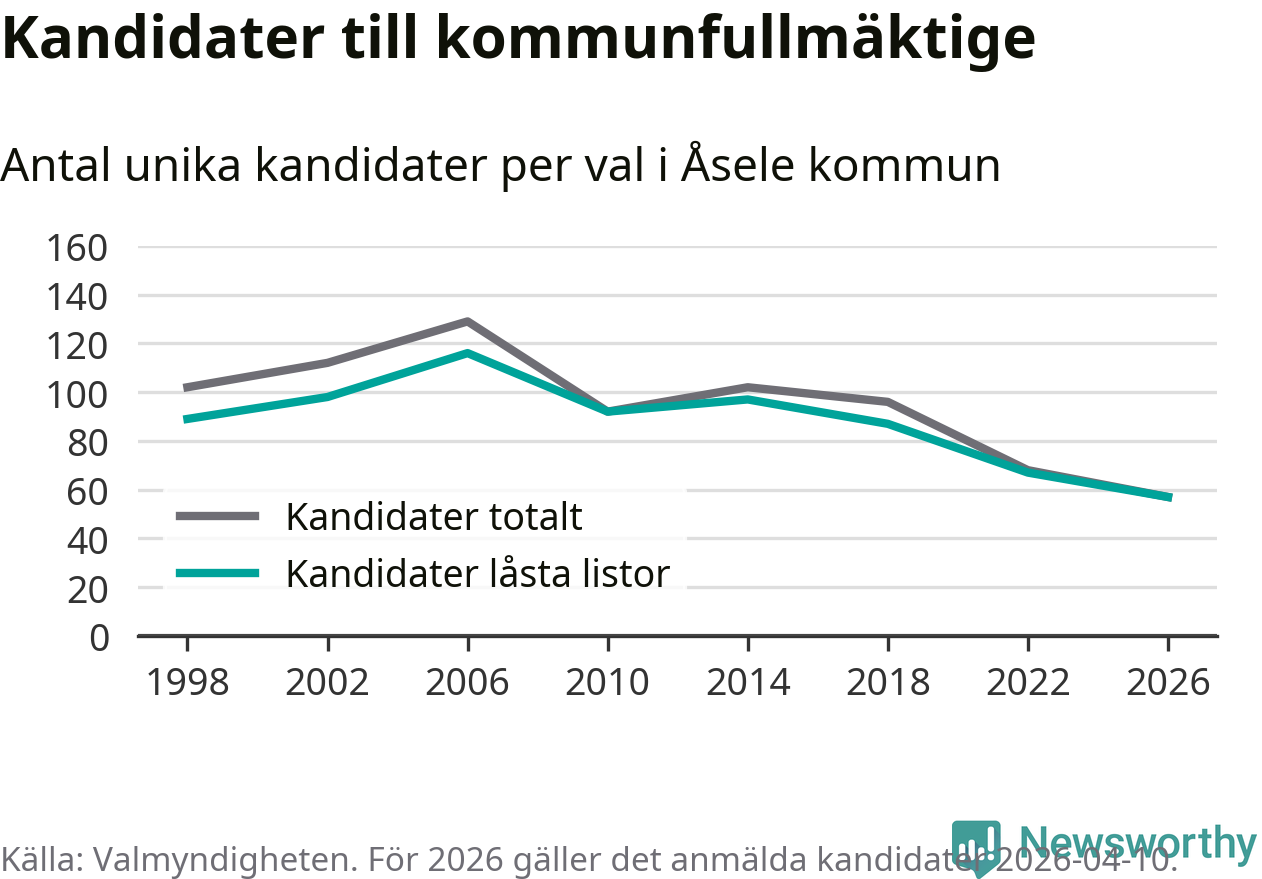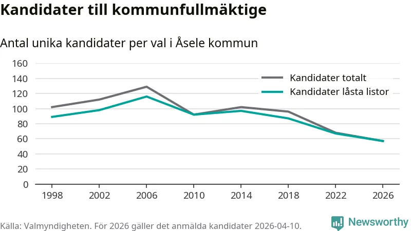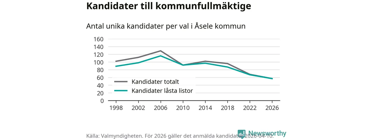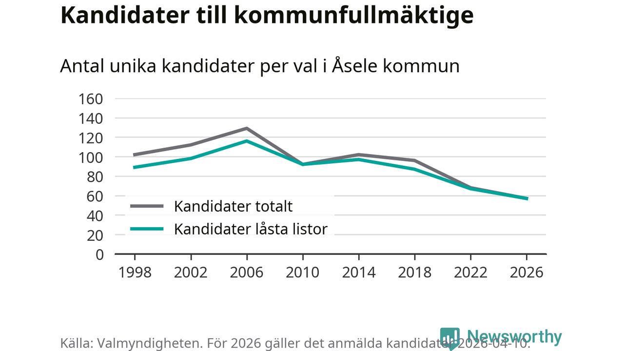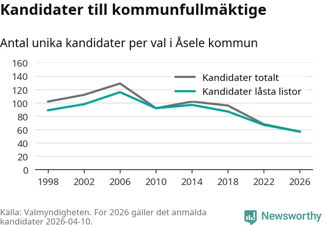 På torsdagen var det deadline för partier med låsta listor att registrera sina kandidater inför höstens val. Till valet till kommunfullmäktige i Åsele är 57 kandidater anmälda på sådana listor, vilket är tio färre än i valet 2022. Det är den lägsta siffran sedan åtminstone valet 1998, vilket är så långt tillbaka som vi har statistik för.
