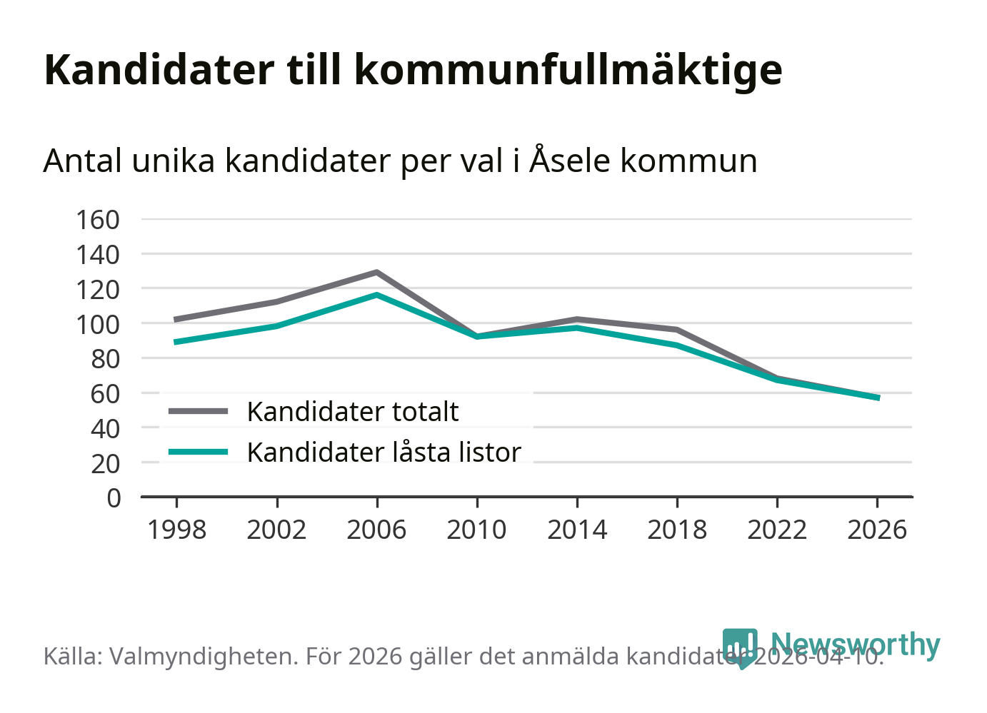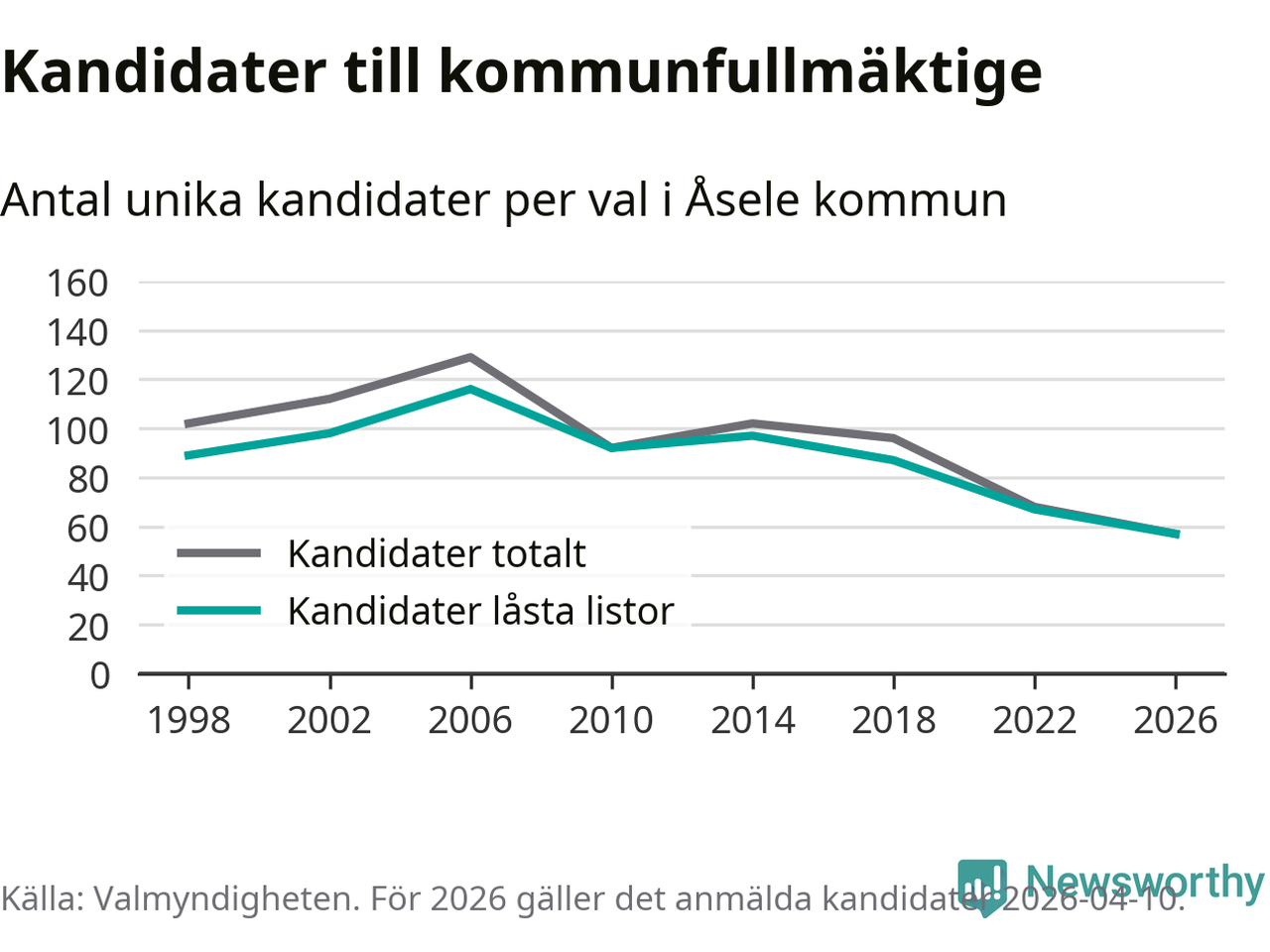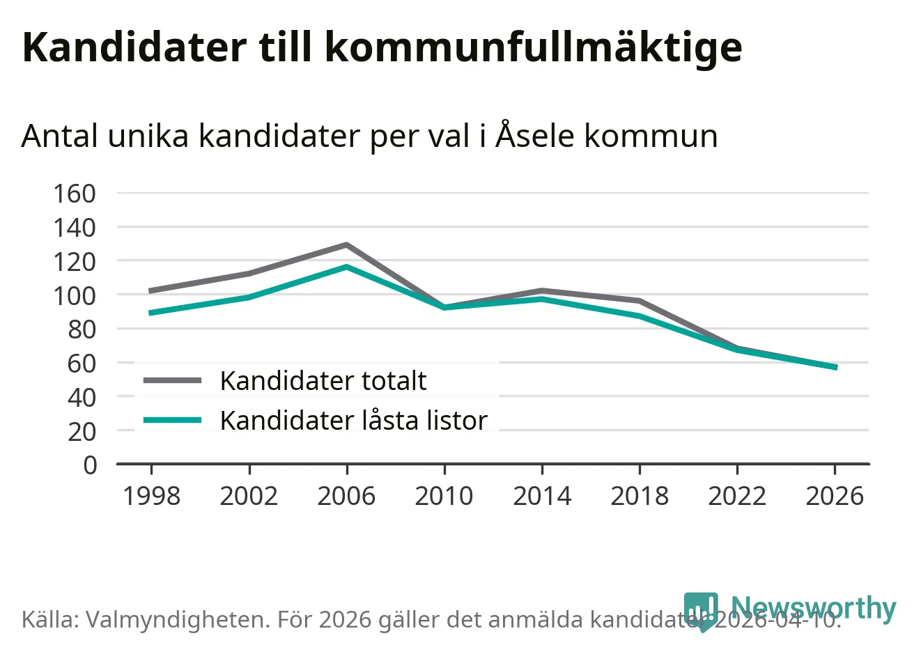 På torsdagen var det deadline för partier med låsta listor att registrera sina kandidater inför höstens val. Till valet till kommunfullmäktige i Åsele är 57 kandidater anmälda på sådana listor, vilket är tio färre än i valet 2022. Det är den lägsta siffran sedan åtminstone valet 1998, vilket är så långt tillbaka som vi har statistik för.
