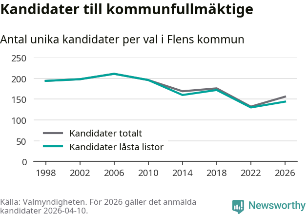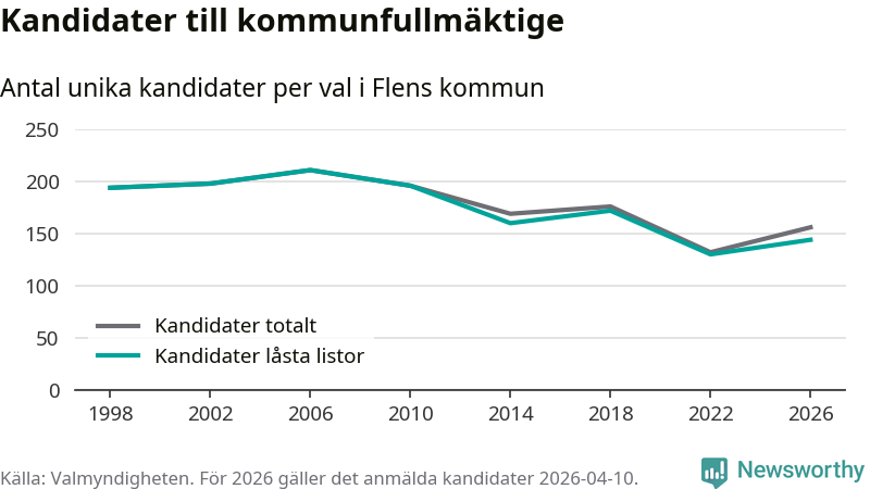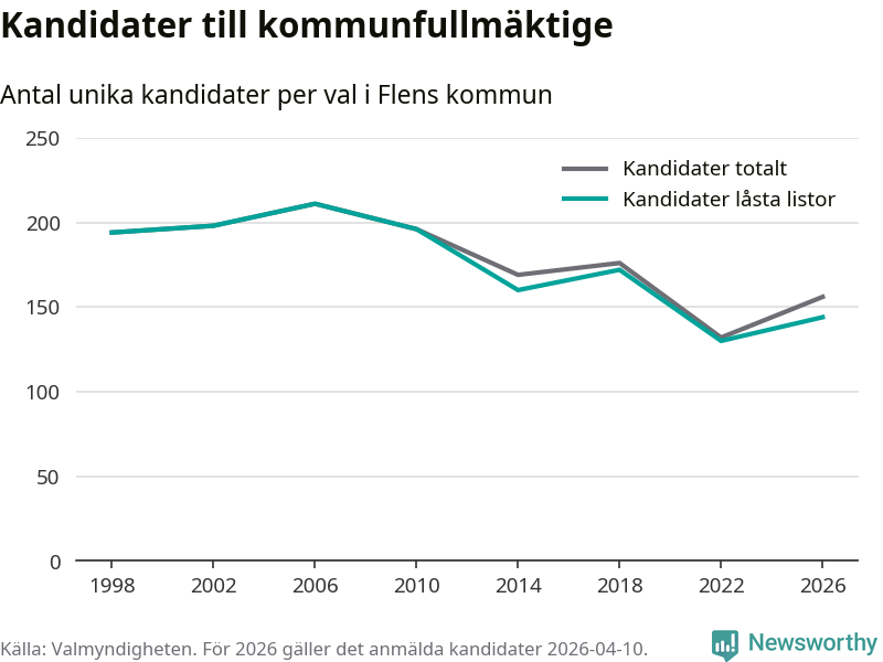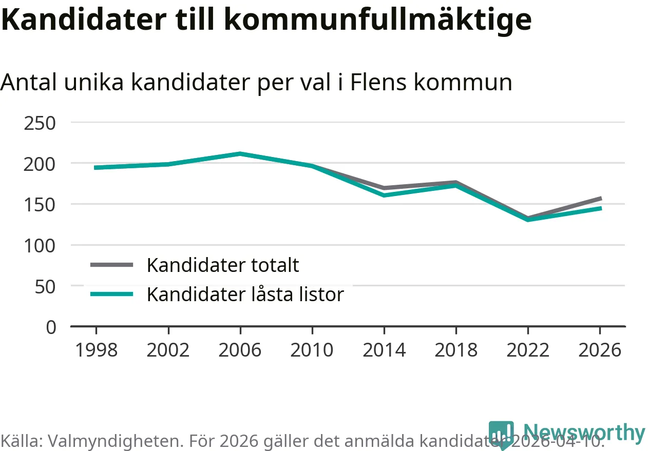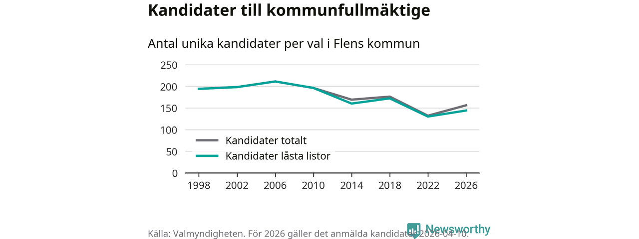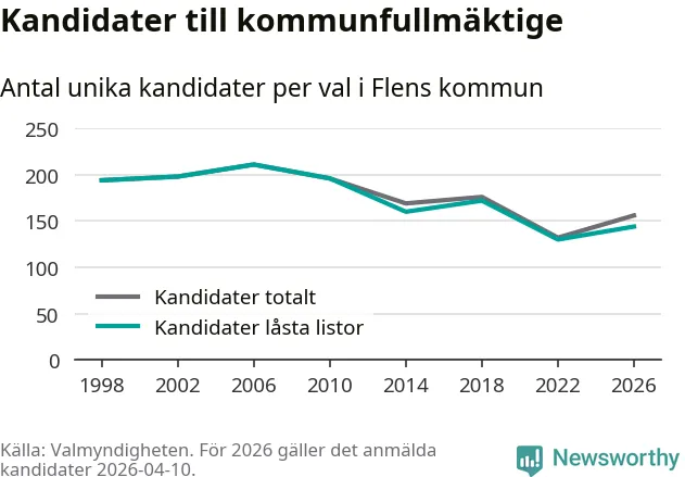 Att listan är låst innebär att partiet redan har anmält sina kandidater och bestämt ordningen på listan och att väljare inte kan lägga till egna kandidater. På öppna listor kan kandidater läggas till fram till dagarna före valet och vem som helst kan anmäla sig som kandidat. De senaste valen har drygt nio av tio kandidater anmälts på låsta listor. I valet till kommunfullmäktige i Flen 2022 fanns i princip alla kandidater på låsta listor. Hittills i år finns tolv kandidater på öppna listor. Totalt rör det sig alltså om 156 kandidater till höstens val.