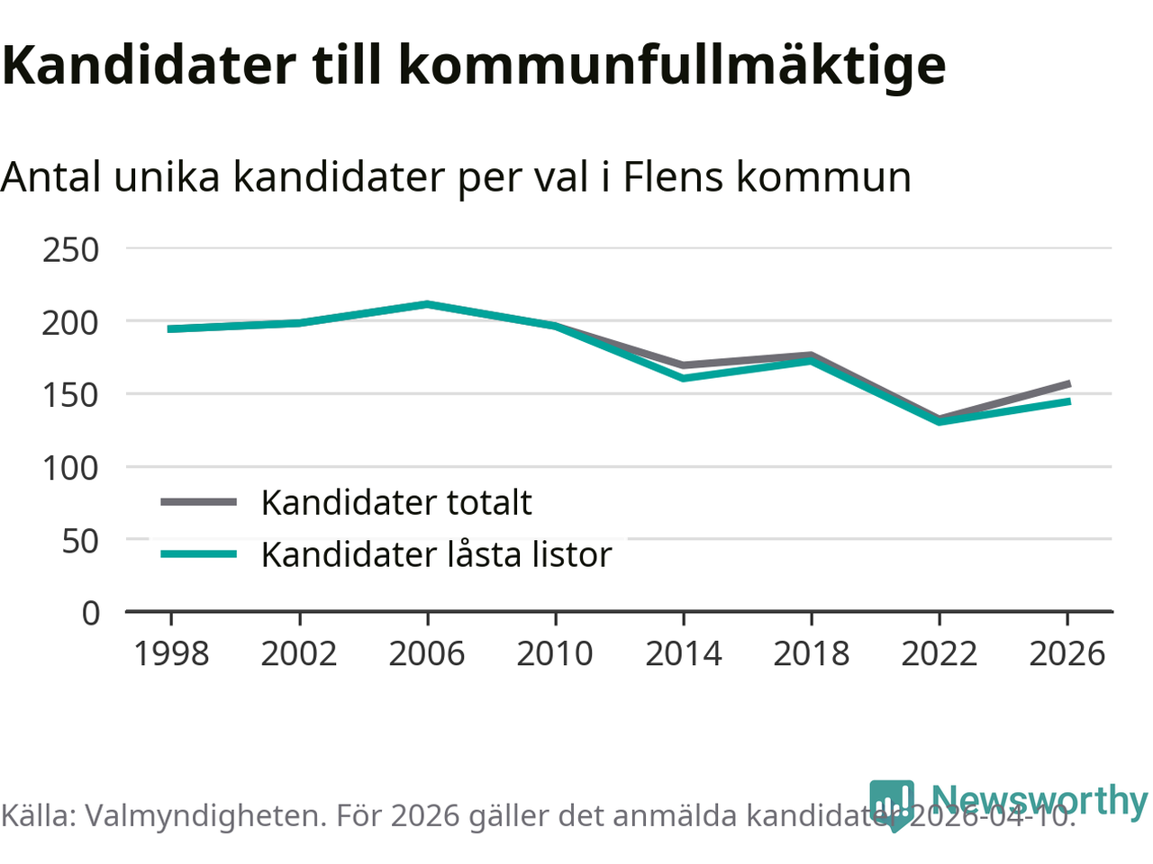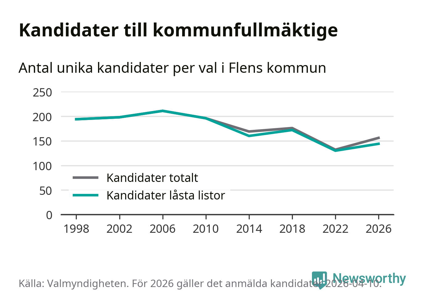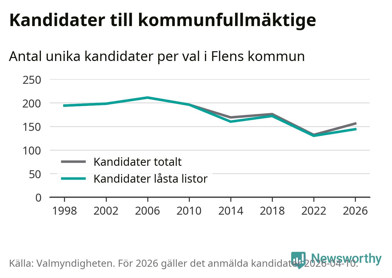 Att listan är låst innebär att partiet redan har anmält sina kandidater och bestämt ordningen på listan och att väljare inte kan lägga till egna kandidater. På öppna listor kan kandidater läggas till fram till dagarna före valet och vem som helst kan anmäla sig som kandidat. De senaste valen har drygt nio av tio kandidater anmälts på låsta listor. I valet till kommunfullmäktige i Flen 2022 fanns i princip alla kandidater på låsta listor. Hittills i år finns tolv kandidater på öppna listor. Totalt rör det sig alltså om 156 kandidater till höstens val.