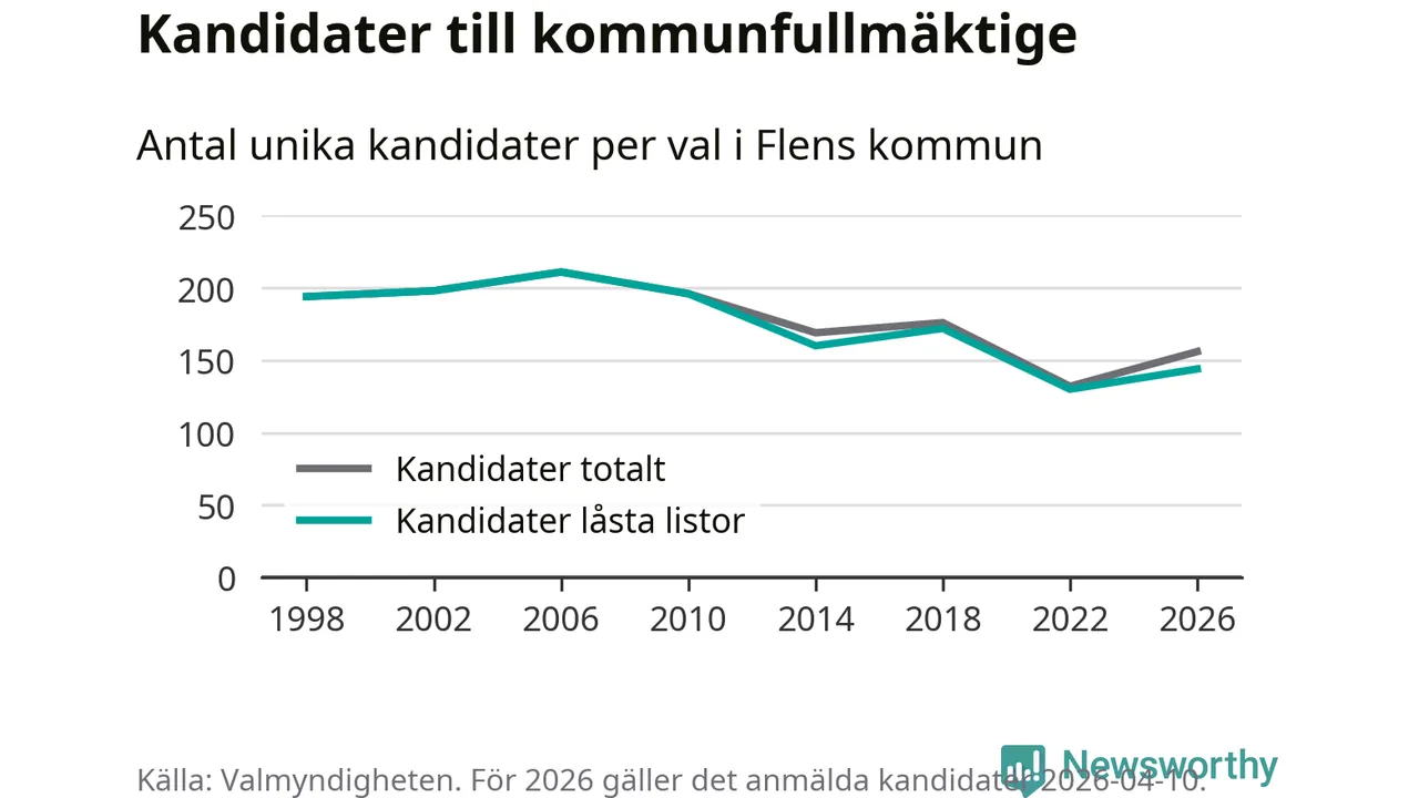 På torsdagen var det deadline för partier med låsta listor att registrera sina kandidater inför höstens val. Till valet till kommunfullmäktige i Flen är 144 kandidater anmälda på sådana listor, vilket är 14 fler än i valet 2022.