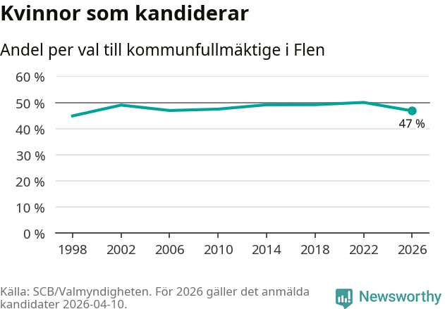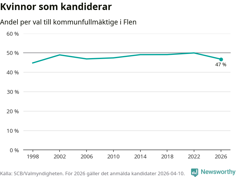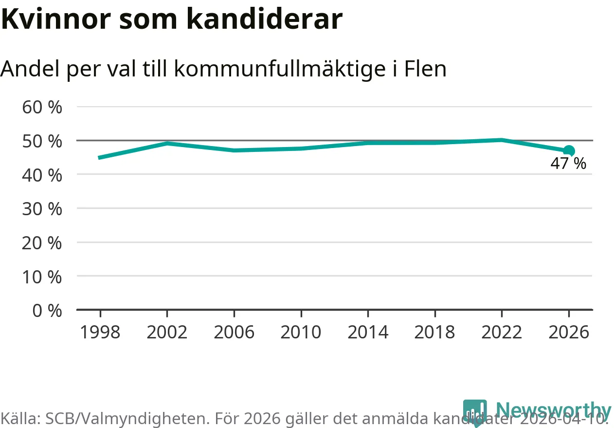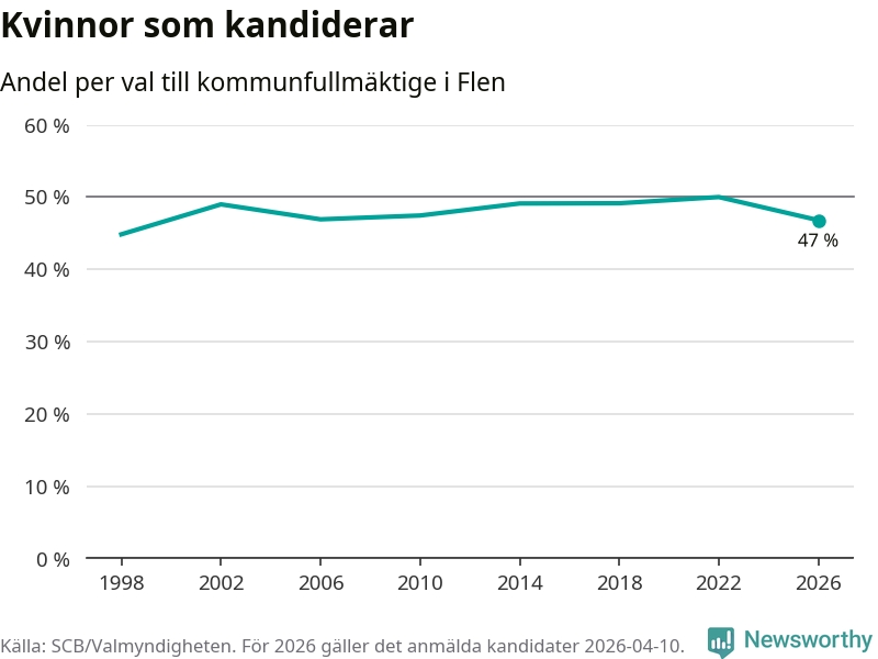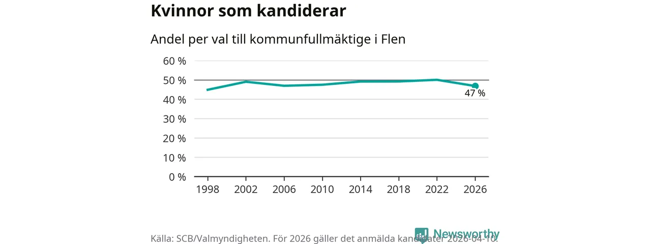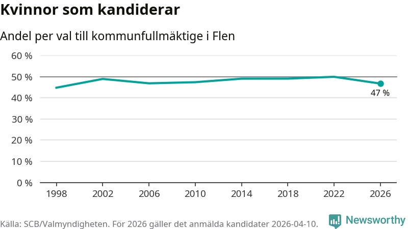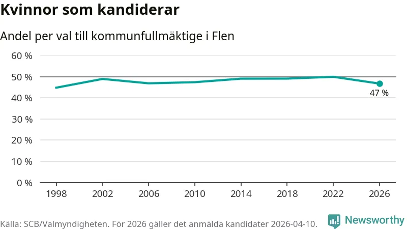 Kvinnorna utgör 47 procent av de hittills anmälda kandidaterna, vilket är den lägsta andelen på listorna till kommunfullmäktige i Flen sedan valet 1998. Vid valet 2022 var 50 procent kvinnor, valet 1998 var motsvarande siffra 45 procent. Flen är en av 264 kommuner i landet där männen utgör en majoritet av kandidaterna på listorna.