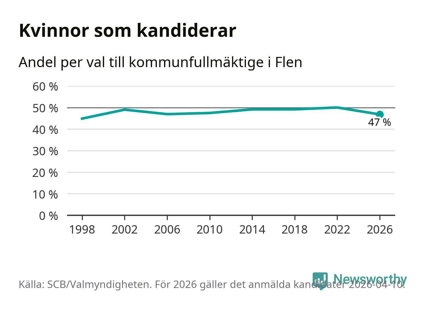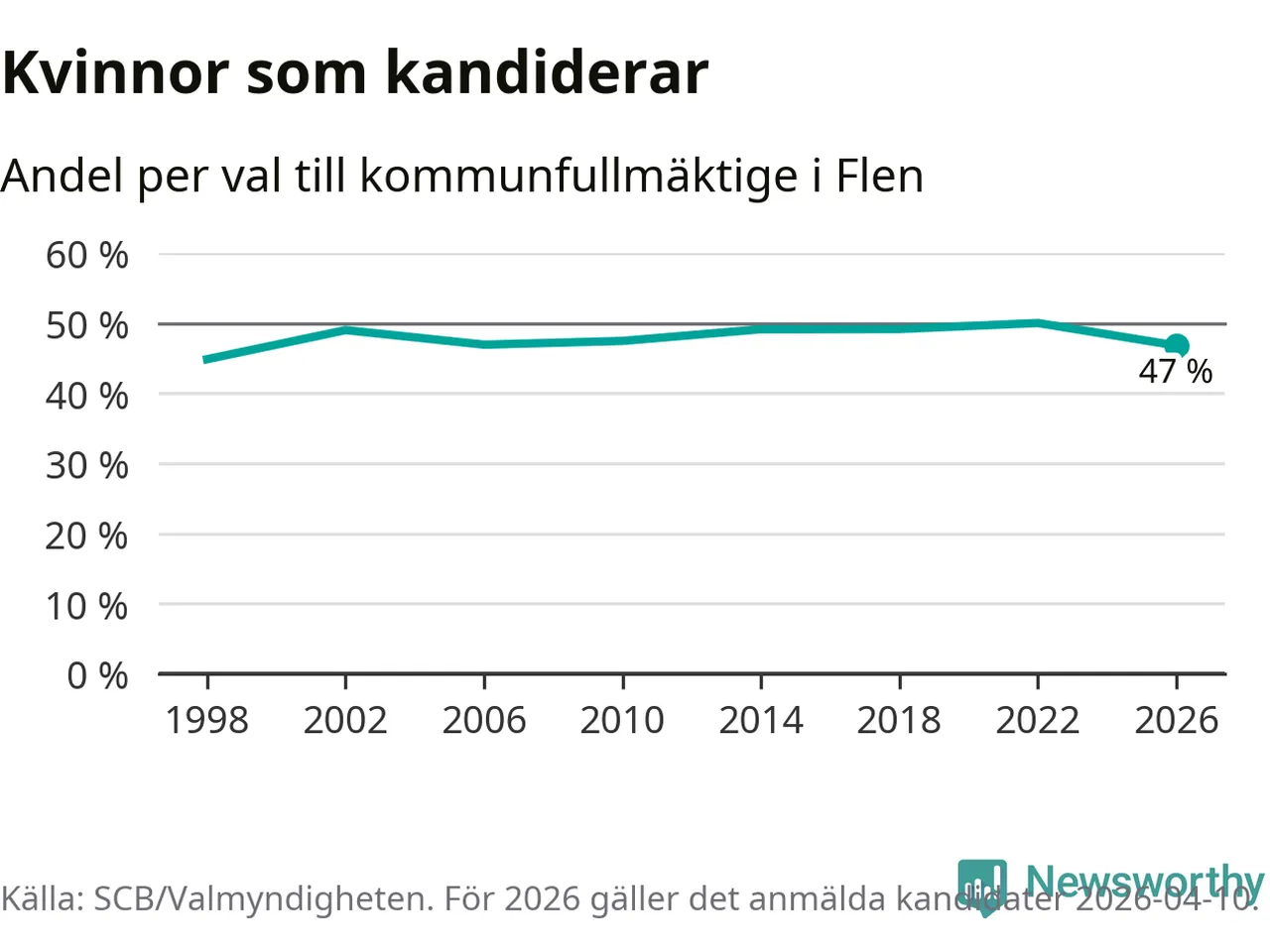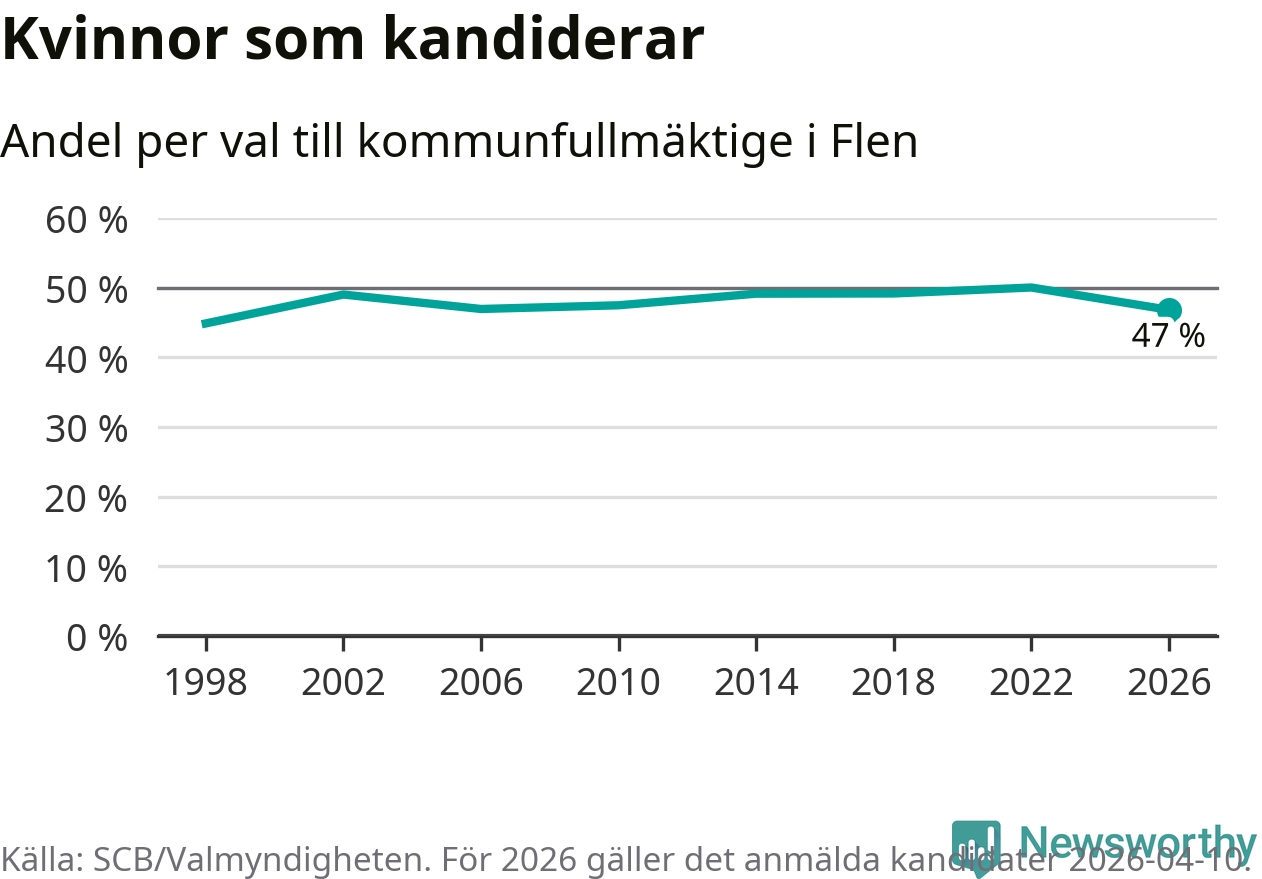 Kvinnorna utgör 47 procent av de hittills anmälda kandidaterna, vilket är den lägsta andelen på listorna till kommunfullmäktige i Flen sedan valet 1998. Vid valet 2022 var 50 procent kvinnor, valet 1998 var motsvarande siffra 45 procent. Flen är en av 264 kommuner i landet där männen utgör en majoritet av kandidaterna på listorna.