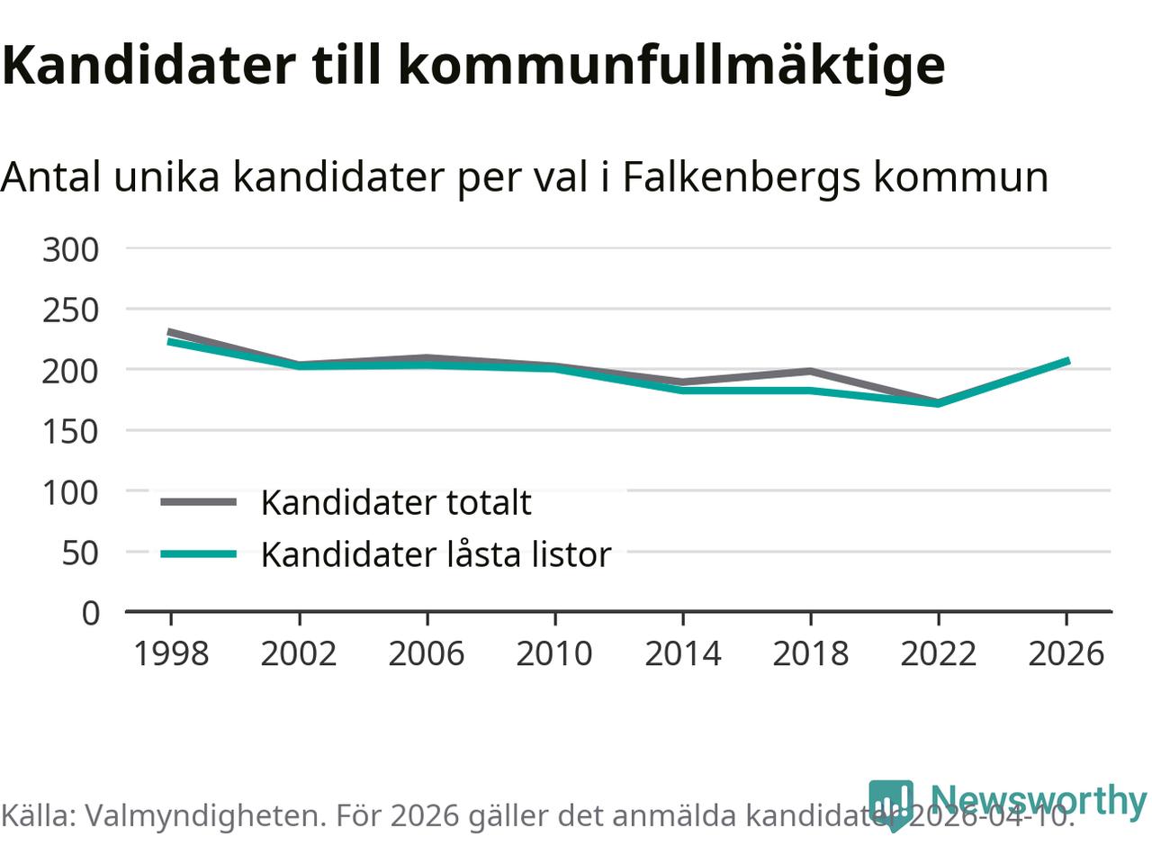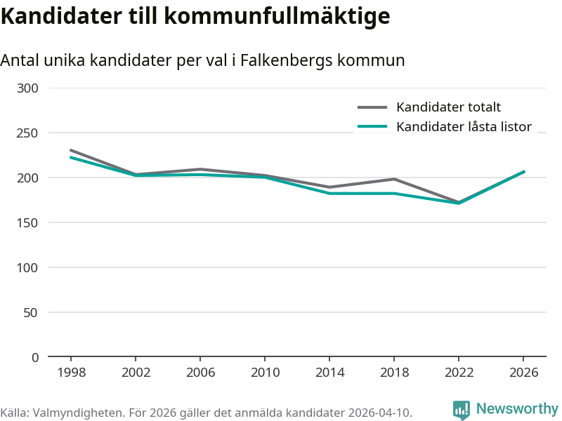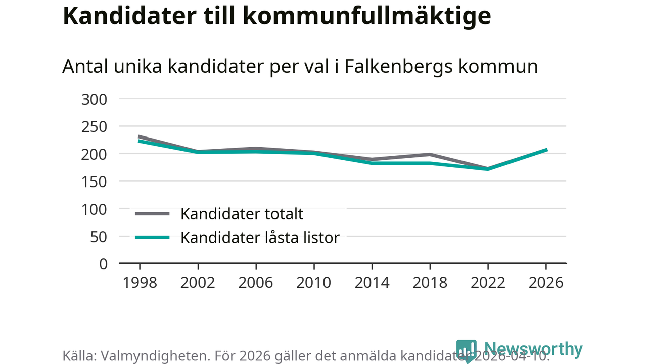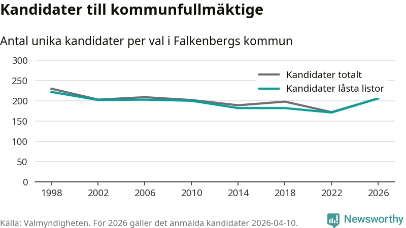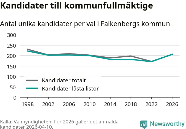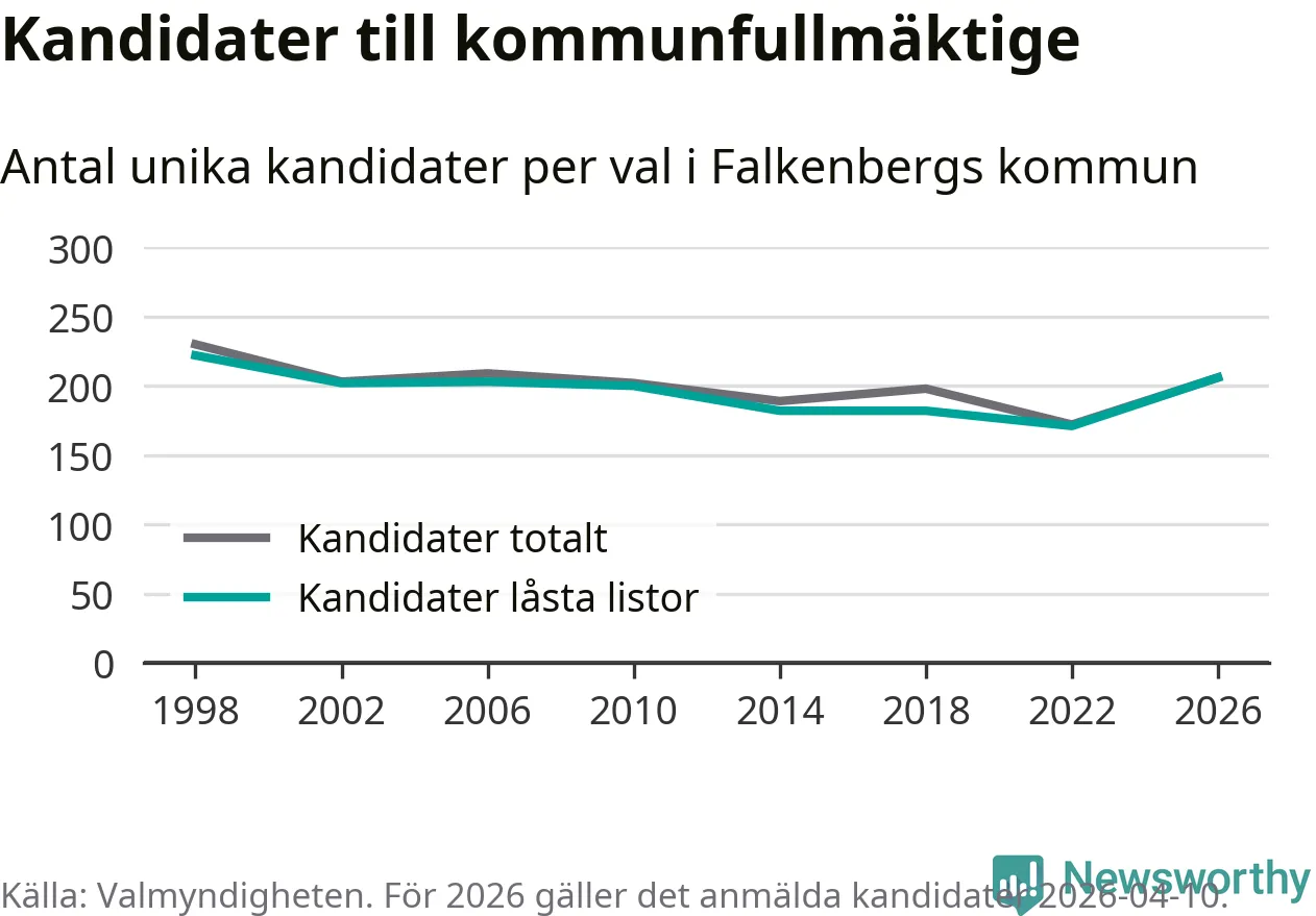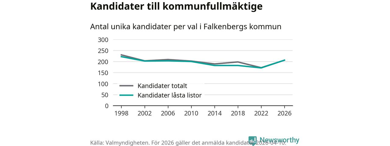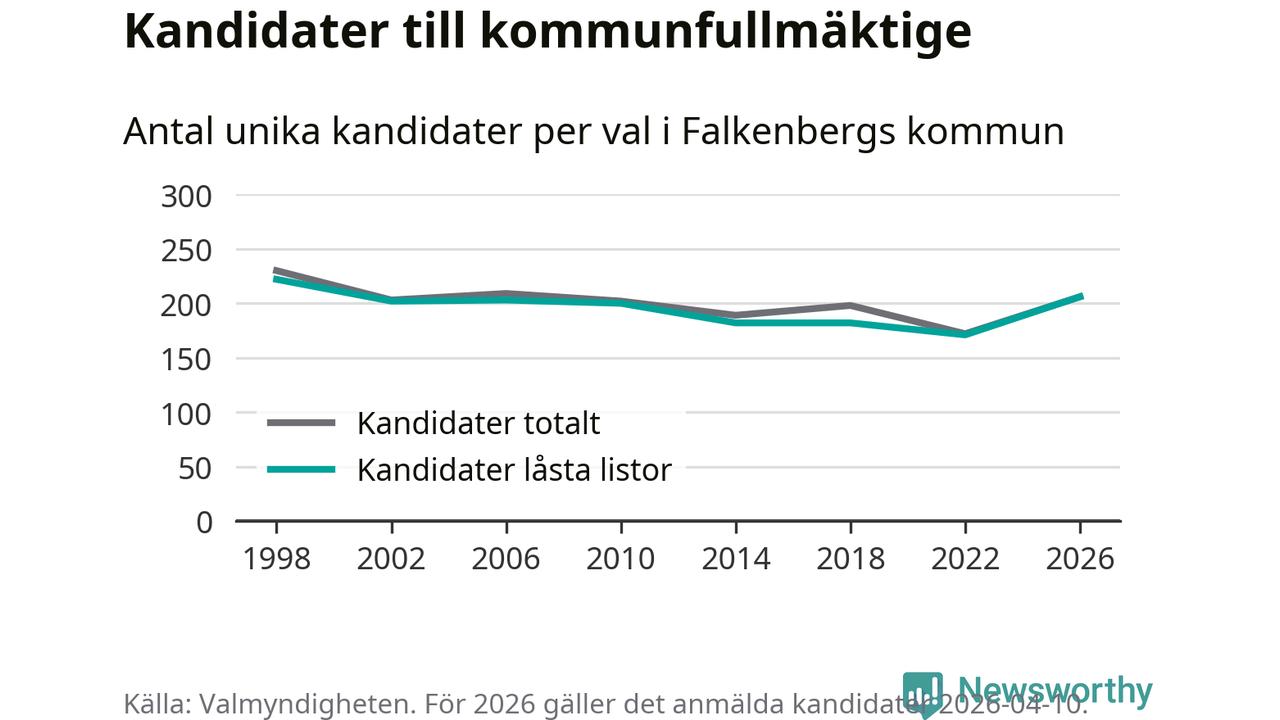 På torsdagen var det deadline för partier med låsta listor att registrera sina kandidater inför höstens val. Till valet till kommunfullmäktige i Falkenberg är 206 kandidater anmälda på sådana listor, vilket är 35 fler än i valet 2022.