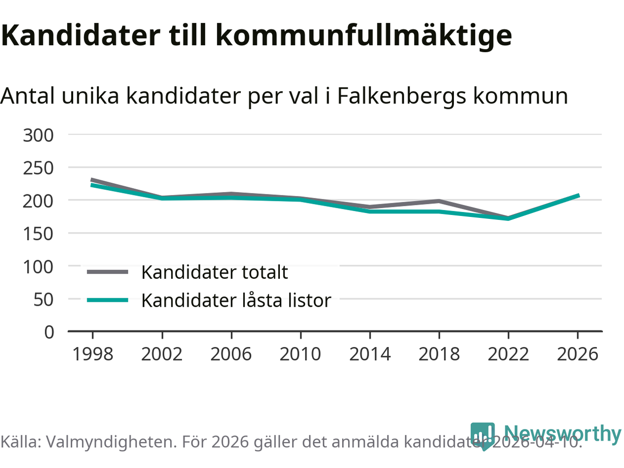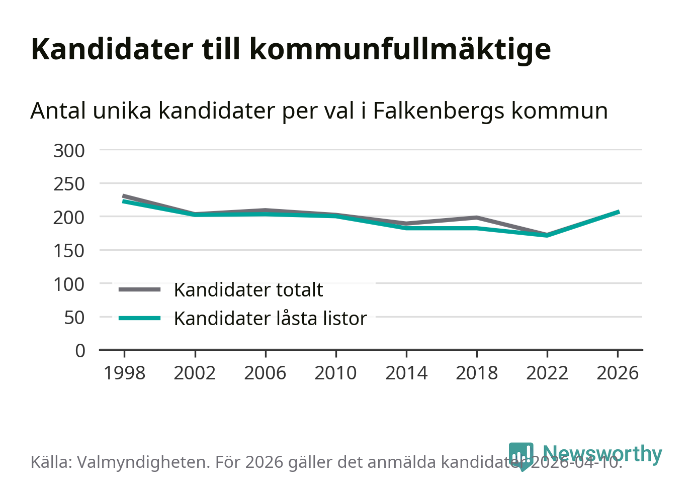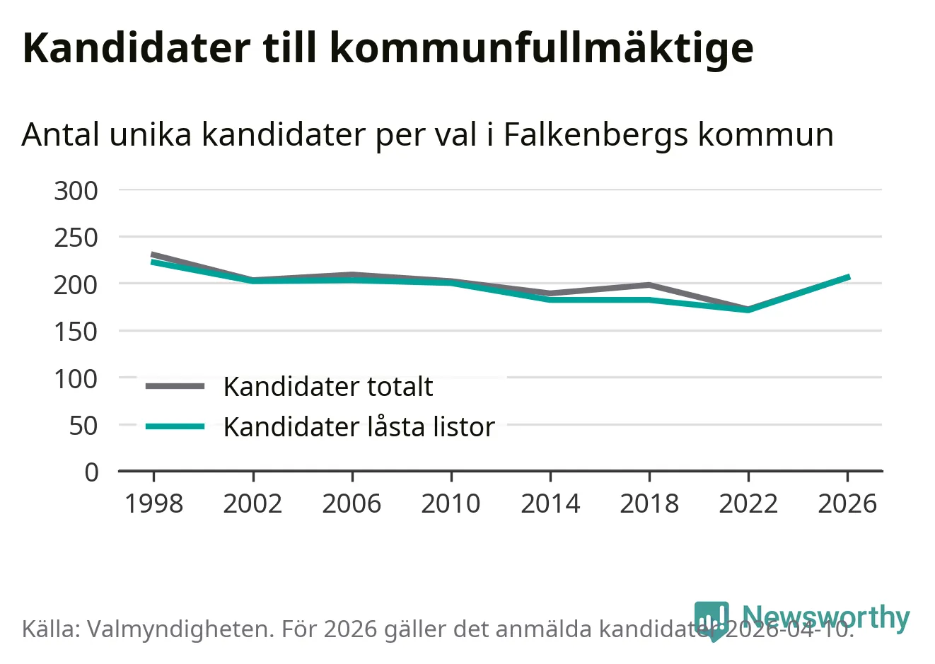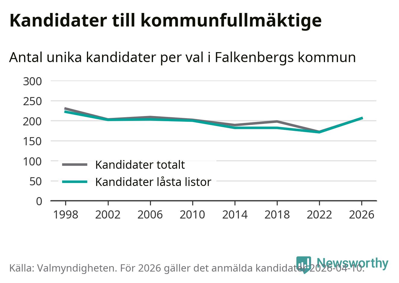På torsdagen var det deadline för partier med låsta listor att registrera sina kandidater inför höstens val. Till valet till kommunfullmäktige i Falkenberg är 206 kandidater anmälda på sådana listor, vilket är 35 fler än i valet 2022.