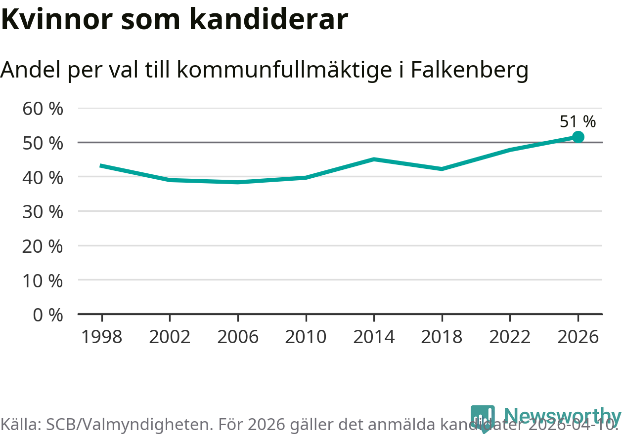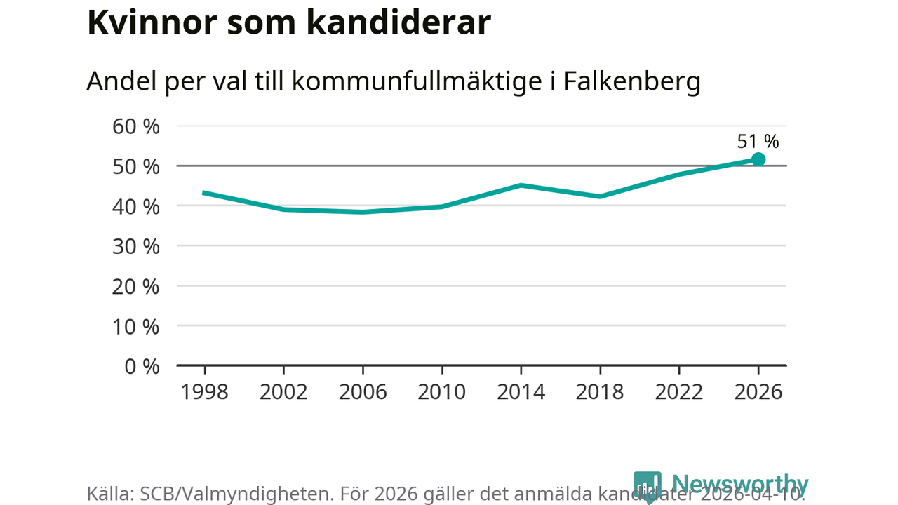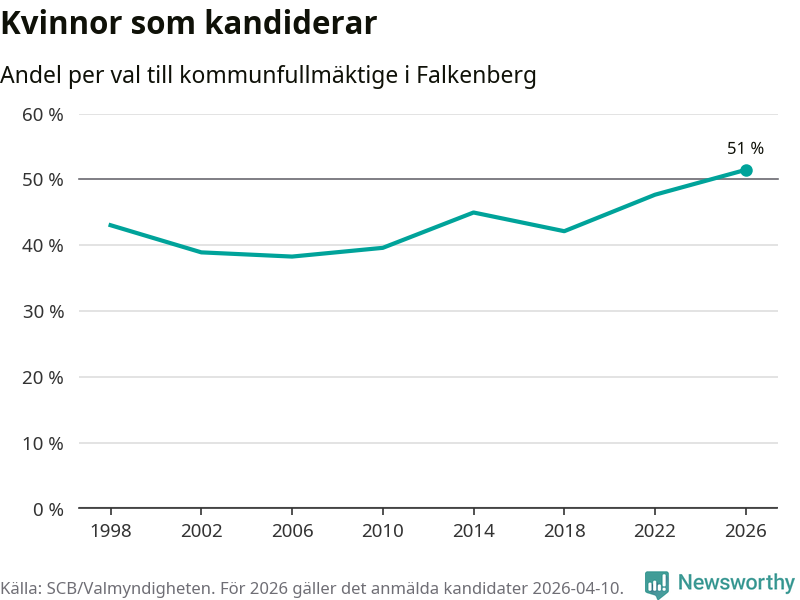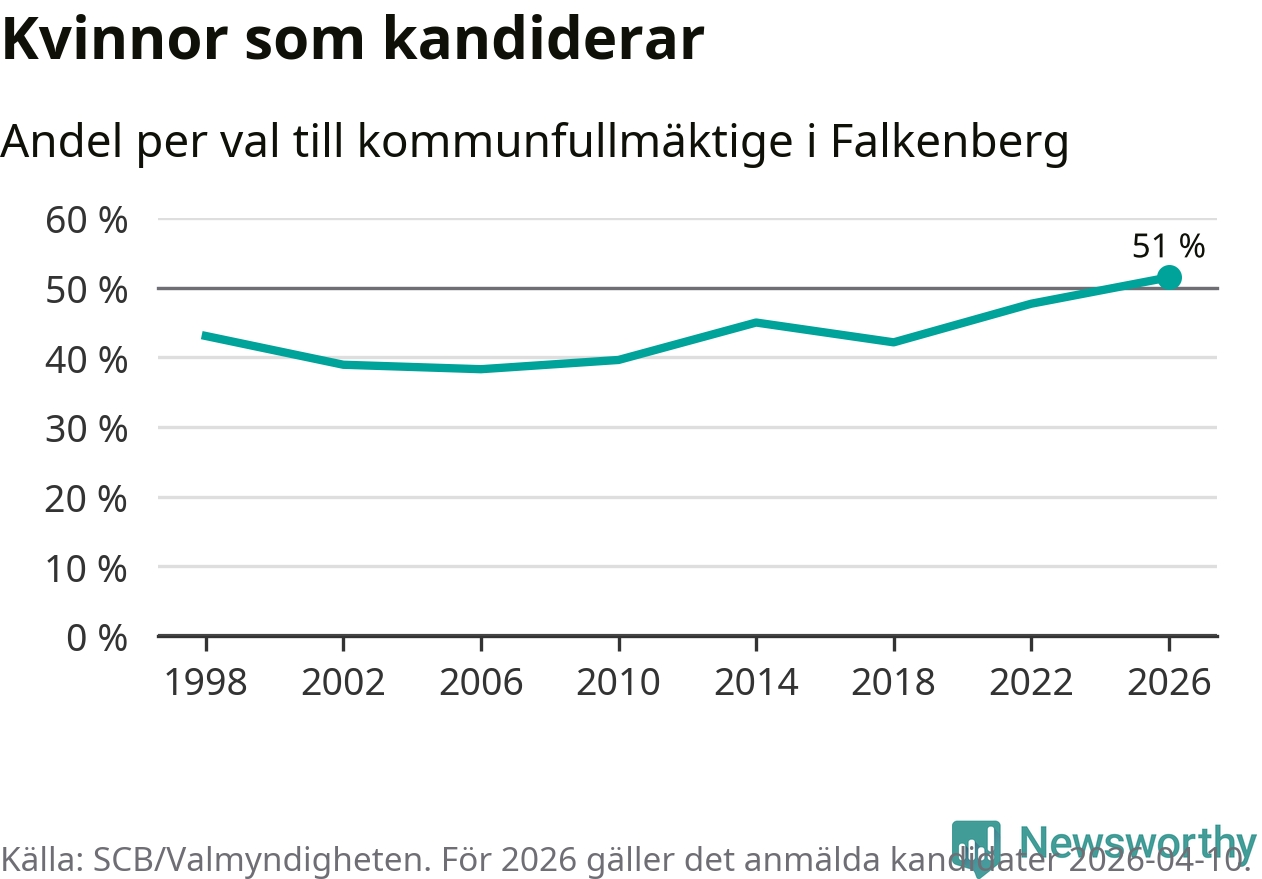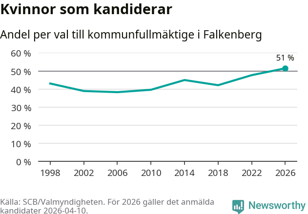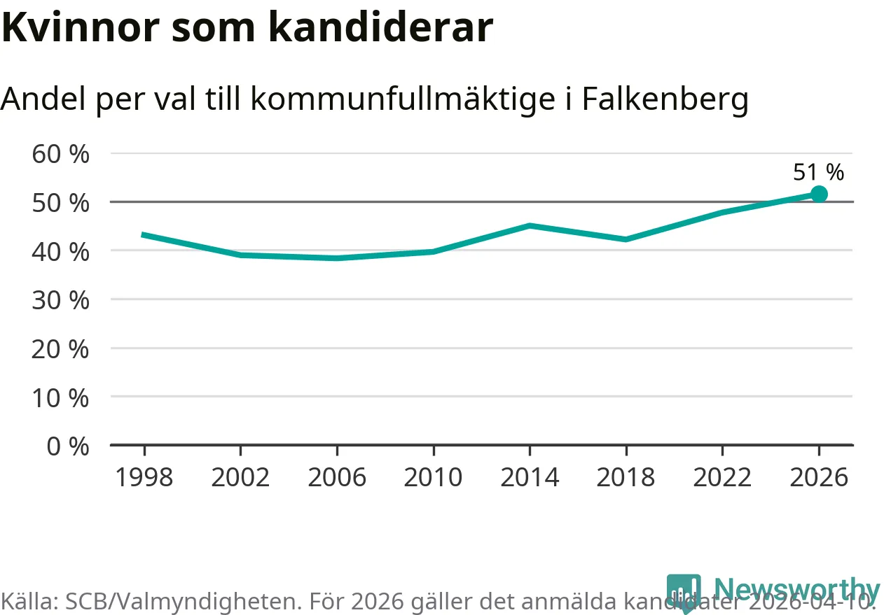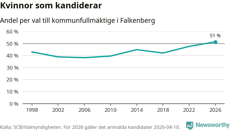 Kvinnorna utgör 51 procent av de hittills anmälda kandidaterna, vilket är den högsta andelen på listorna till kommunfullmäktige i Falkenberg sedan åtminstone valet 1998. Falkenberg är en av 26 kommuner i landet där kvinnorna utgör hälften eller mer av kandidaterna på listorna.