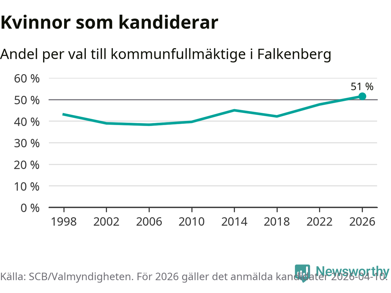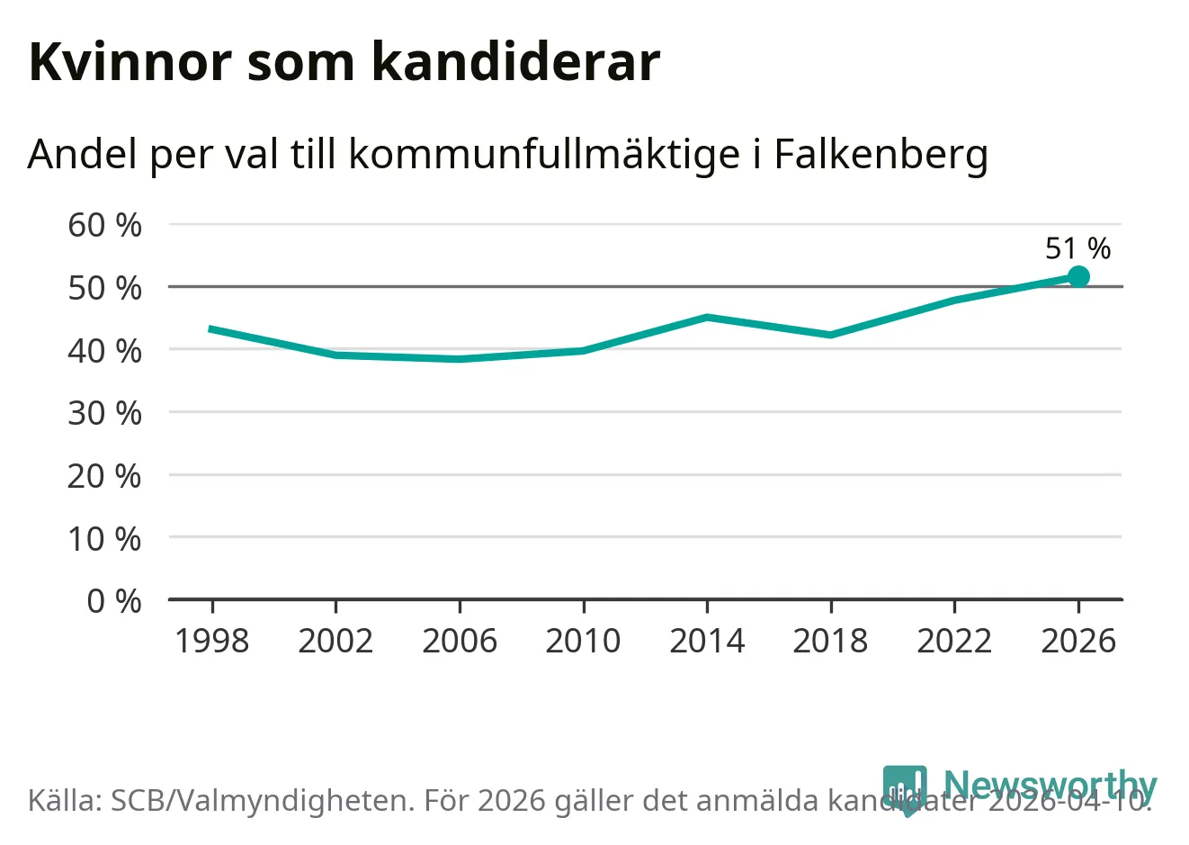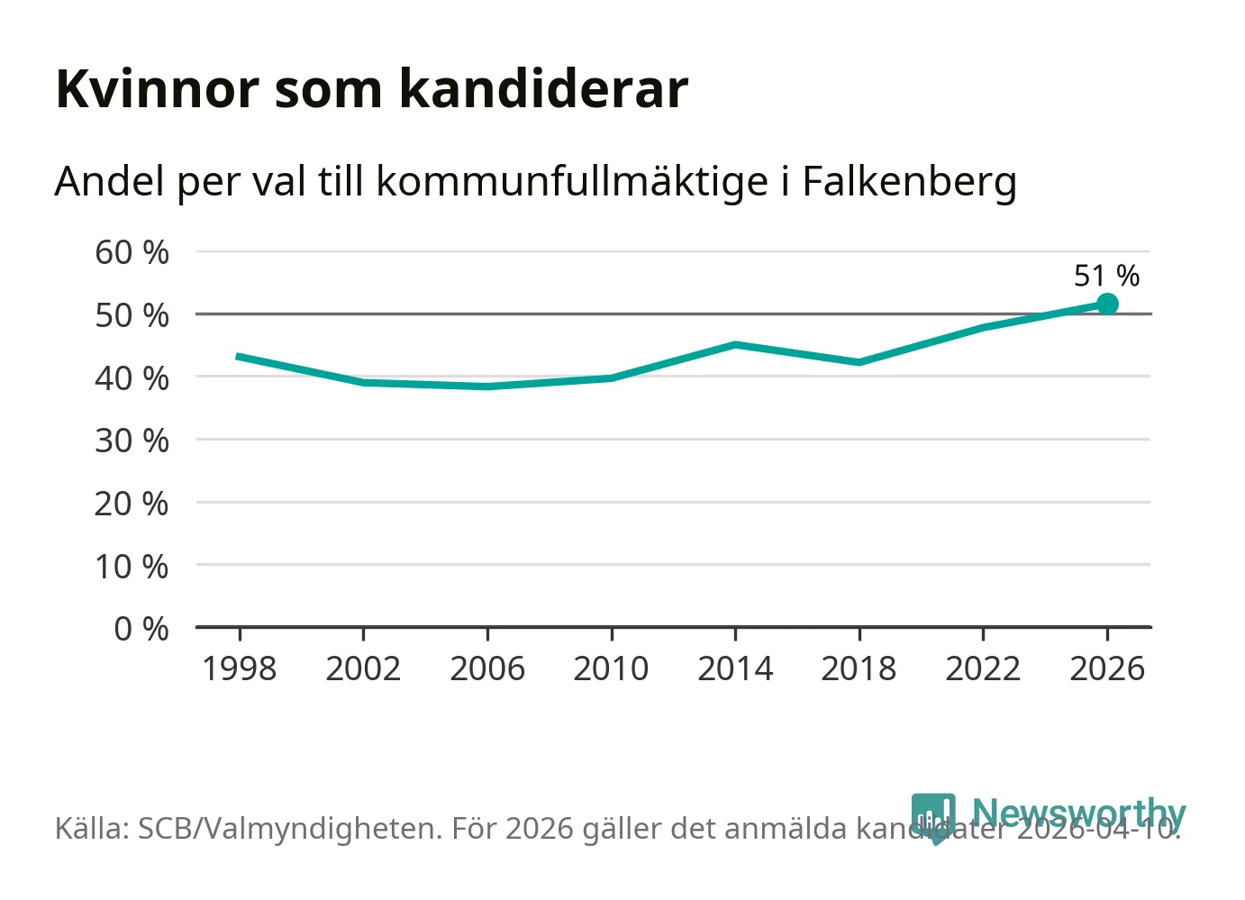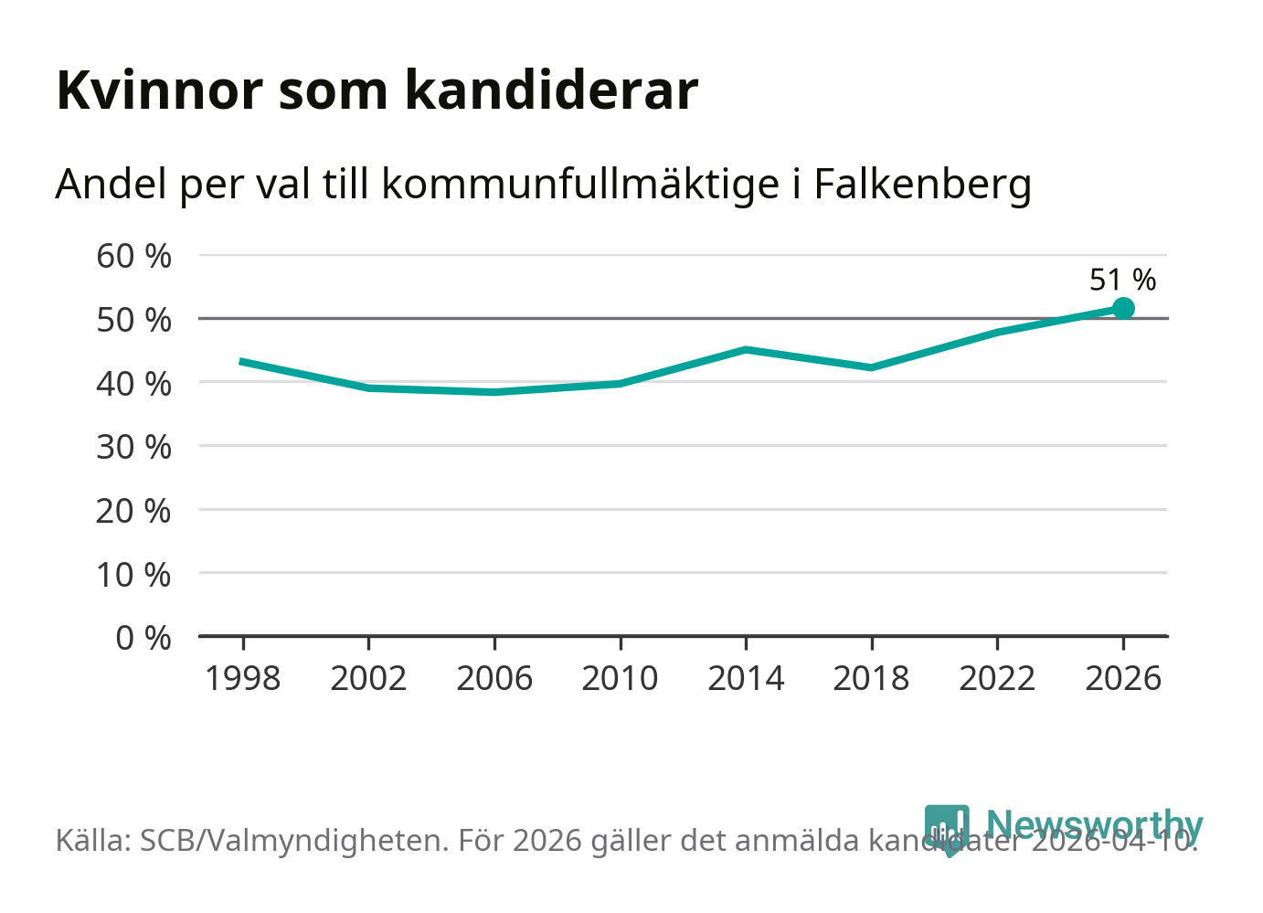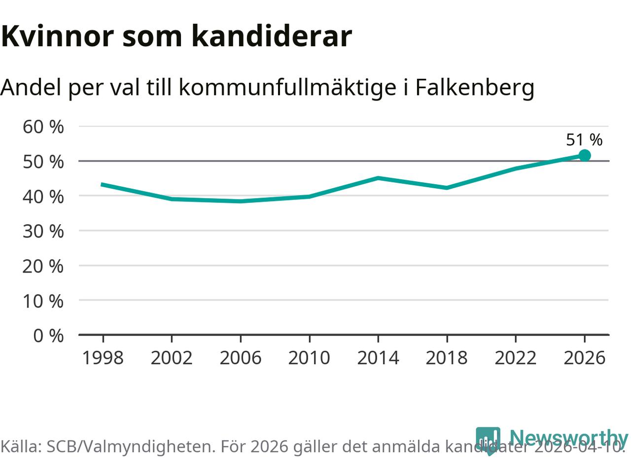 Kvinnorna utgör 51 procent av de hittills anmälda kandidaterna, vilket är den högsta andelen på listorna till kommunfullmäktige i Falkenberg sedan åtminstone valet 1998. Falkenberg är en av 26 kommuner i landet där kvinnorna utgör hälften eller mer av kandidaterna på listorna.