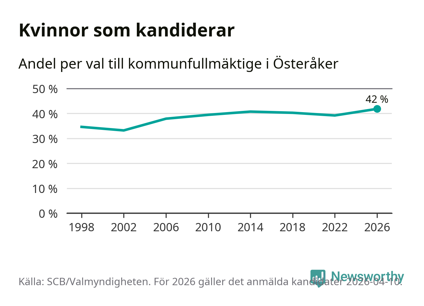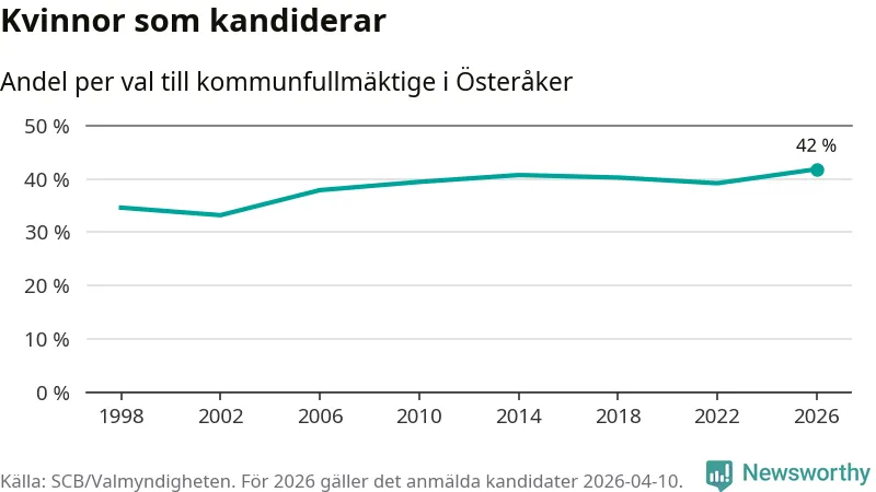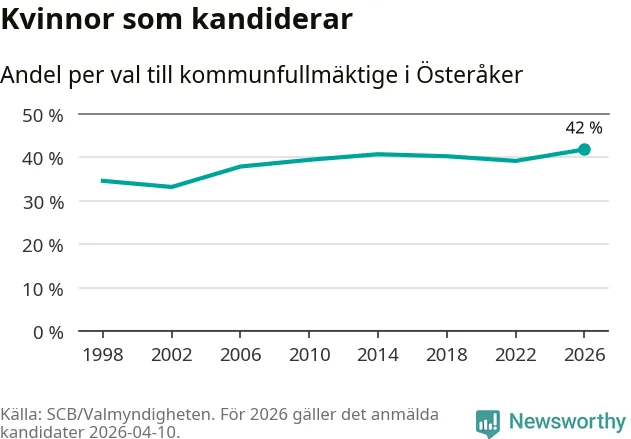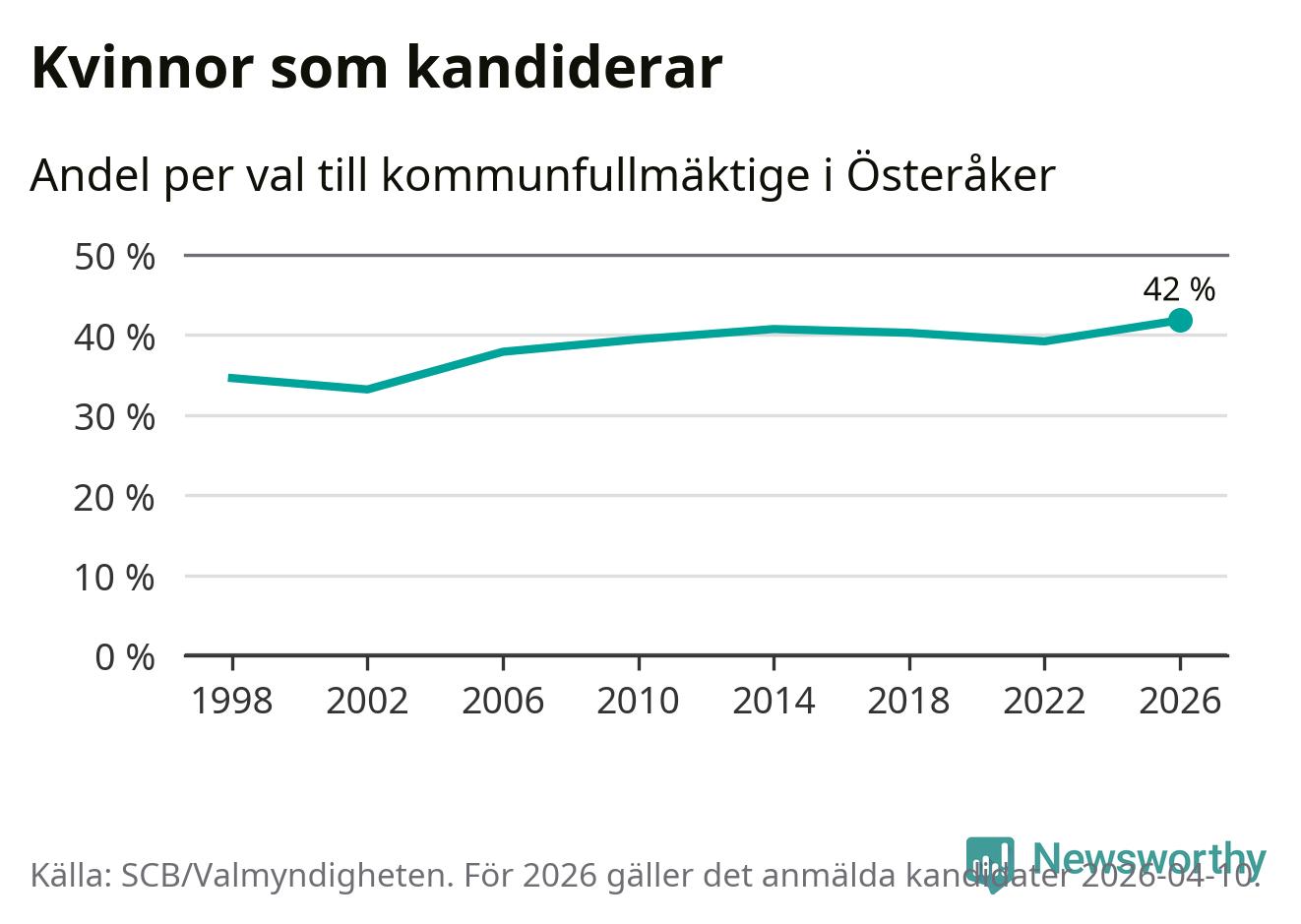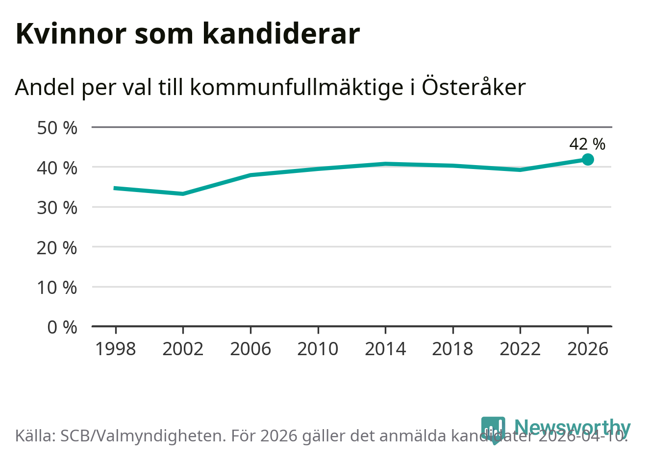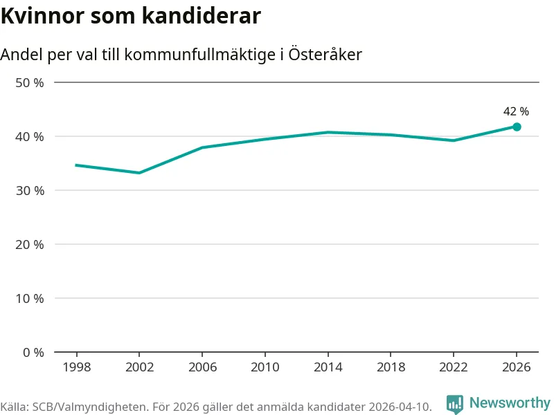 Kvinnorna utgör 42 procent av de hittills anmälda kandidaterna, vilket är den högsta andelen på listorna till kommunfullmäktige i Österåker sedan åtminstone valet 1998. Österåker är en av 264 kommuner i landet där männen utgör en majoritet av kandidaterna på listorna.