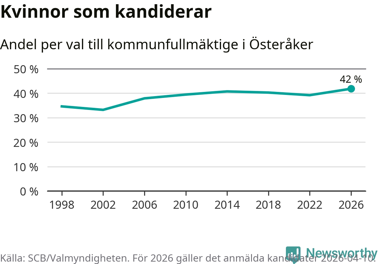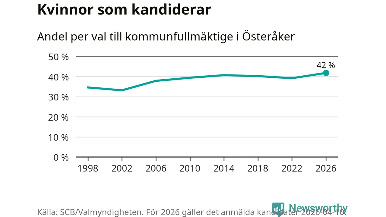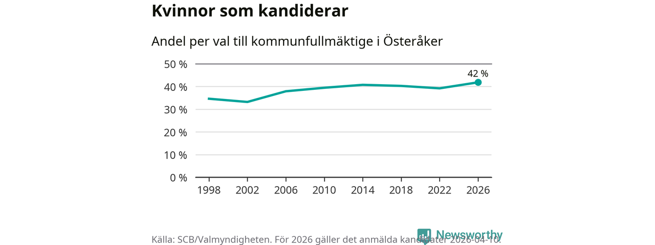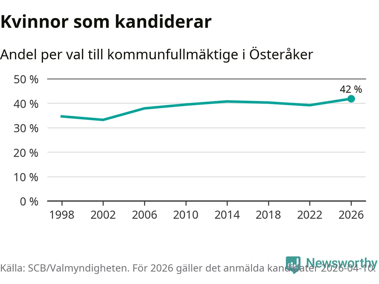 Kvinnorna utgör 42 procent av de hittills anmälda kandidaterna, vilket är den högsta andelen på listorna till kommunfullmäktige i Österåker sedan åtminstone valet 1998. Österåker är en av 264 kommuner i landet där männen utgör en majoritet av kandidaterna på listorna.