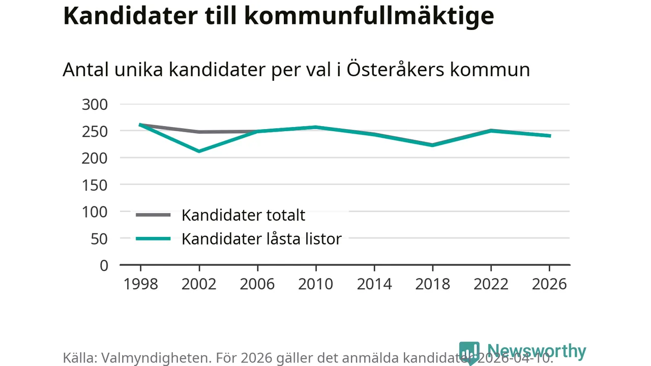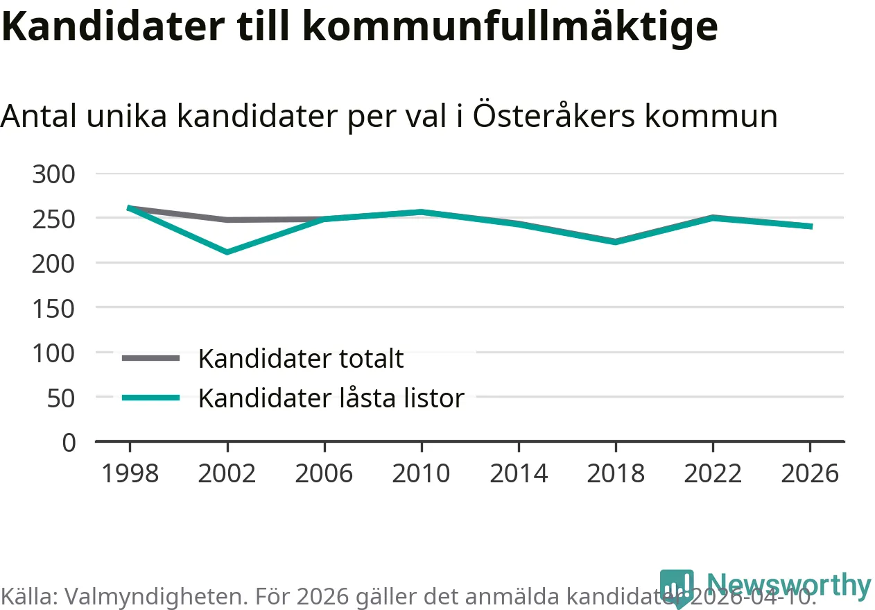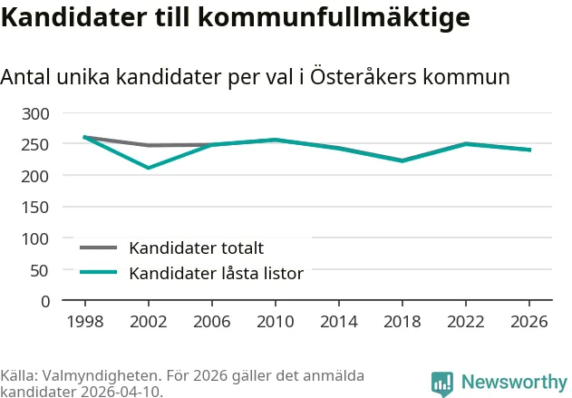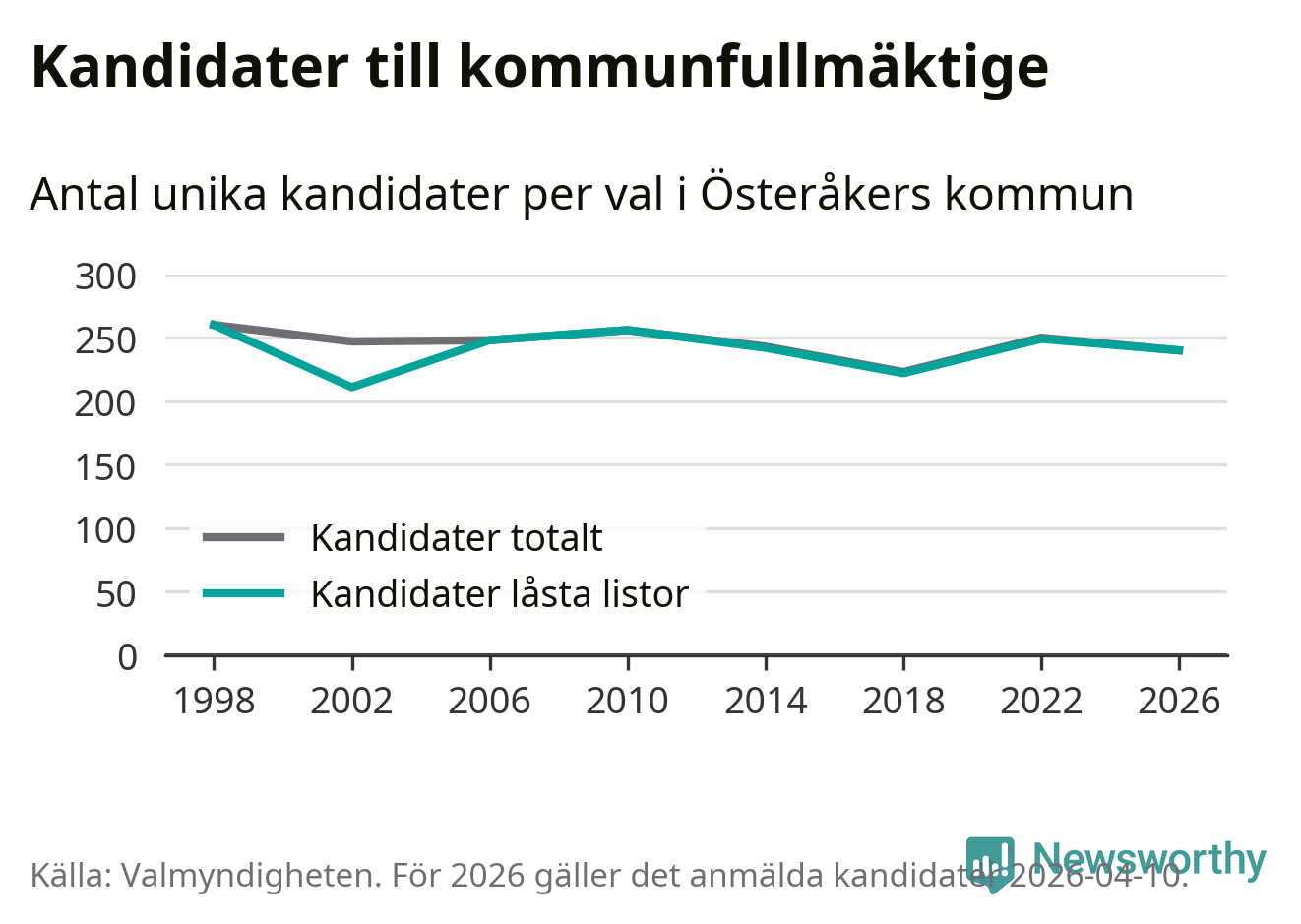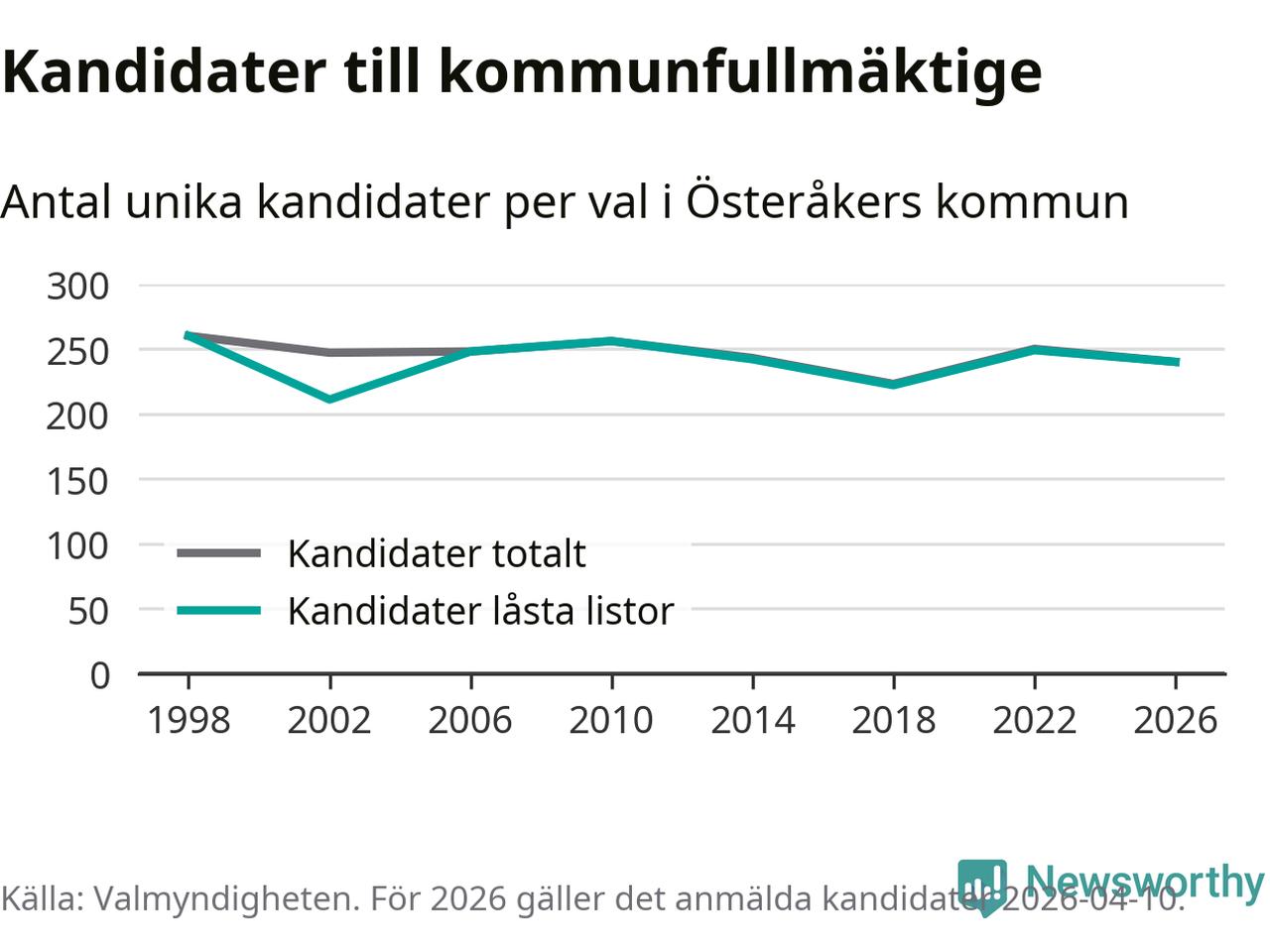 På torsdagen var det deadline för partier med låsta listor att registrera sina kandidater inför höstens val. Till valet till kommunfullmäktige i Österåker är 240 kandidater anmälda på sådana listor, vilket är nio färre än i valet 2022.