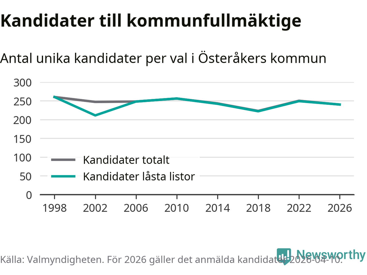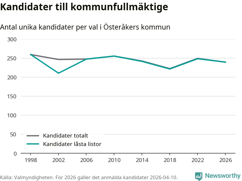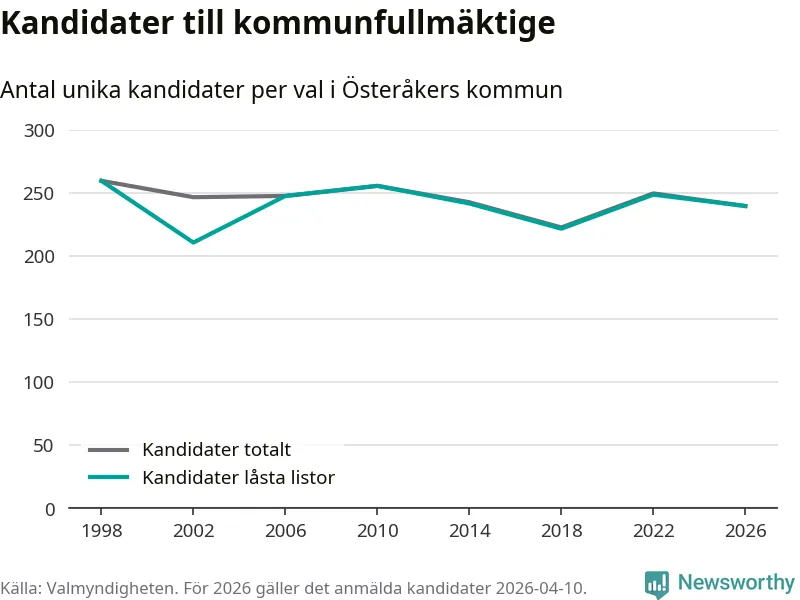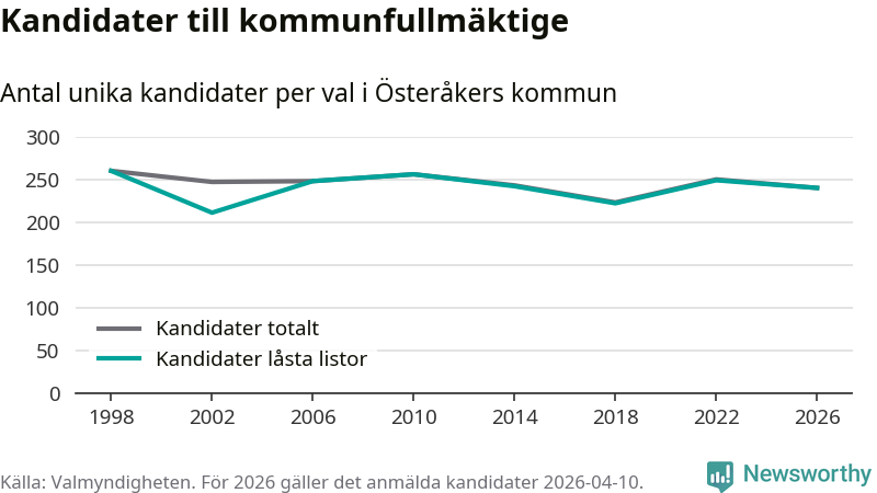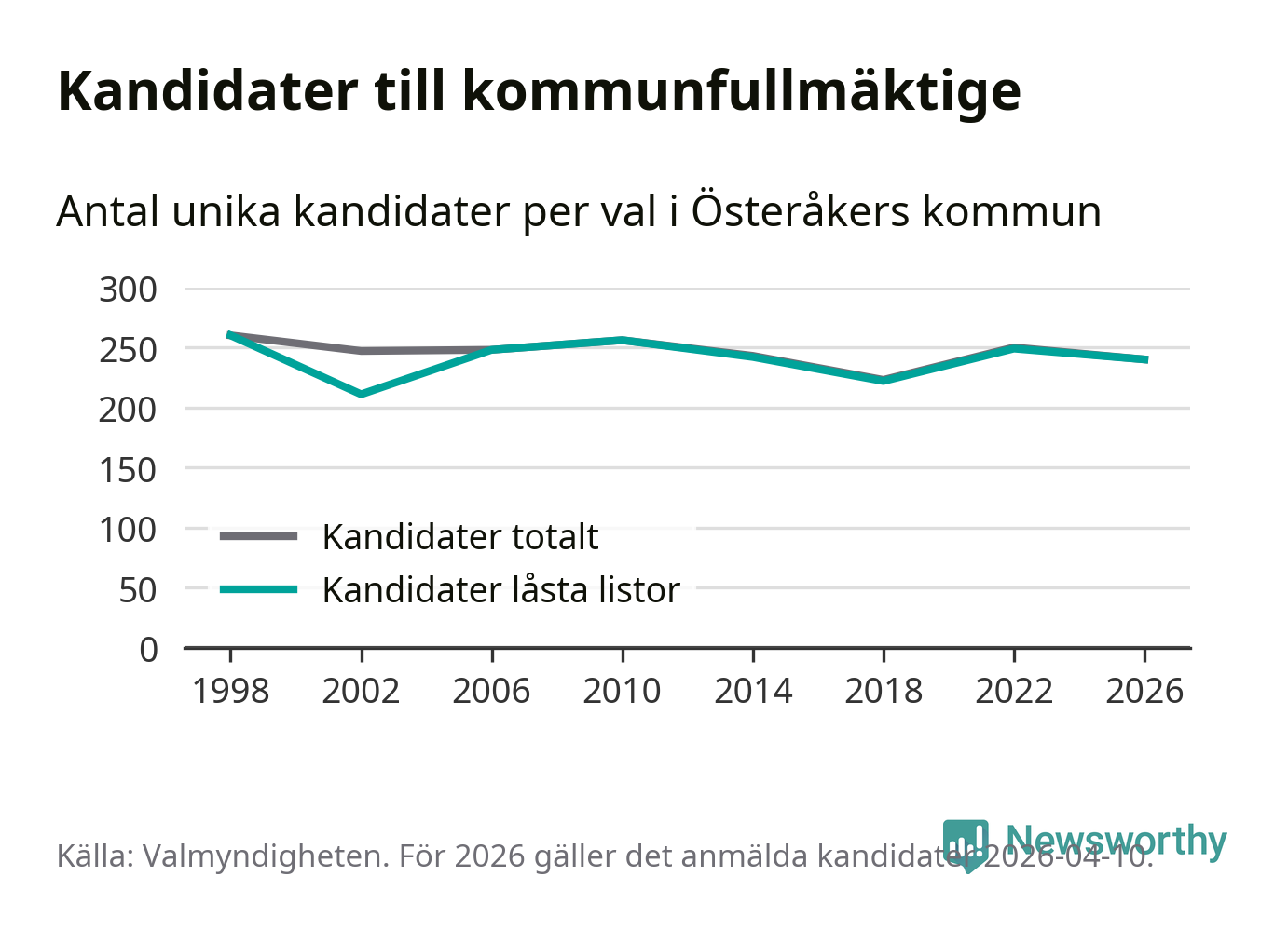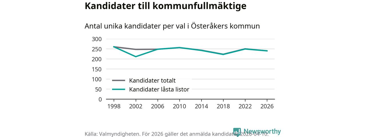 På torsdagen var det deadline för partier med låsta listor att registrera sina kandidater inför höstens val. Till valet till kommunfullmäktige i Österåker är 240 kandidater anmälda på sådana listor, vilket är nio färre än i valet 2022.