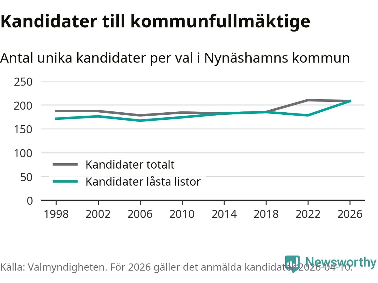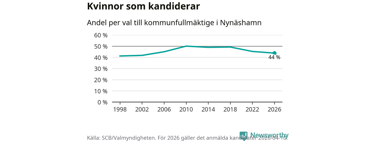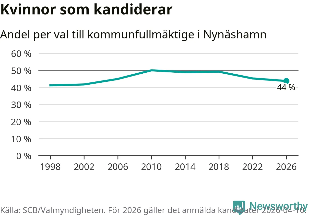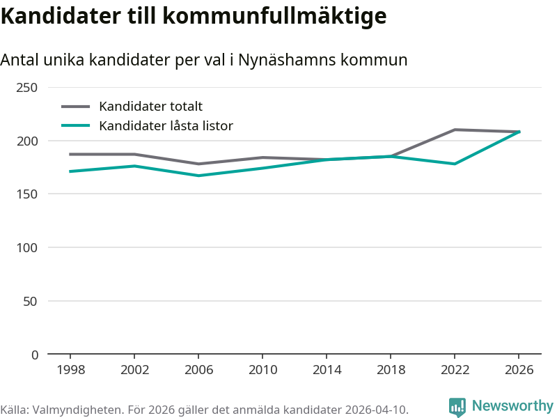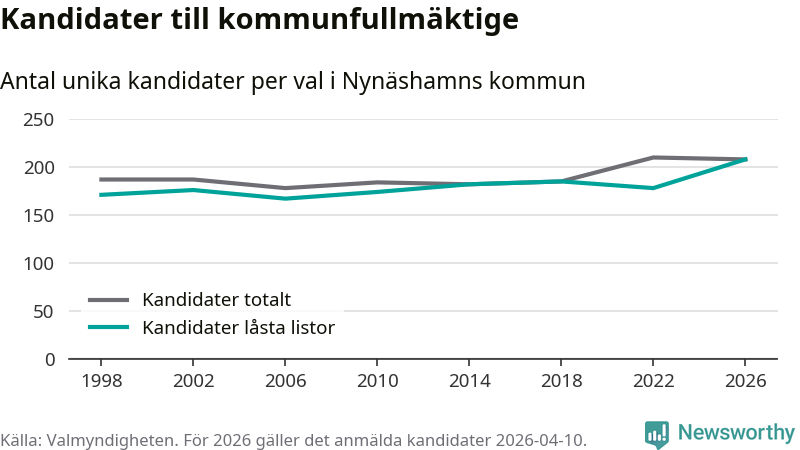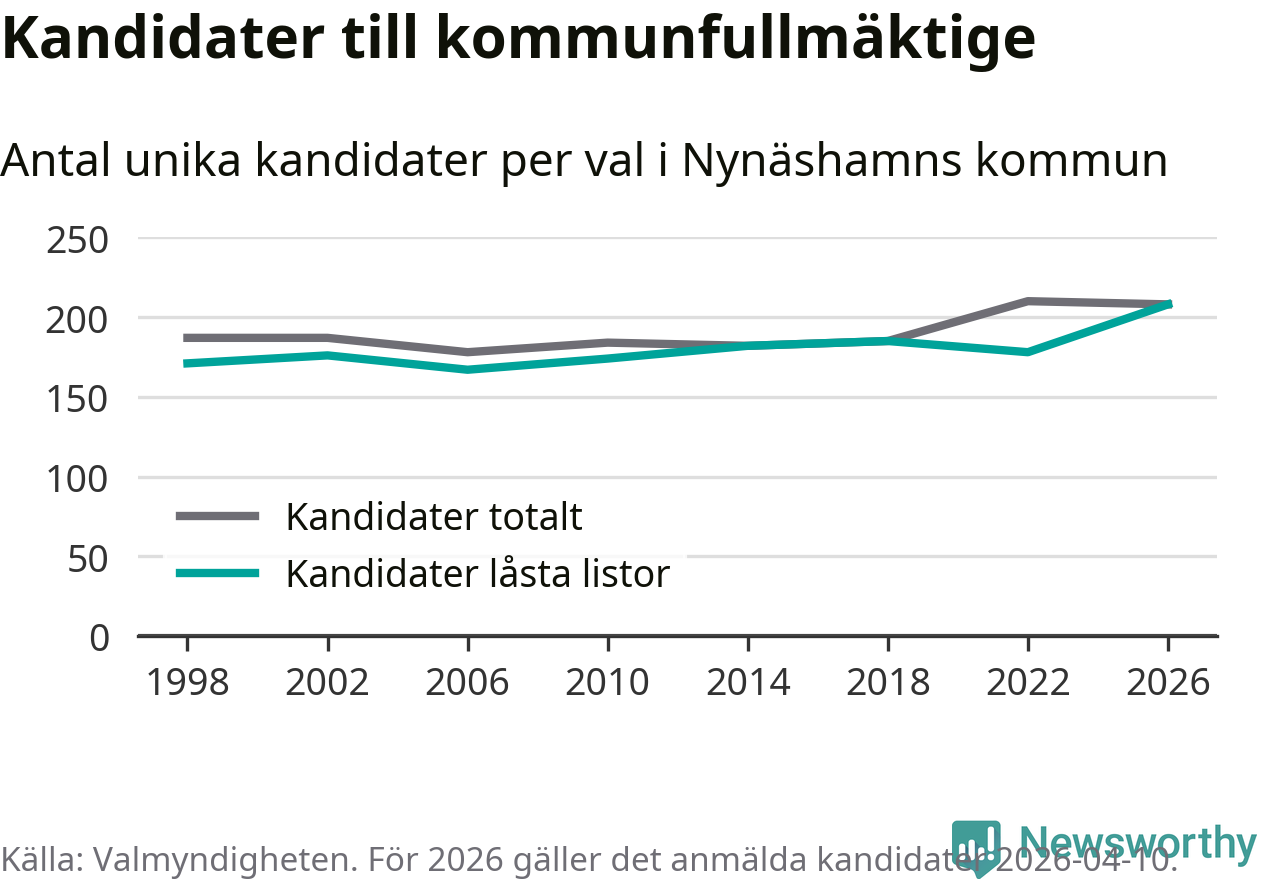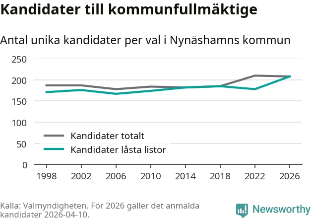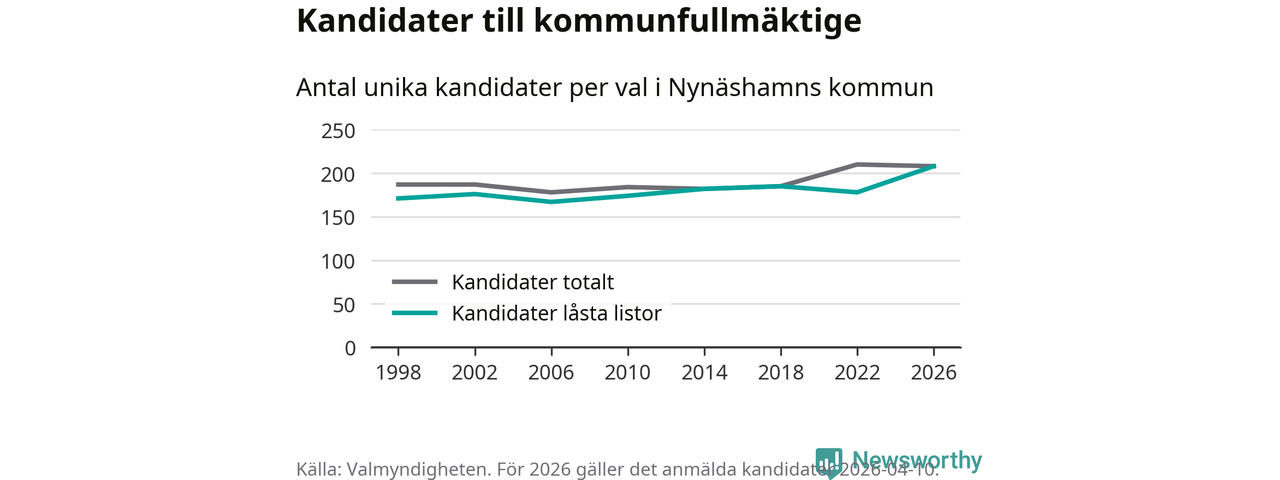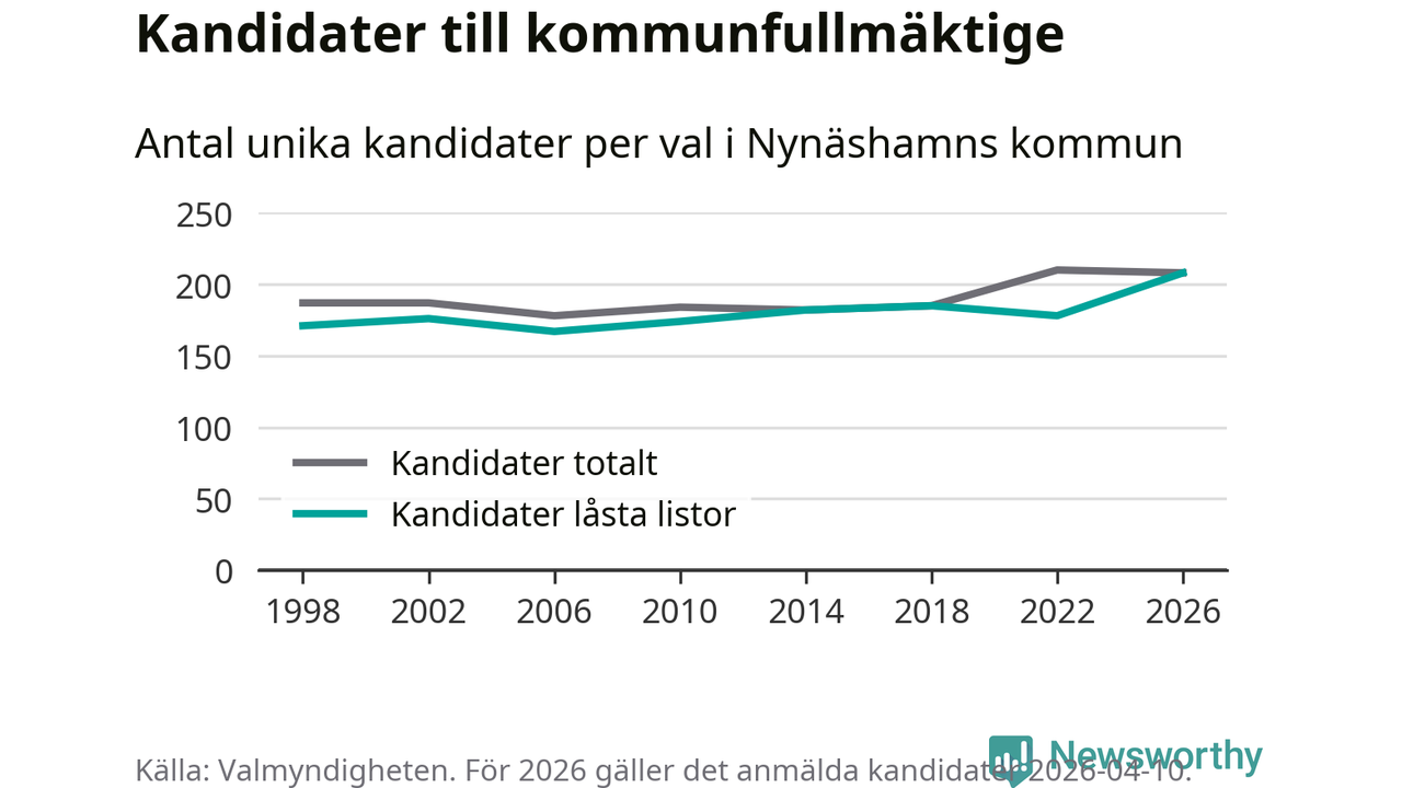 På torsdagen var det deadline för partier med låsta listor att registrera sina kandidater inför höstens val. Till valet till kommunfullmäktige i Nynäshamn är 208 kandidater anmälda på sådana listor, vilket är 30 fler än i valet 2022. Det är den högsta siffran sedan åtminstone valet 1998, vilket är så långt tillbaka som vi har statistik för.