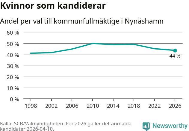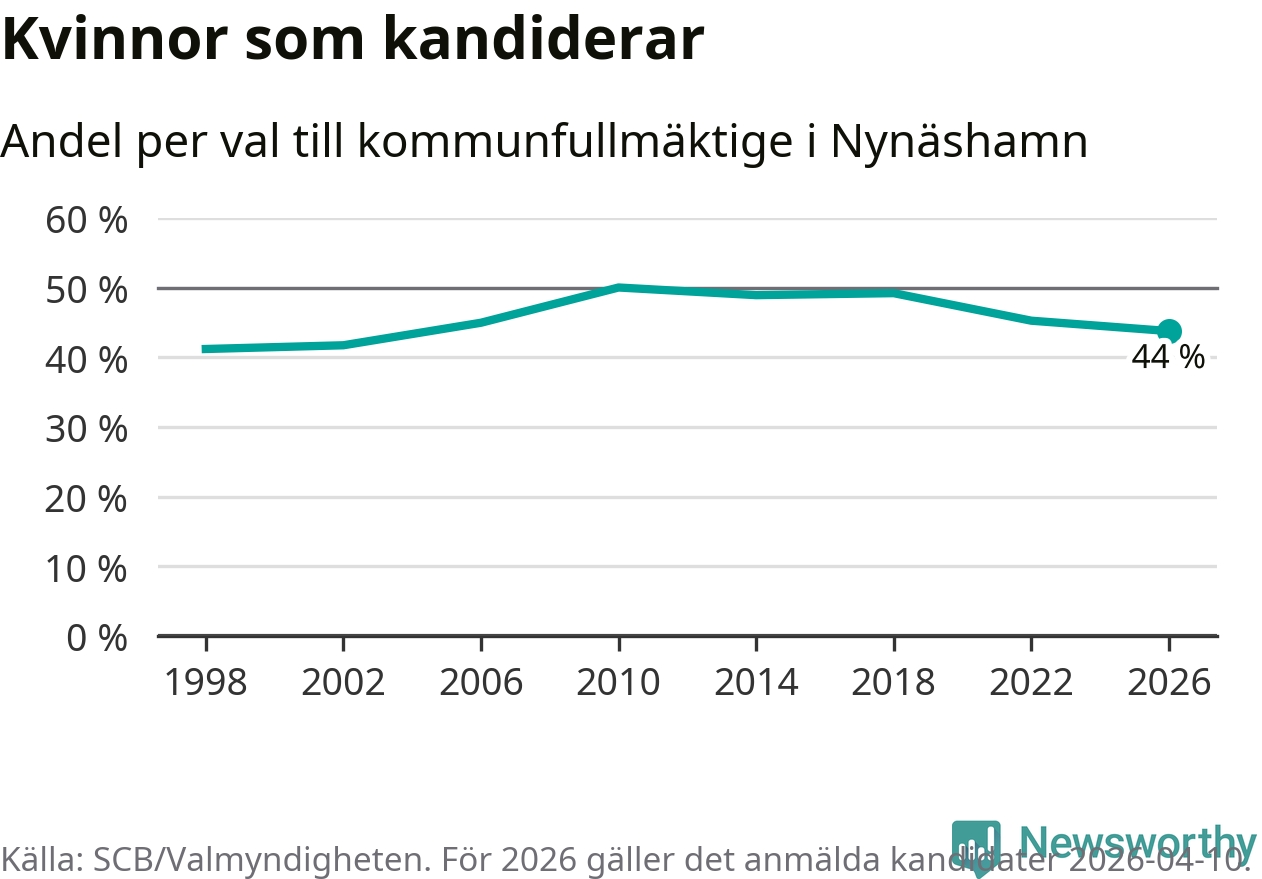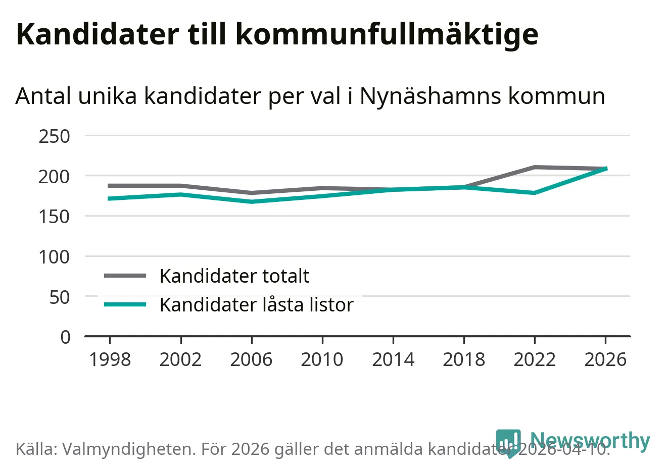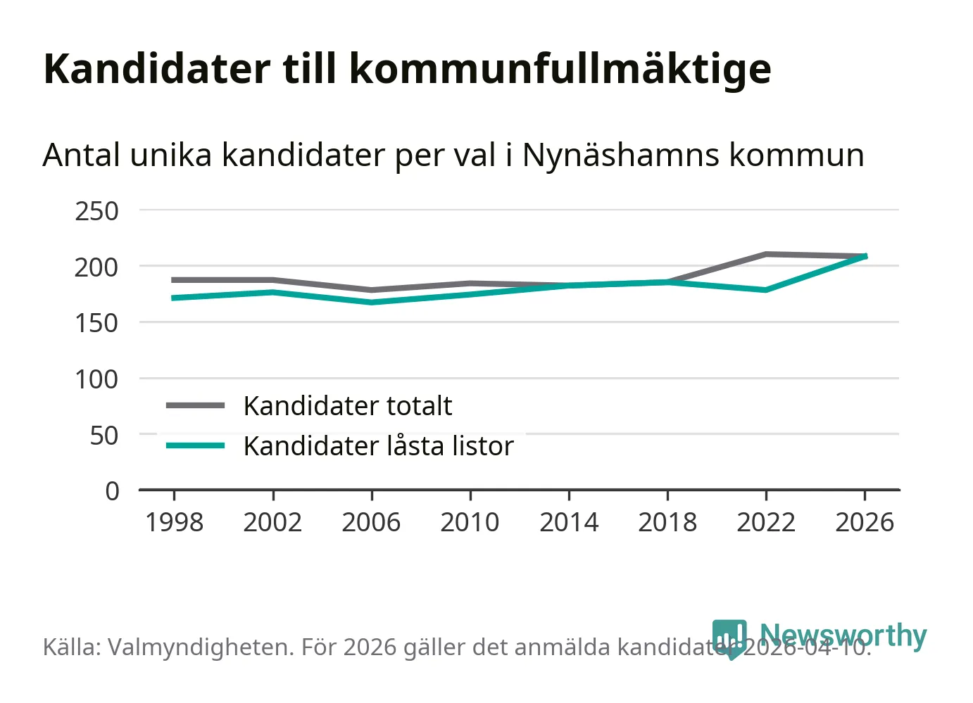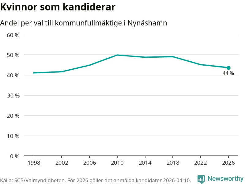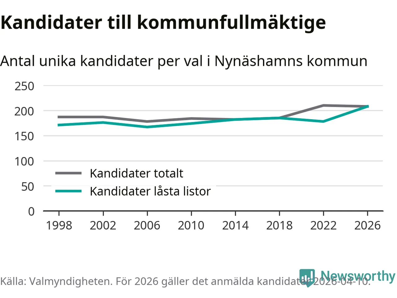 På torsdagen var det deadline för partier med låsta listor att registrera sina kandidater inför höstens val. Till valet till kommunfullmäktige i Nynäshamn är 208 kandidater anmälda på sådana listor, vilket är 30 fler än i valet 2022. Det är den högsta siffran sedan åtminstone valet 1998, vilket är så långt tillbaka som vi har statistik för.