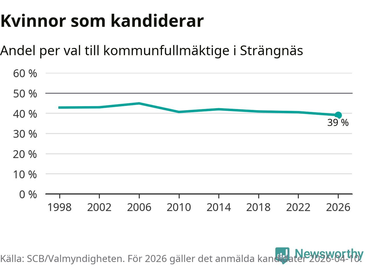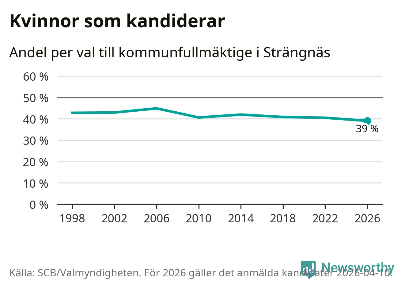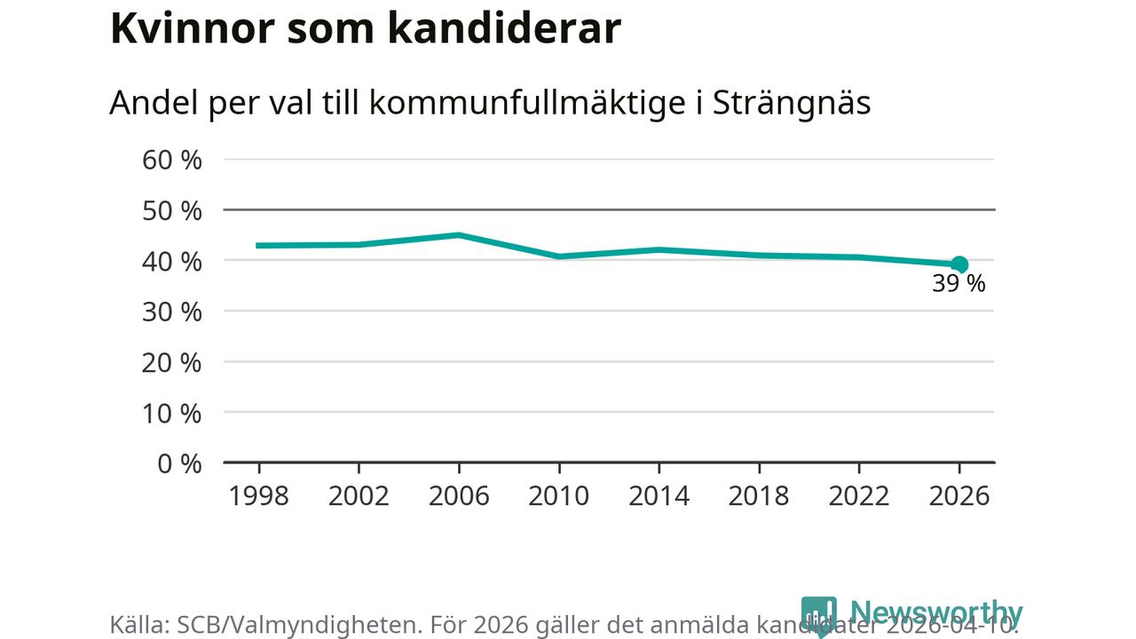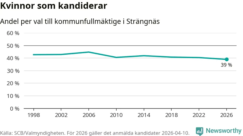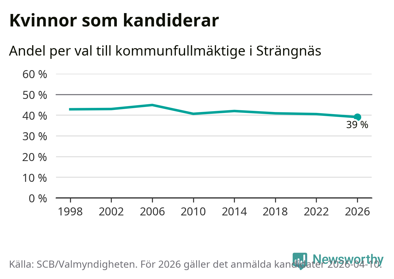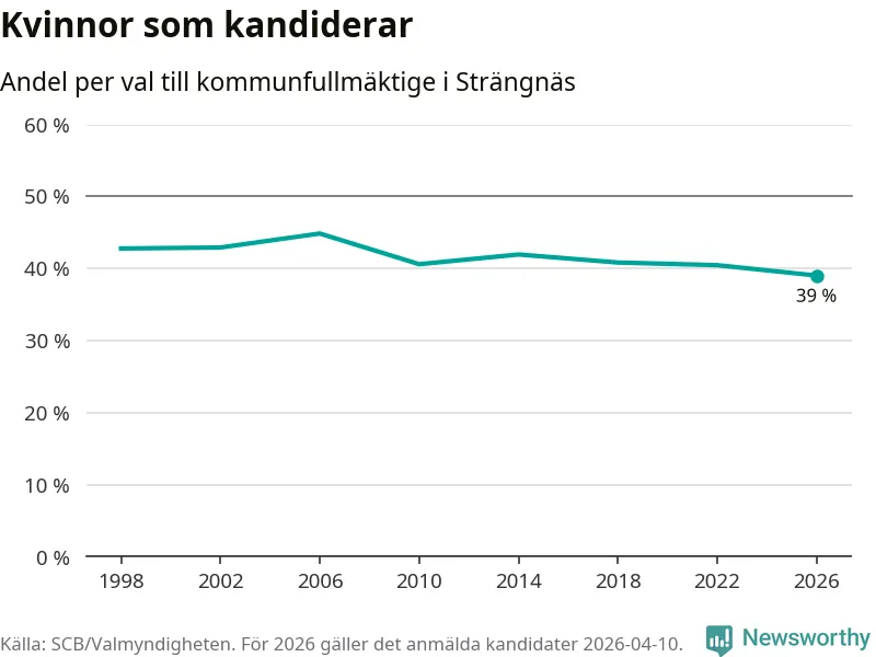 Kvinnorna utgör 39 procent av de hittills anmälda kandidaterna, vilket är den lägsta andelen på listorna till kommunfullmäktige i Strängnäs sedan åtminstone valet 1998. Andelen kvinnor har minskat i Strängnäs under de senaste två valen och minskningen ser alltså ut att forsätta i år. Strängnäs är en av 264 kommuner i landet där männen utgör en majoritet av kandidaterna på listorna.